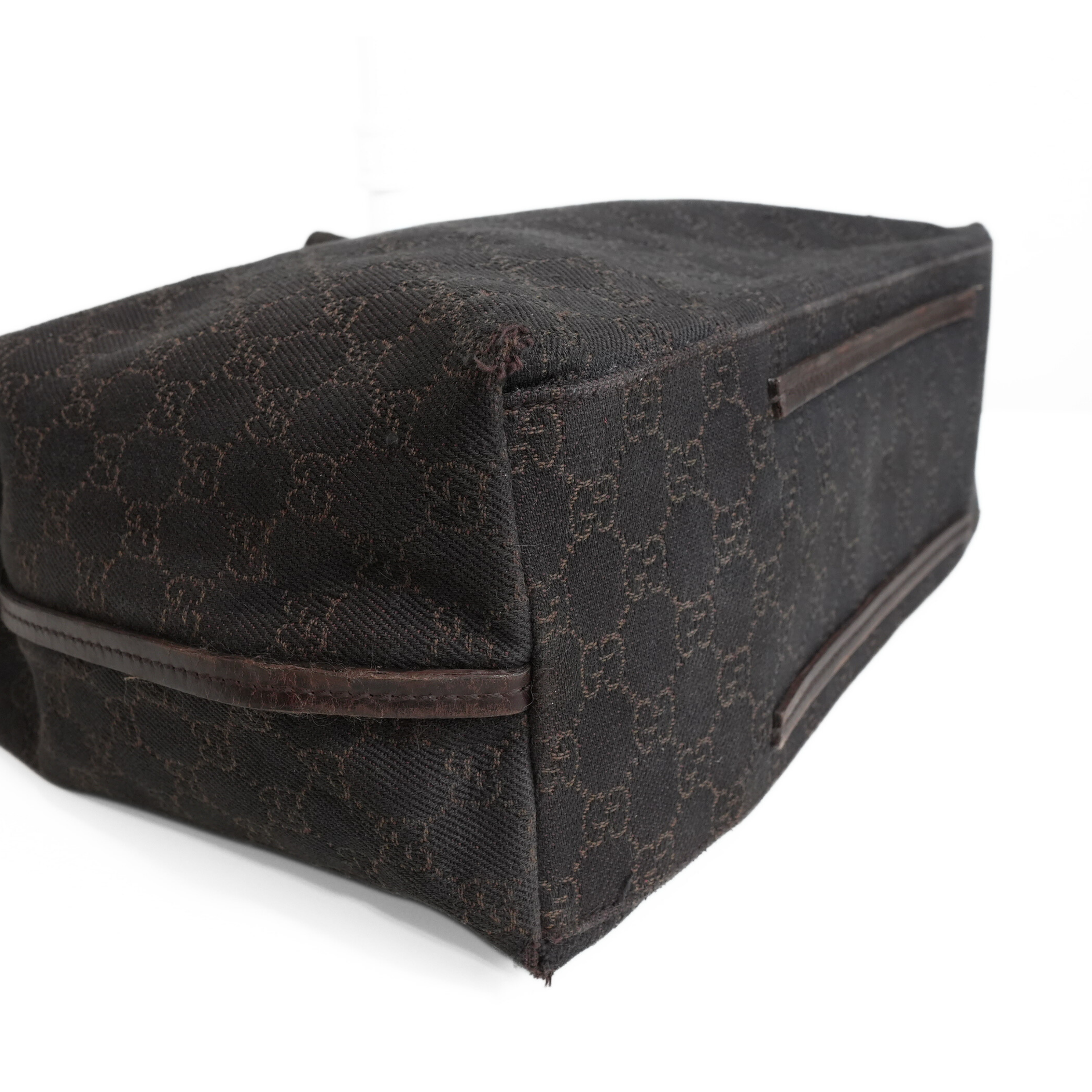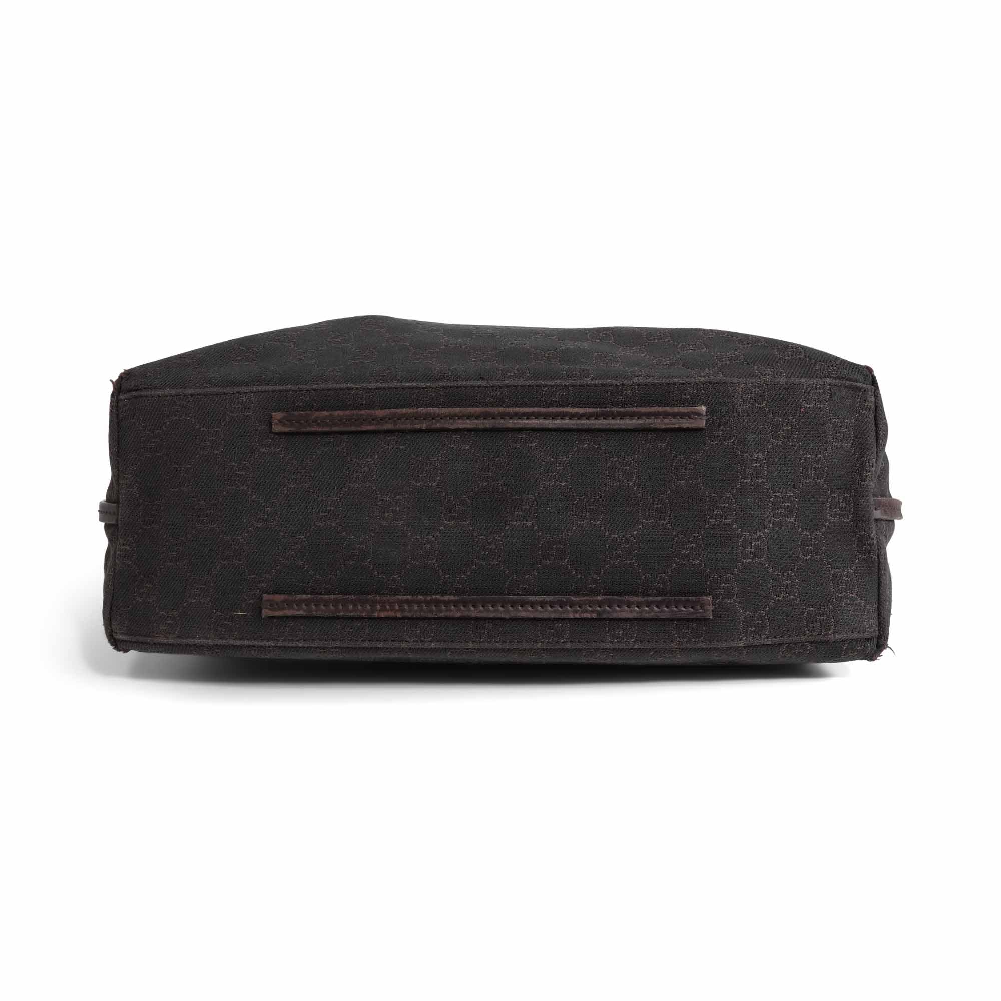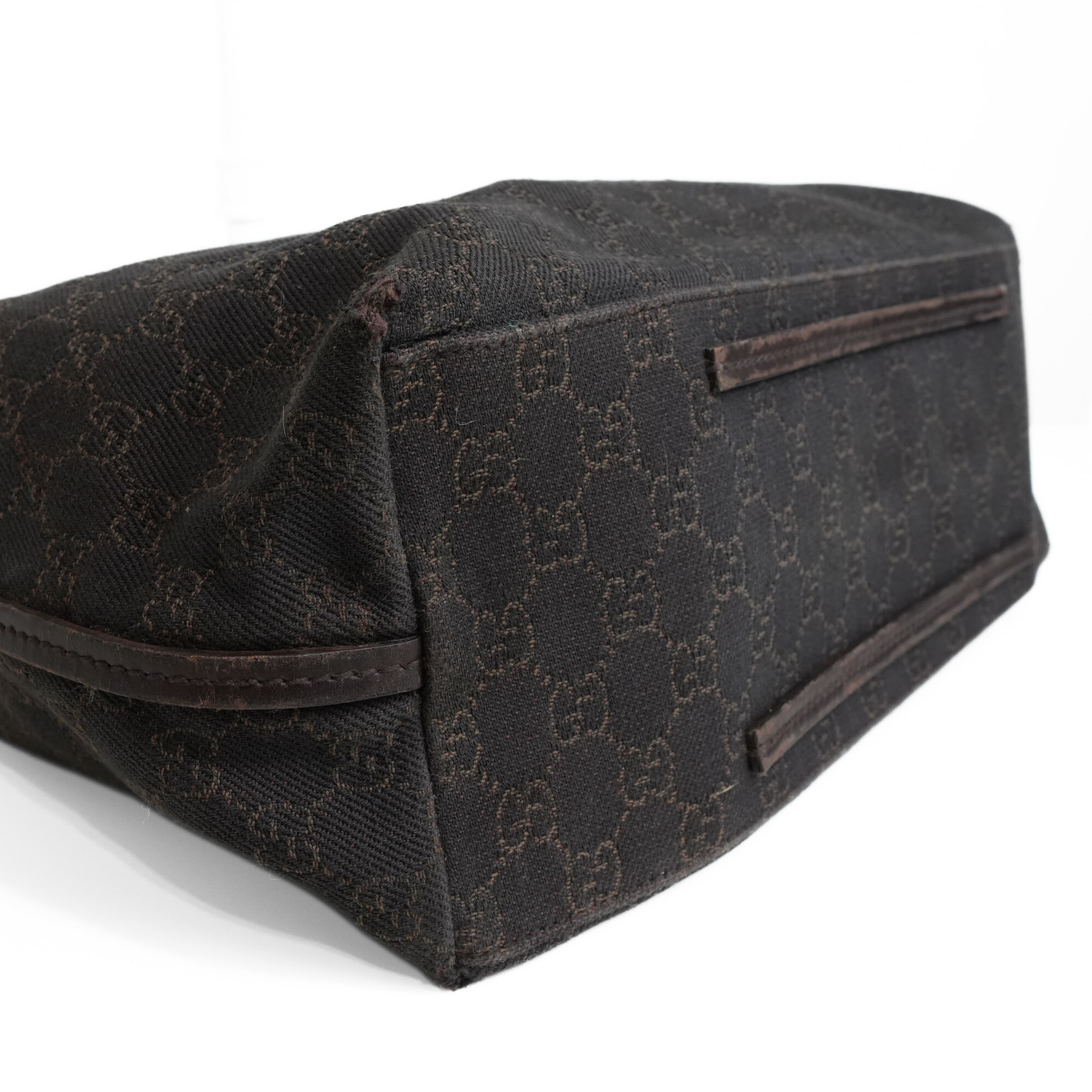 Gucci hobo tote bag in brown 'GG' monogram canvas with rolled leather handles, brown leather piping and magnetic snap closure. Interior features brown canvas lining and zip pocket.