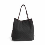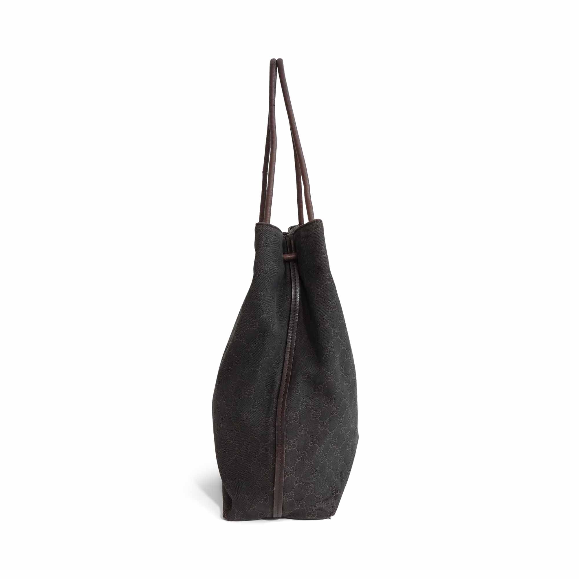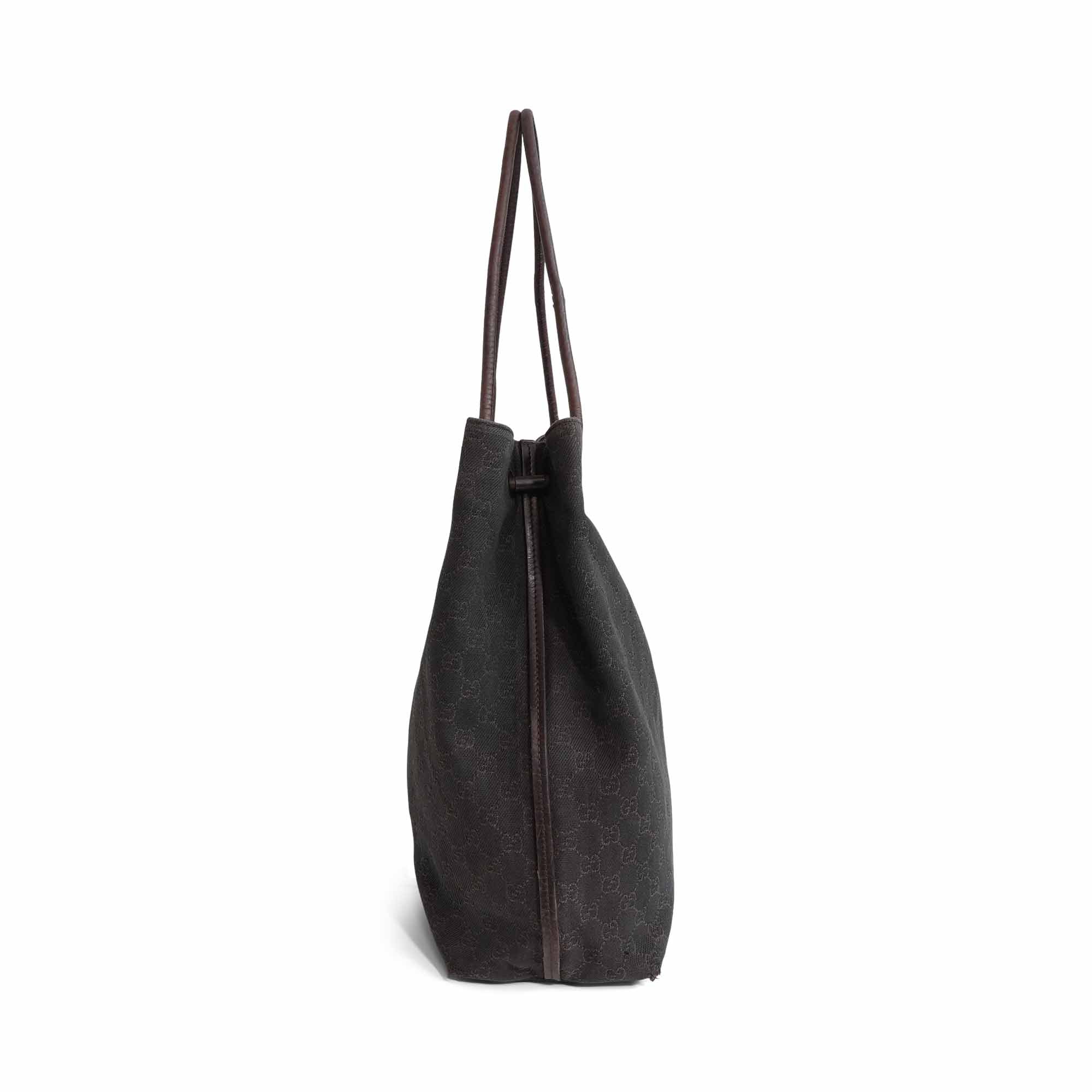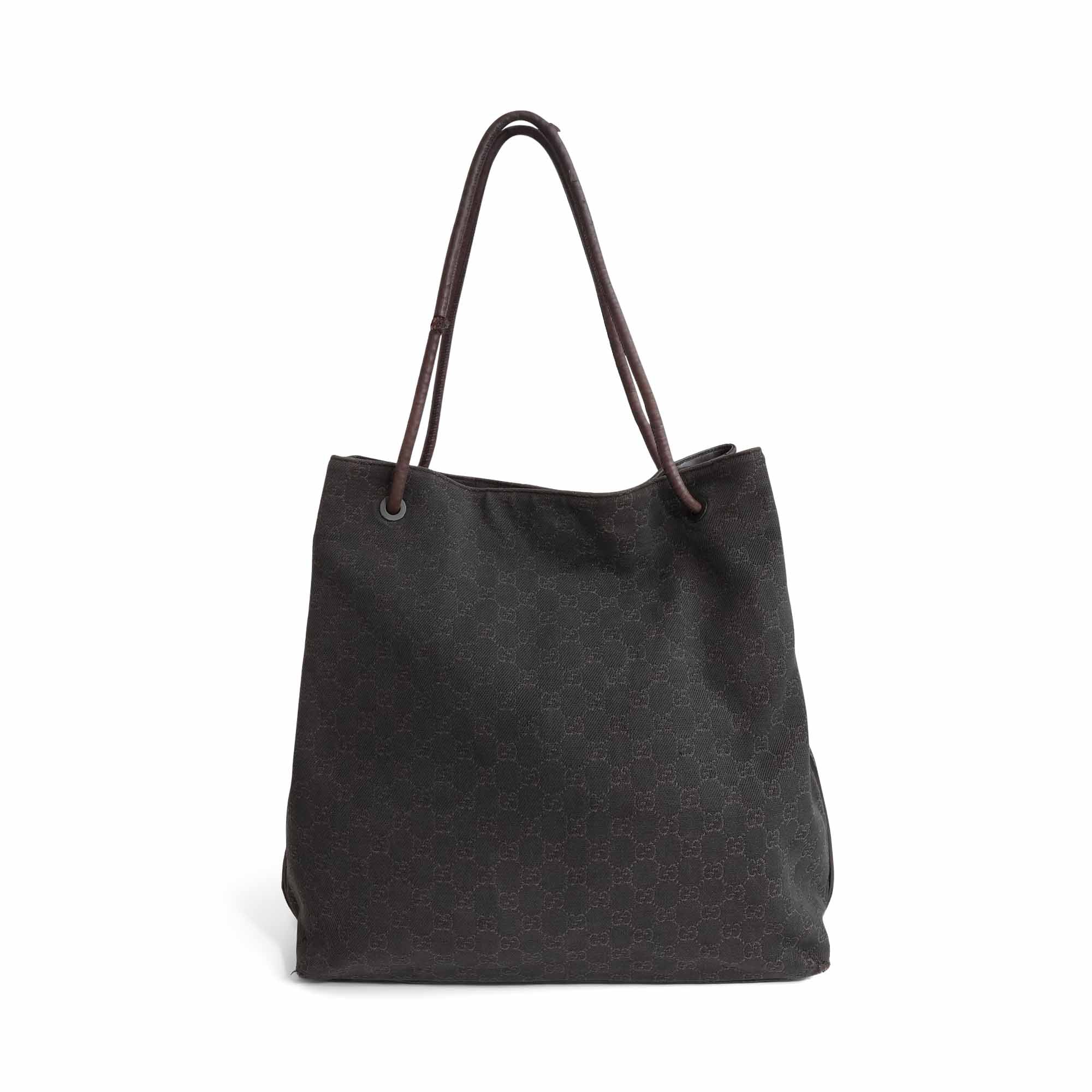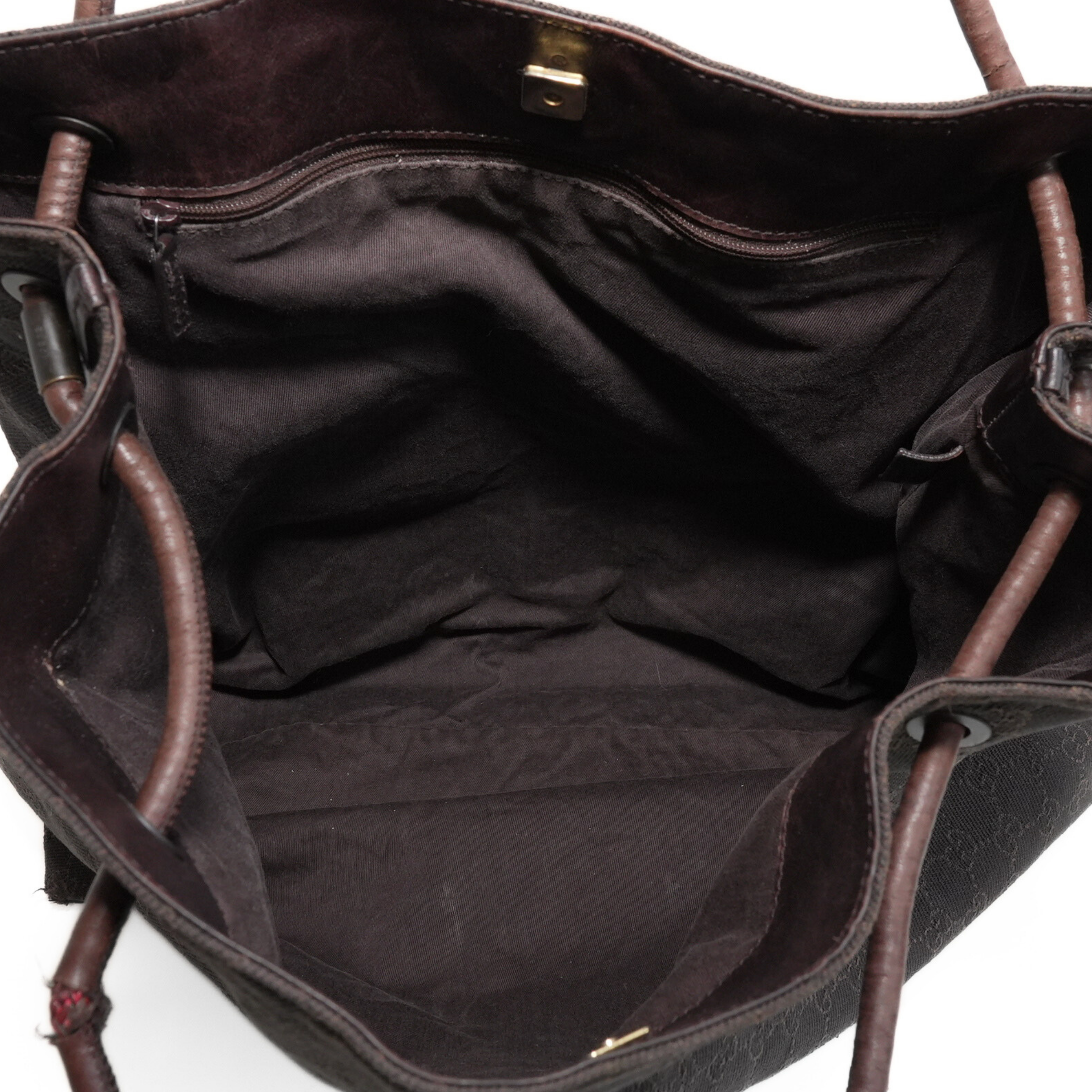 Gucci hobo tote bag in brown 'GG' monogram canvas with rolled leather handles, brown leather piping and magnetic snap closure. Interior features brown canvas lining and zip pocket.