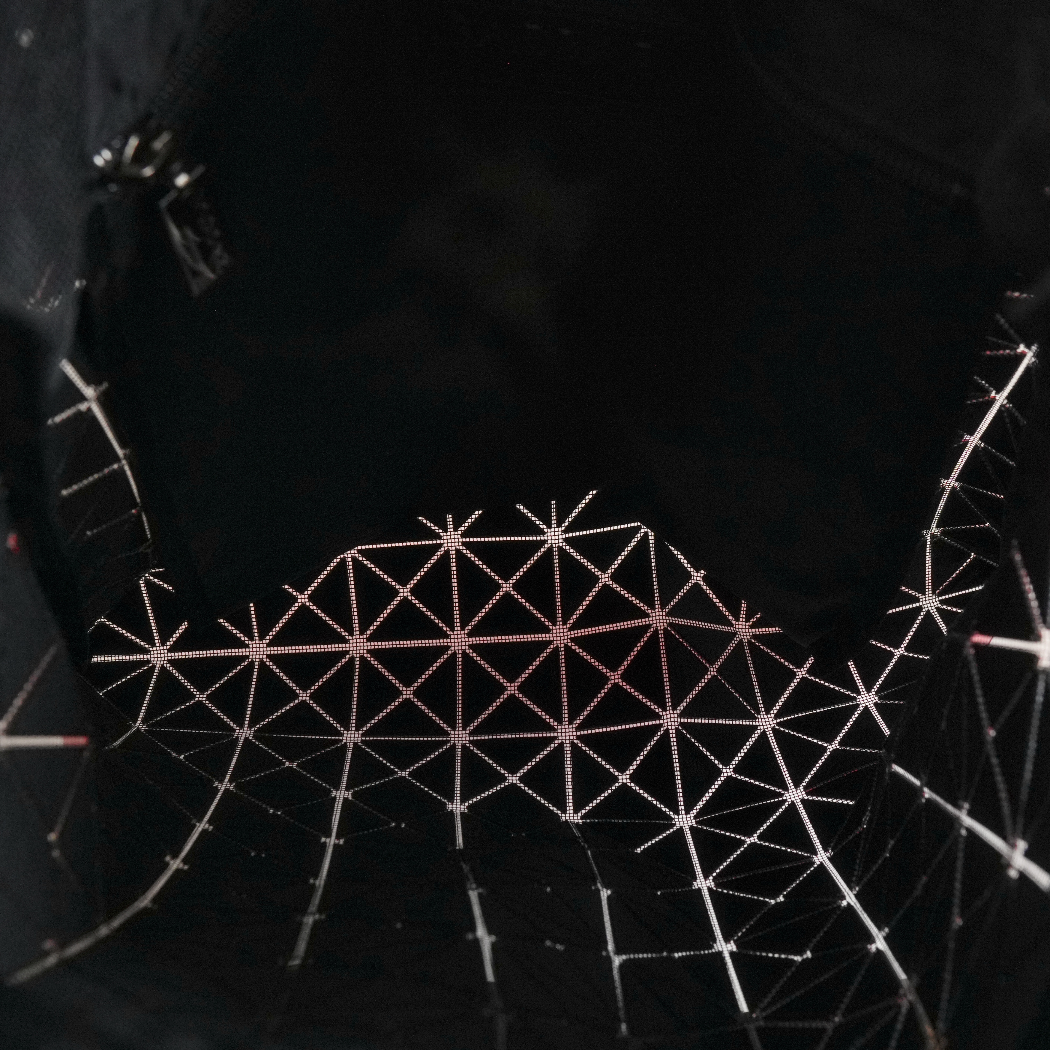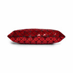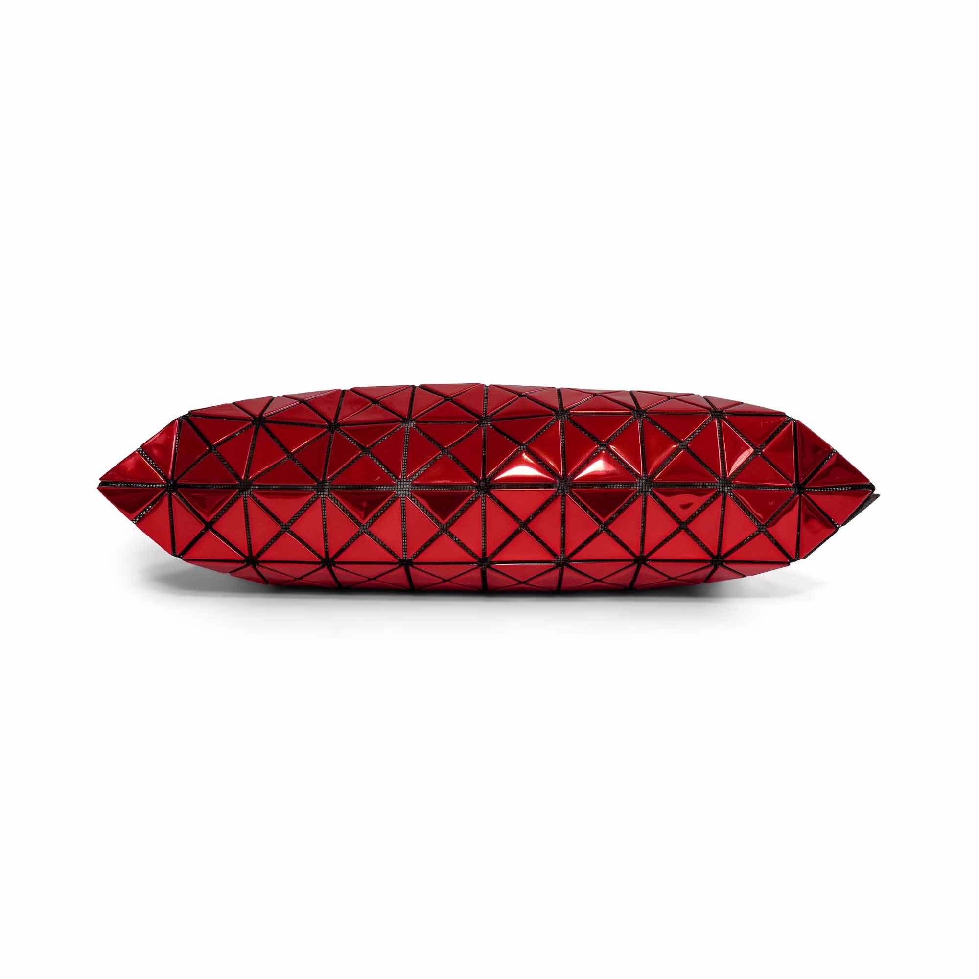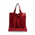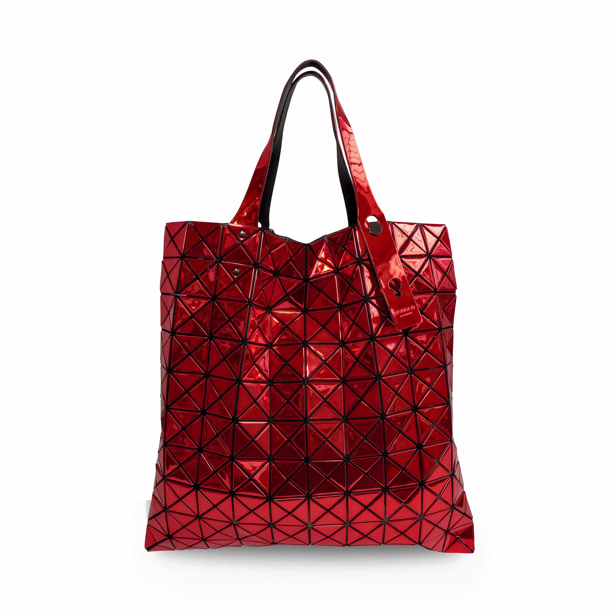 Issey Miyake Bao Bao 'Prism' tote bag in metallic red articulated triangles with adjustable handles. Features a black mesh lining with flat zip pocket.