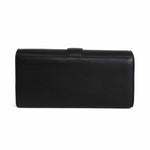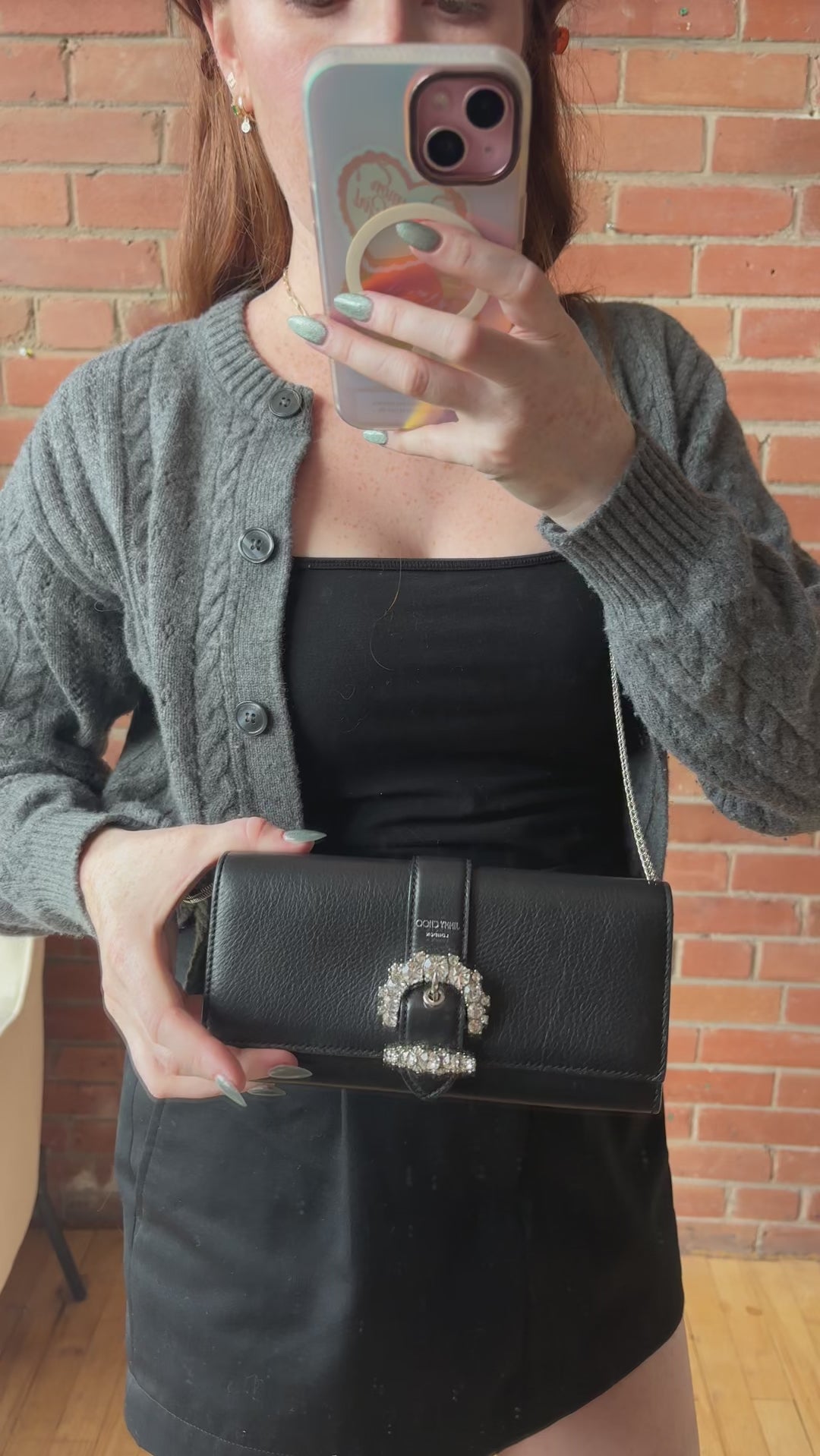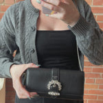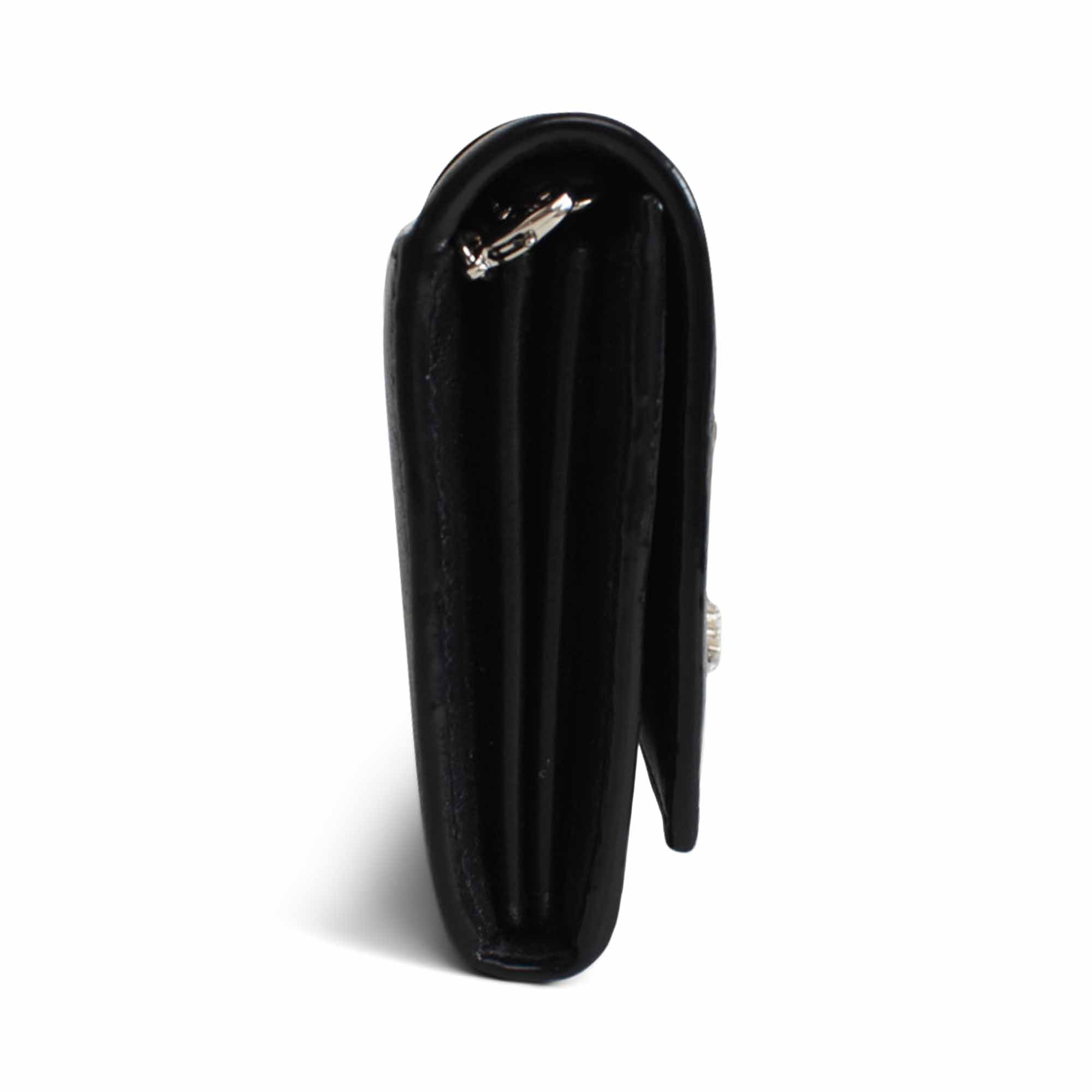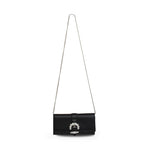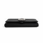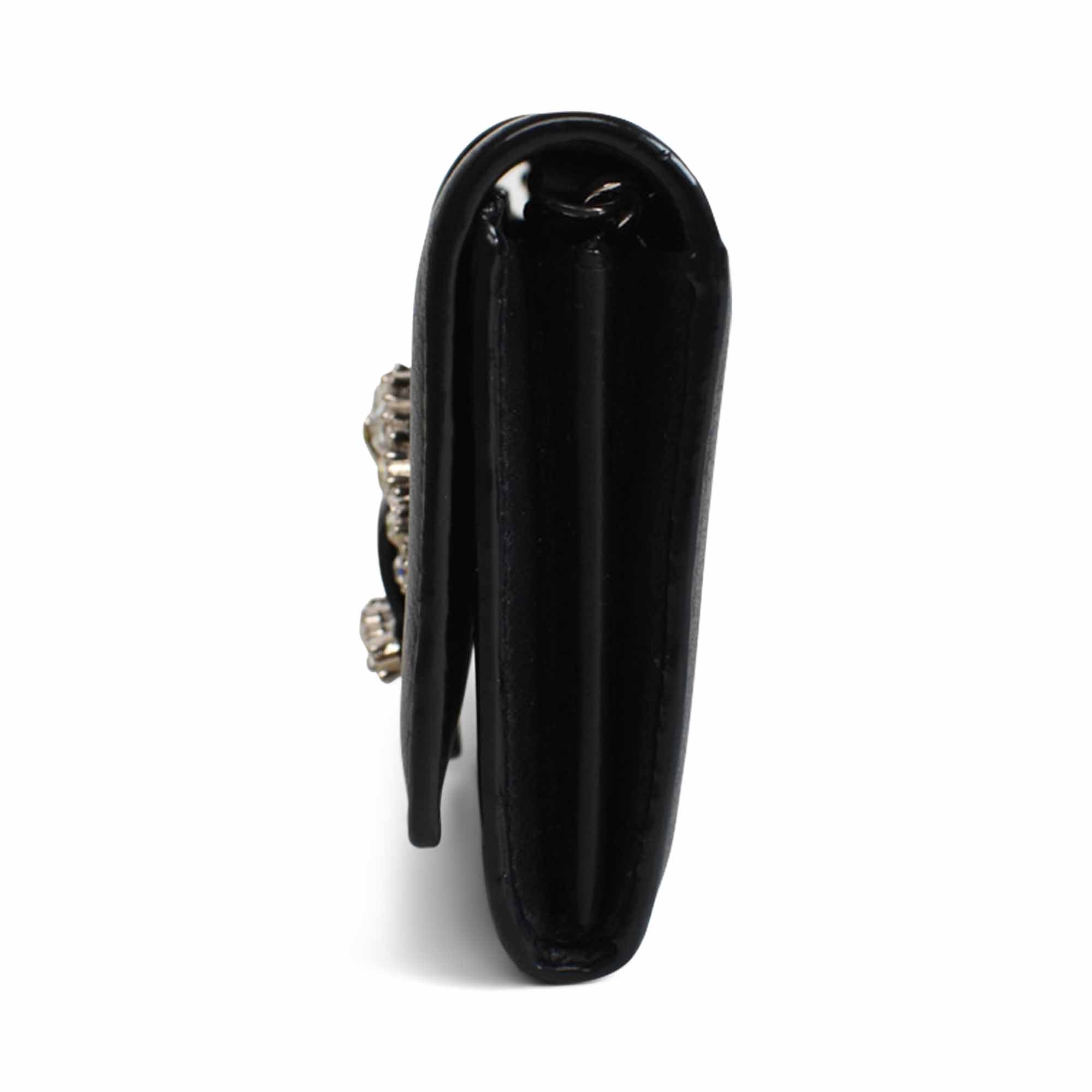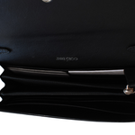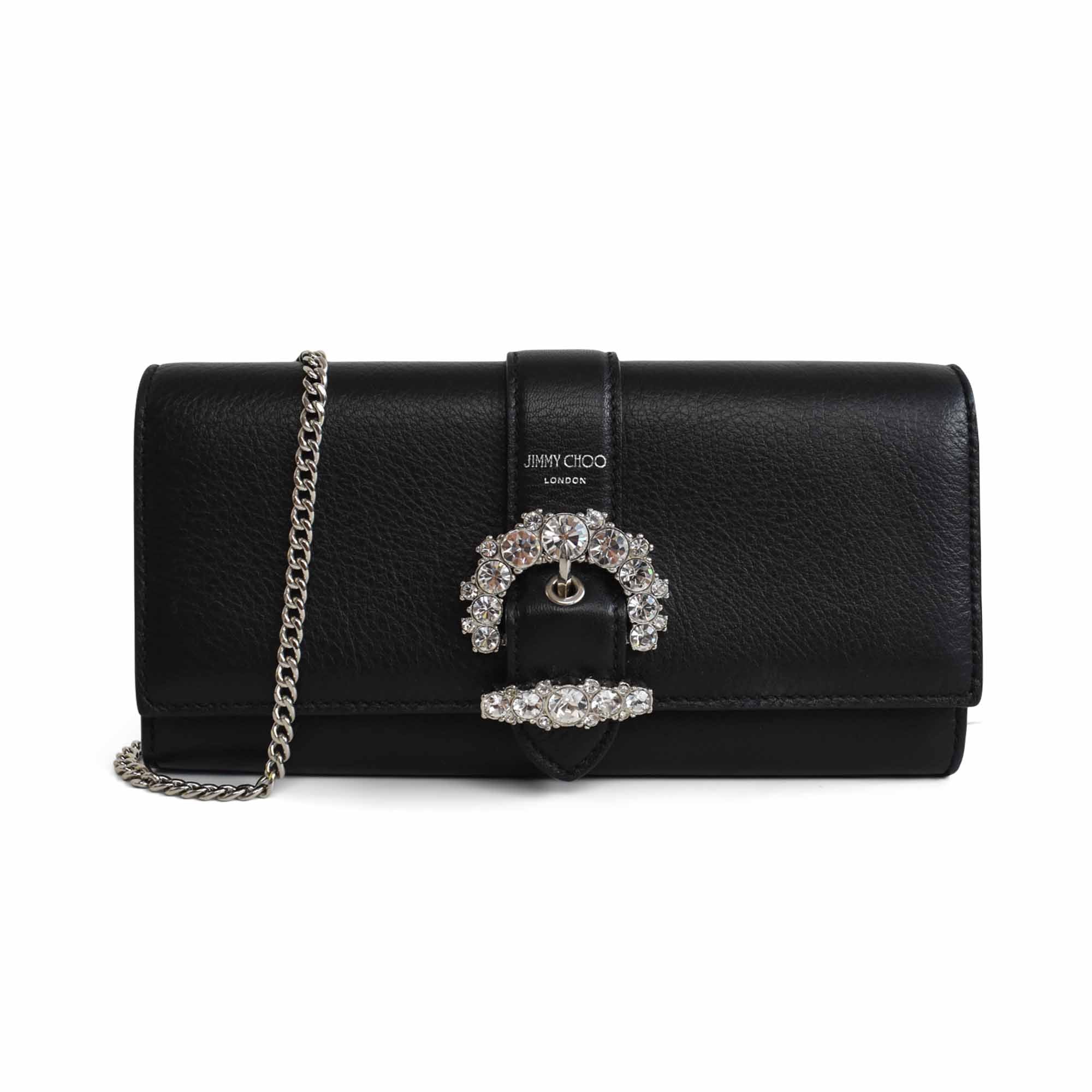 Jimmy Choo 'Cheri' wallet on chain in black leather with silver crystal buckle, foil logo stamp, and removable chain strap. Features a snap button closure, 8 card slots, 2 slip pockets, and an interior zip pocket.