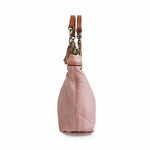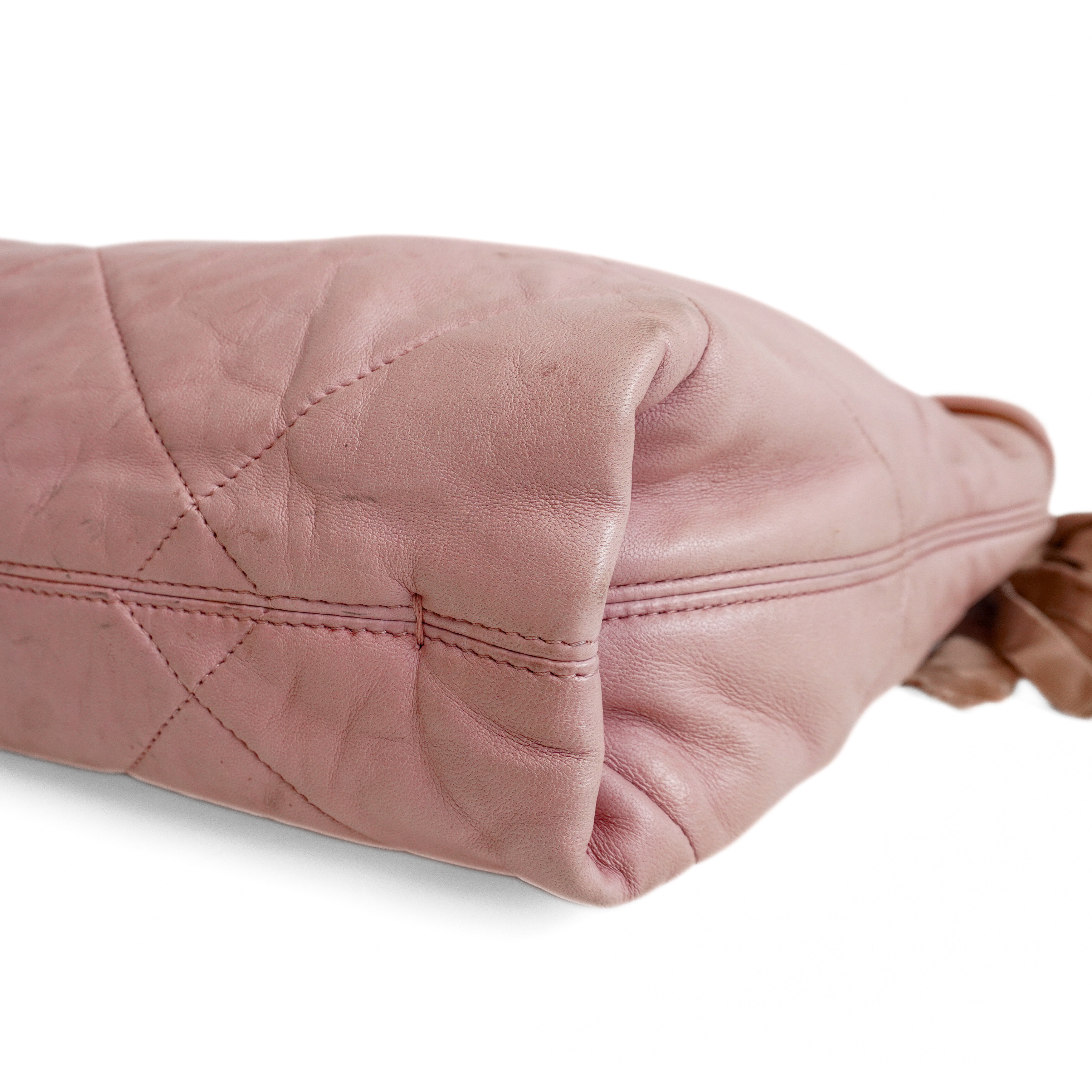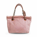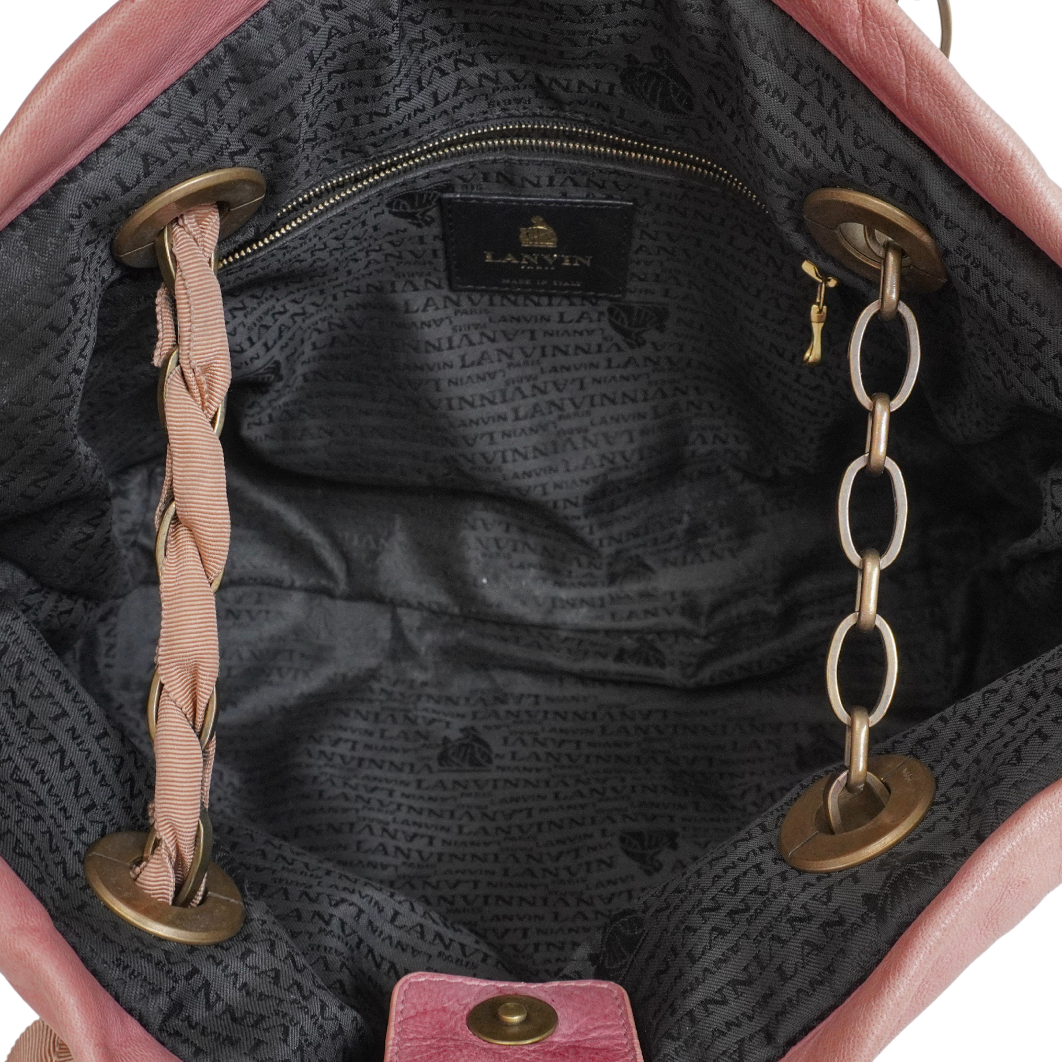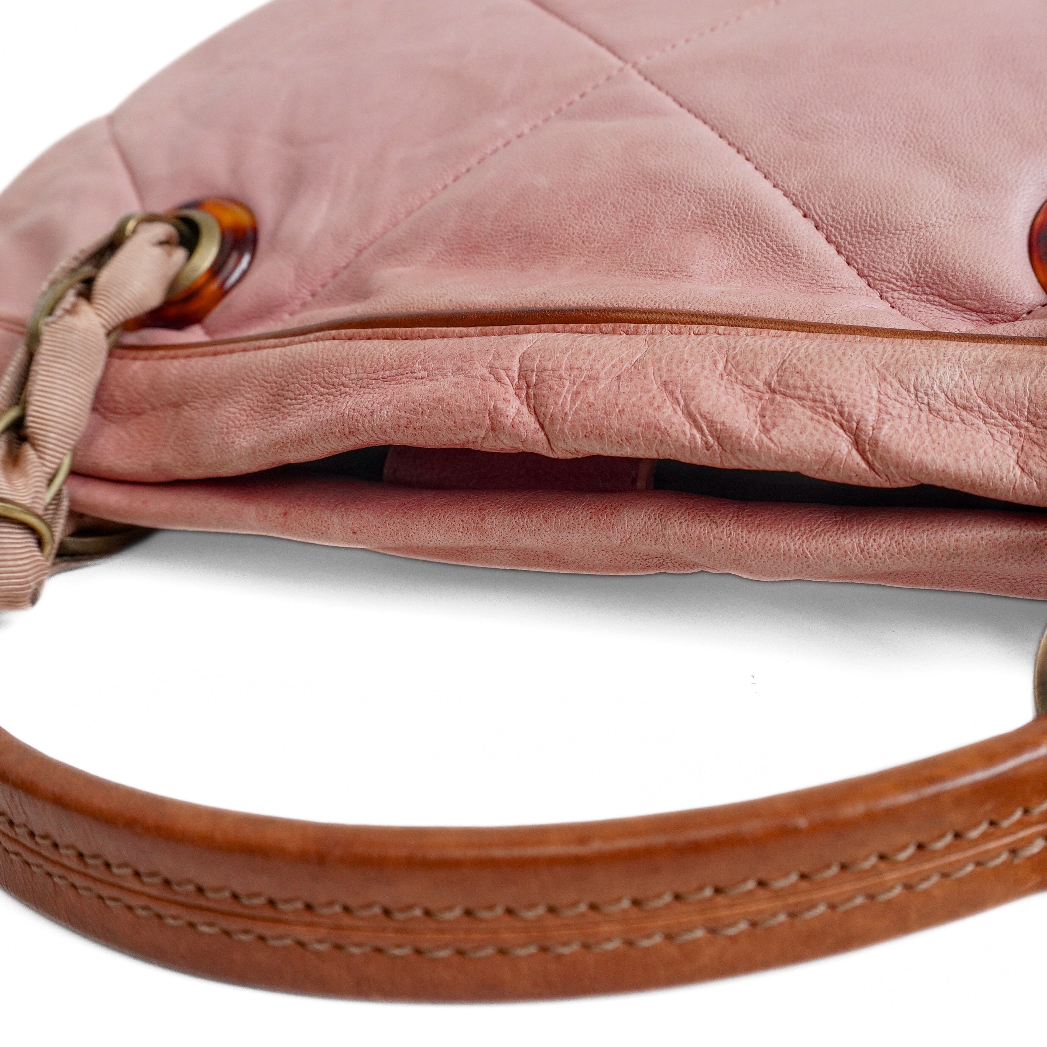 Lanvin 'Amalia' shoulder bag in pink diamond quilted leather with brown leather trim, tortoise detail and brushed gold chain link handles with brown leather strap rest and pink ribbon detail. Interior features a snap button closure, black monogram lining and a slip pocket.