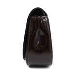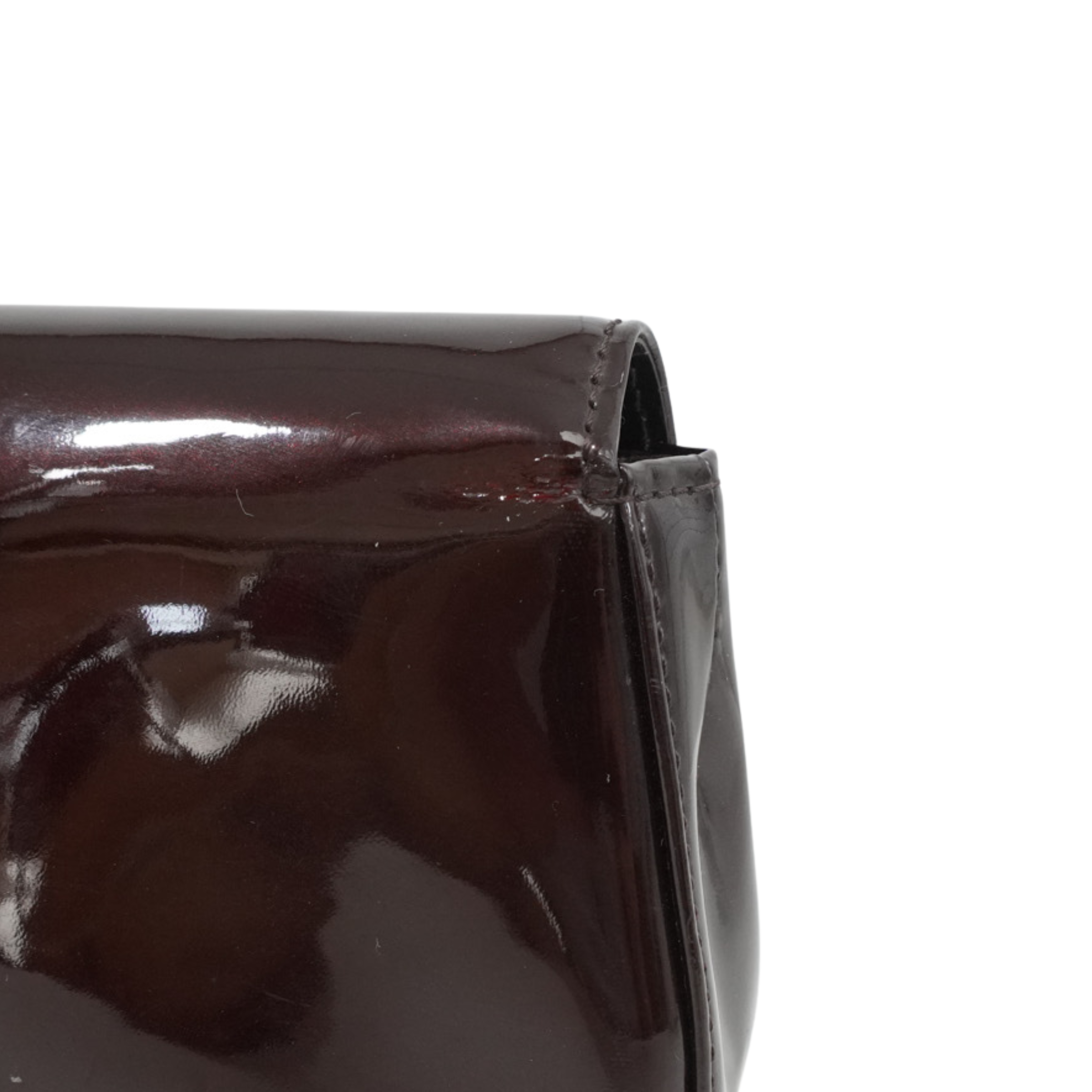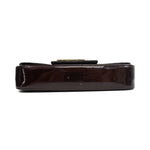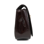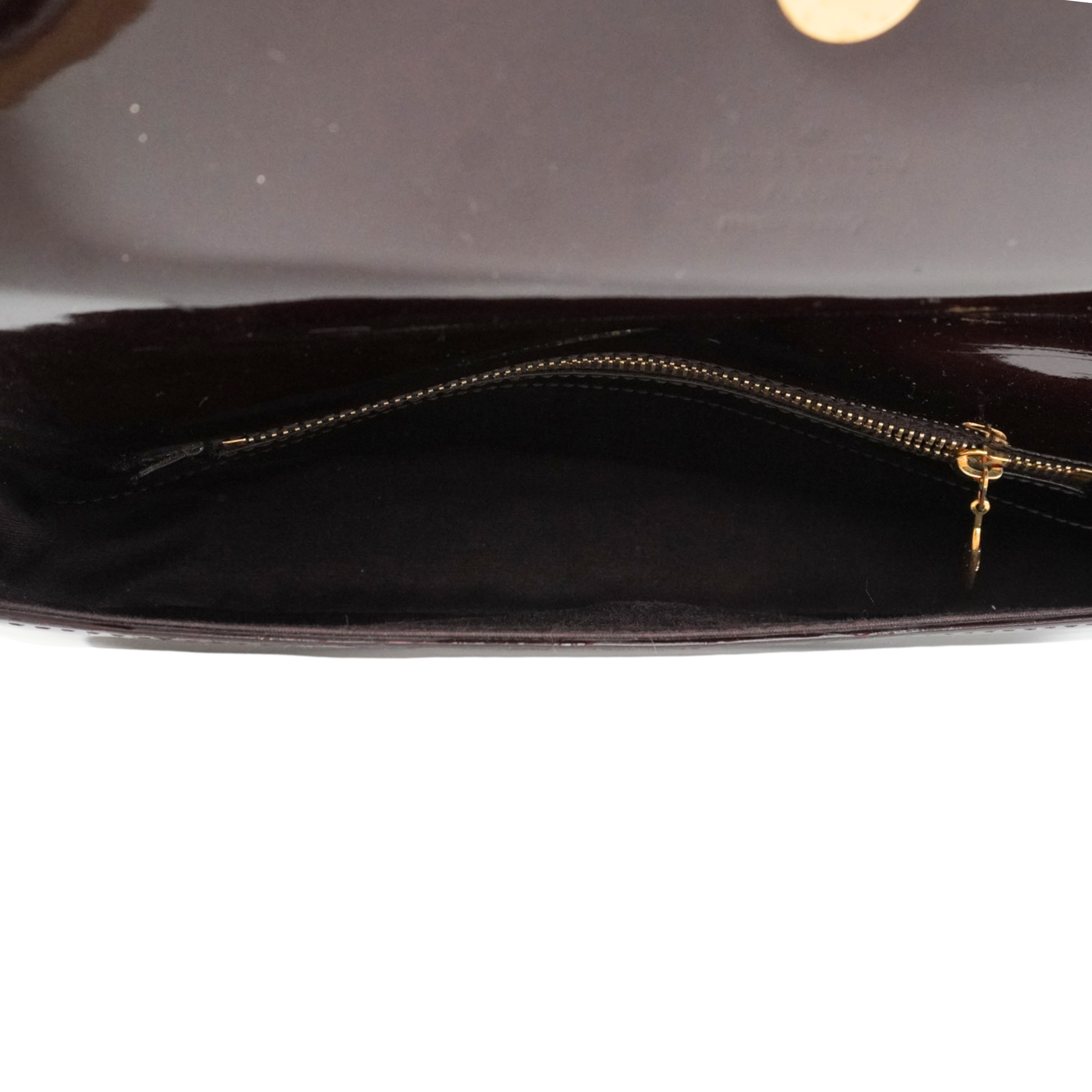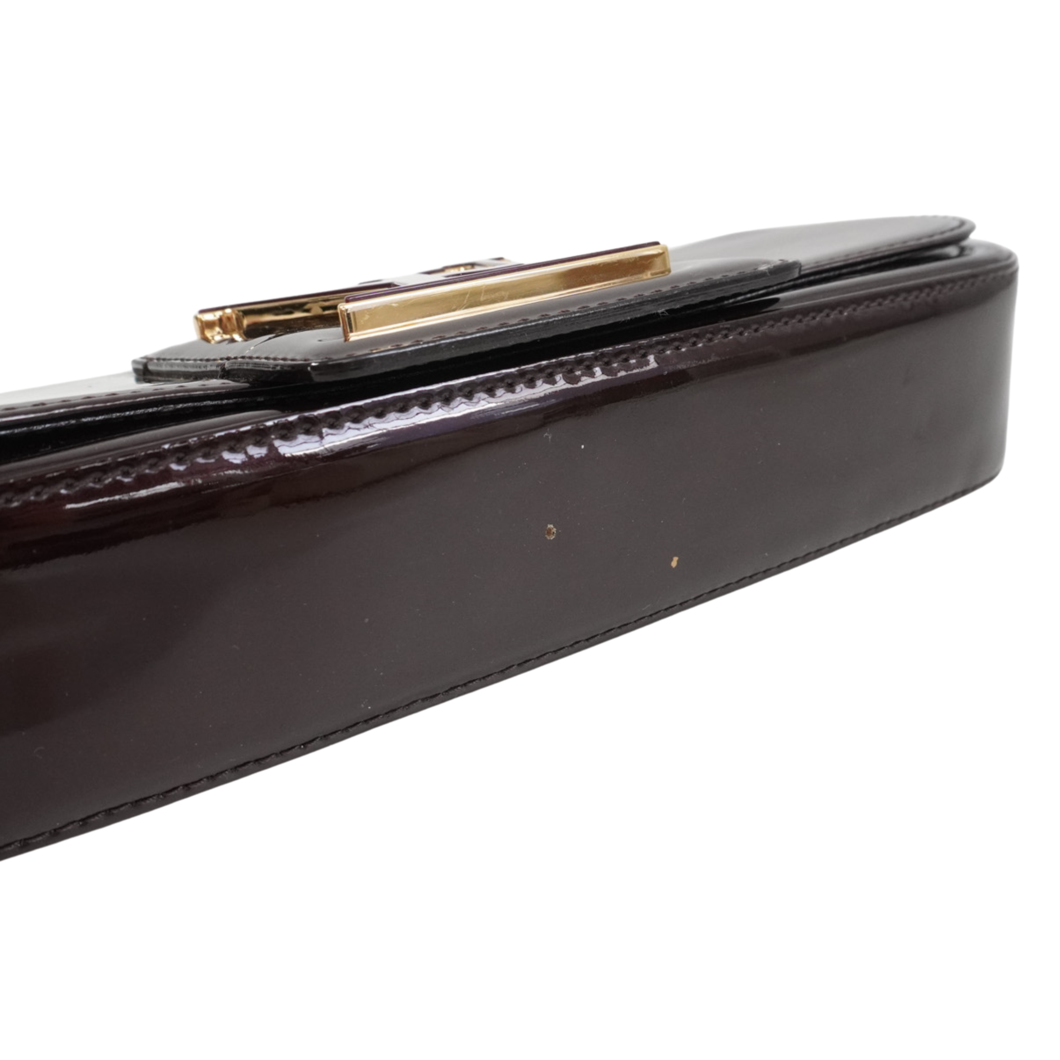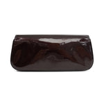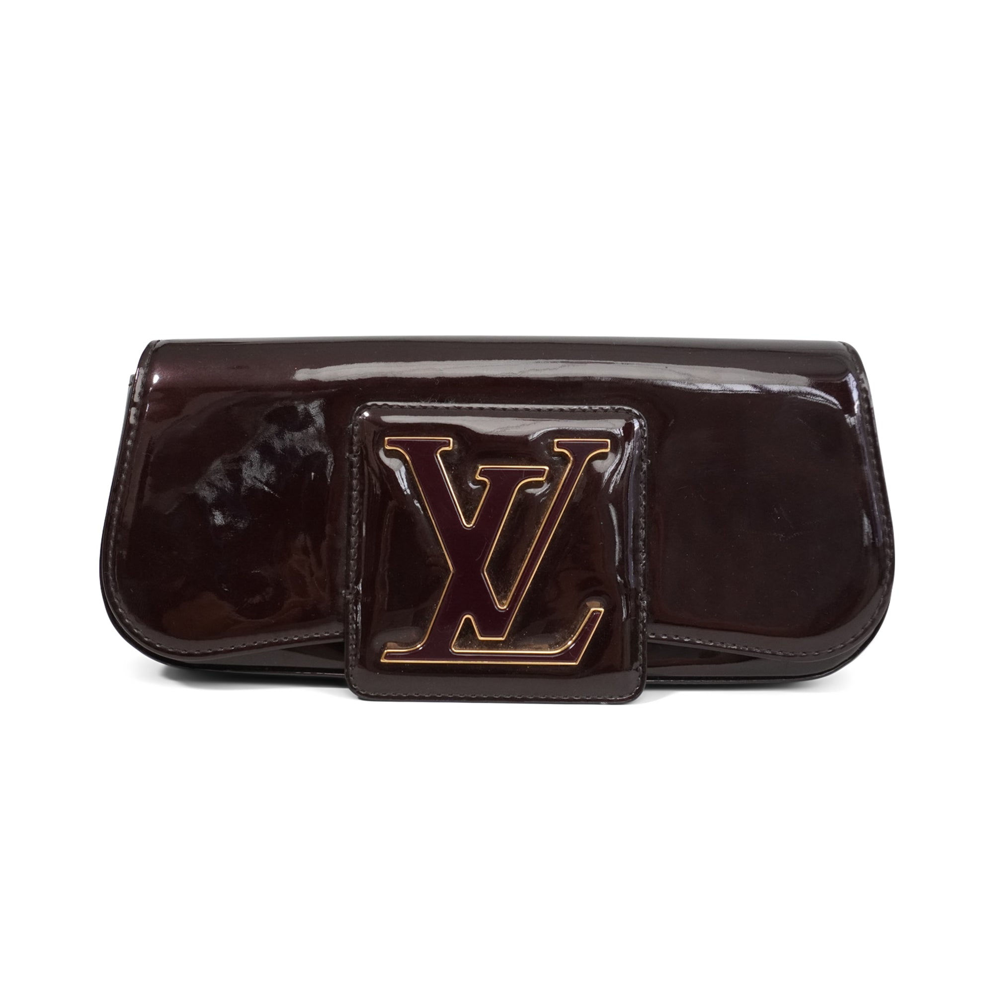 Louis Vuitton 'Sobe' clutch in amarante vernis patent leather with large 'LV' logo on the front with gold trim. Front flap opens to burgundy canvas lining with single zip pocket.