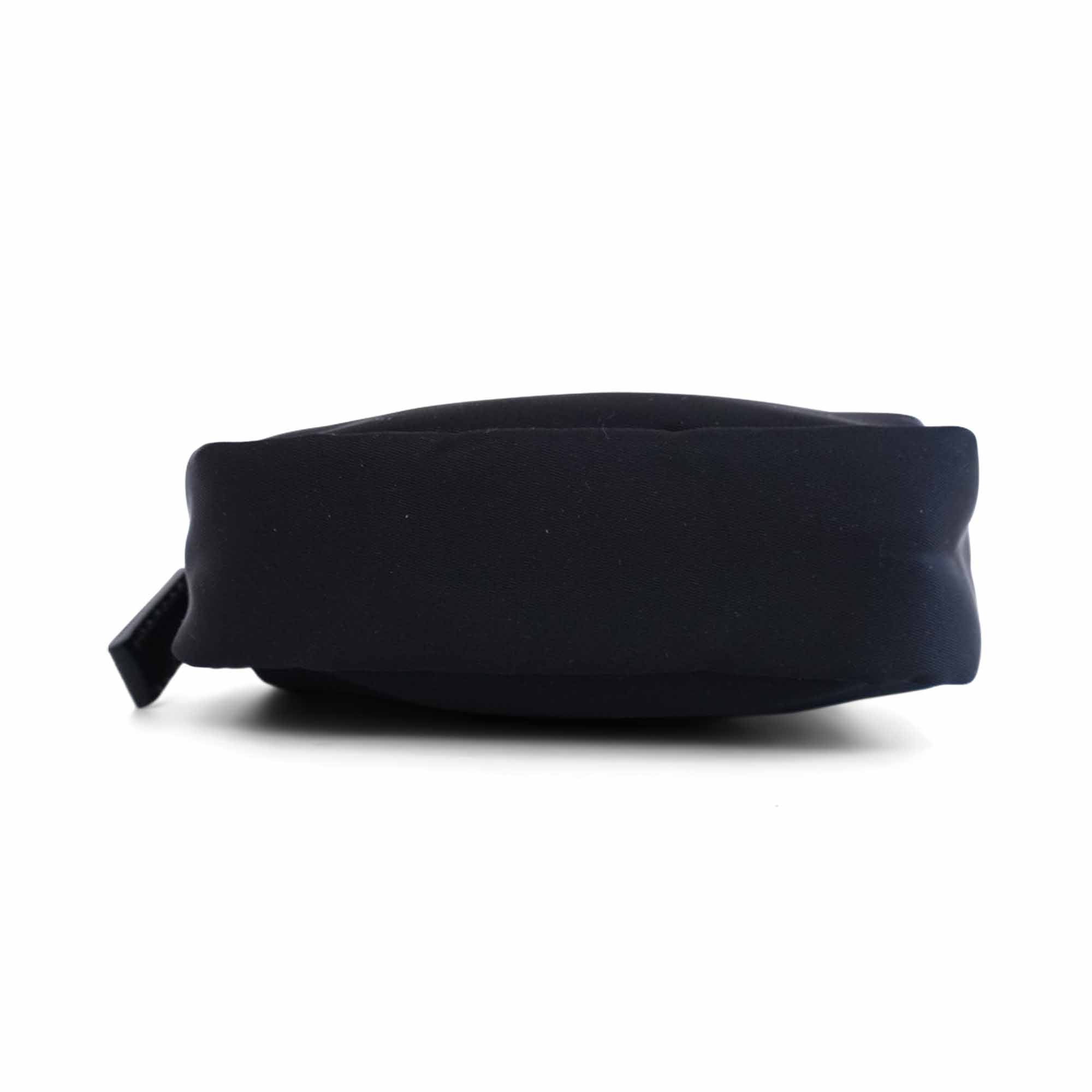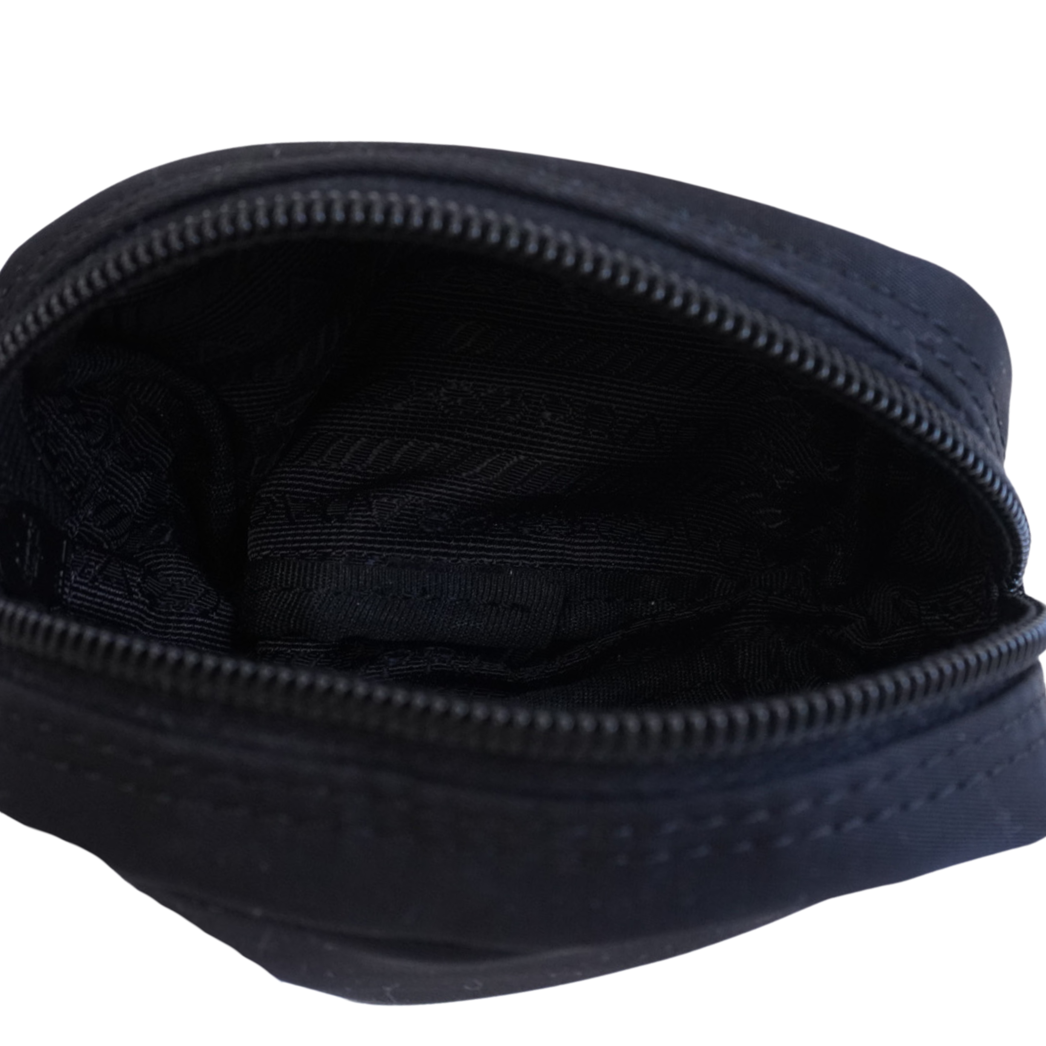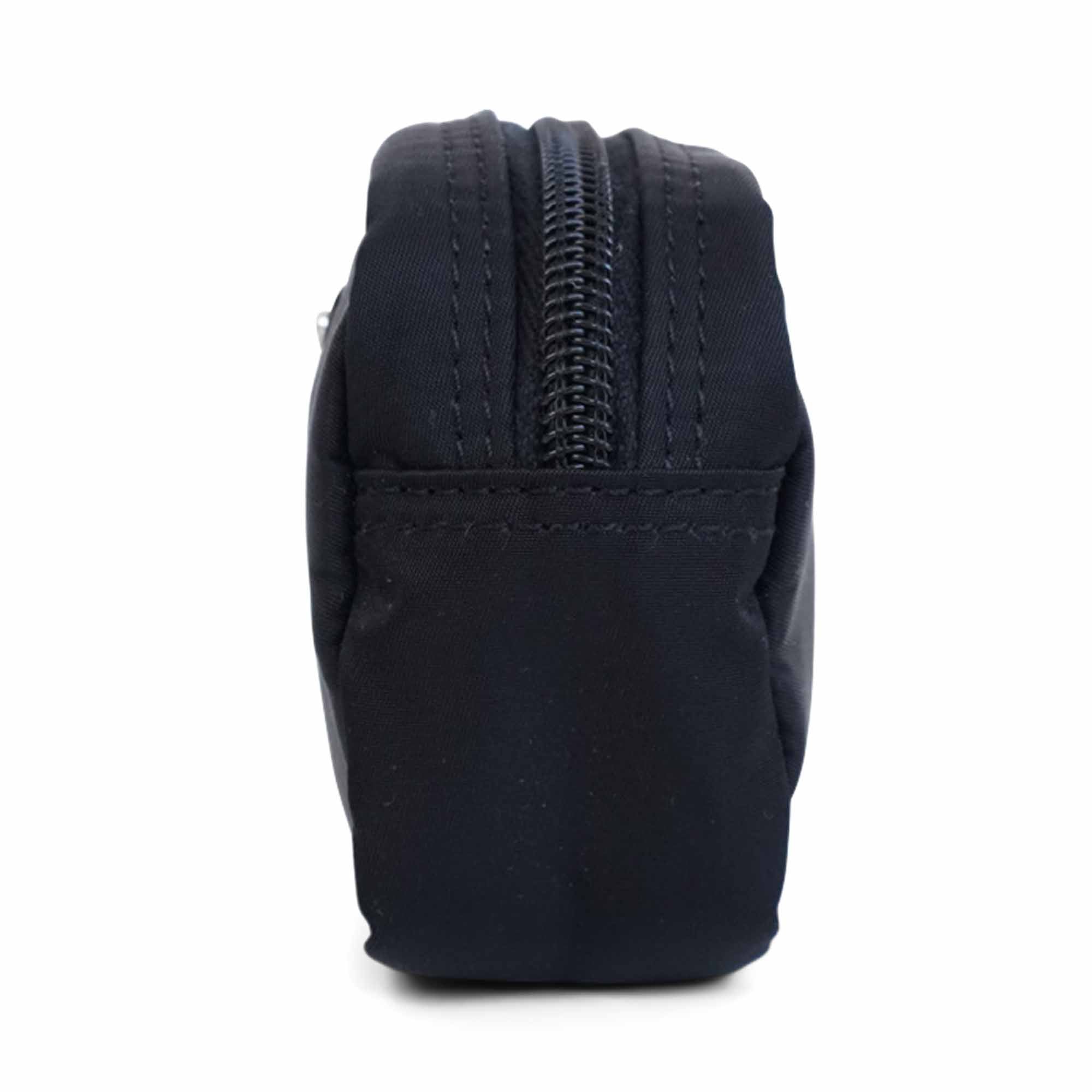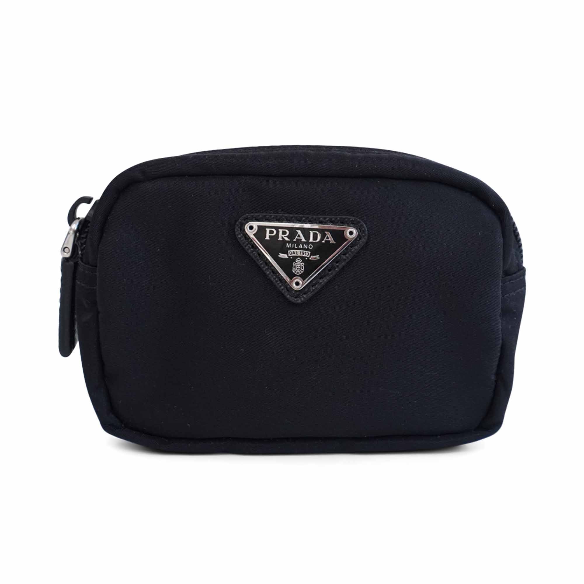 Prada mini zip pouch in black nylon with a silver metal triangle logo on the front and a zip around opening.