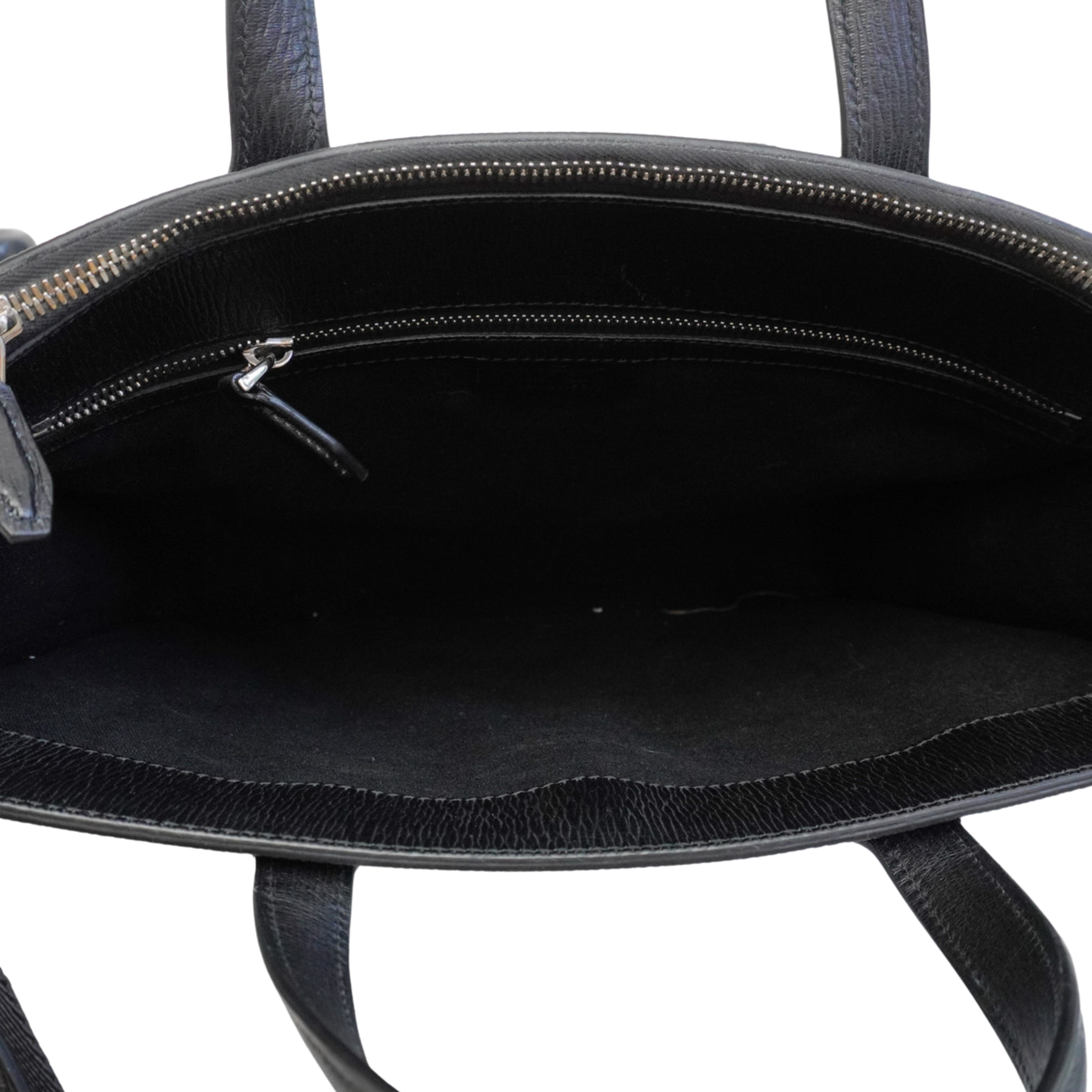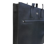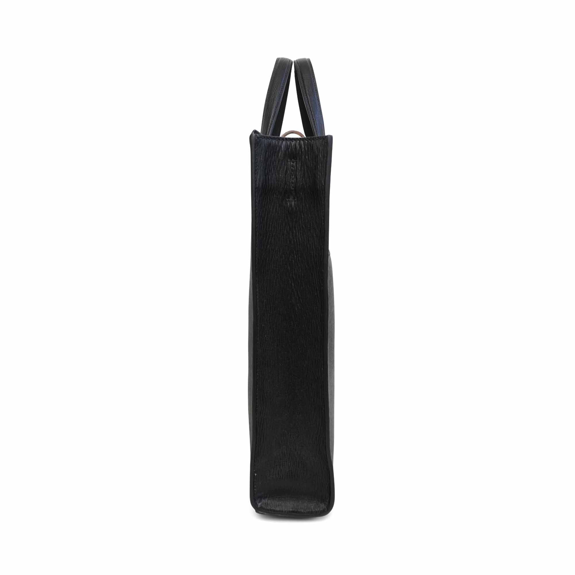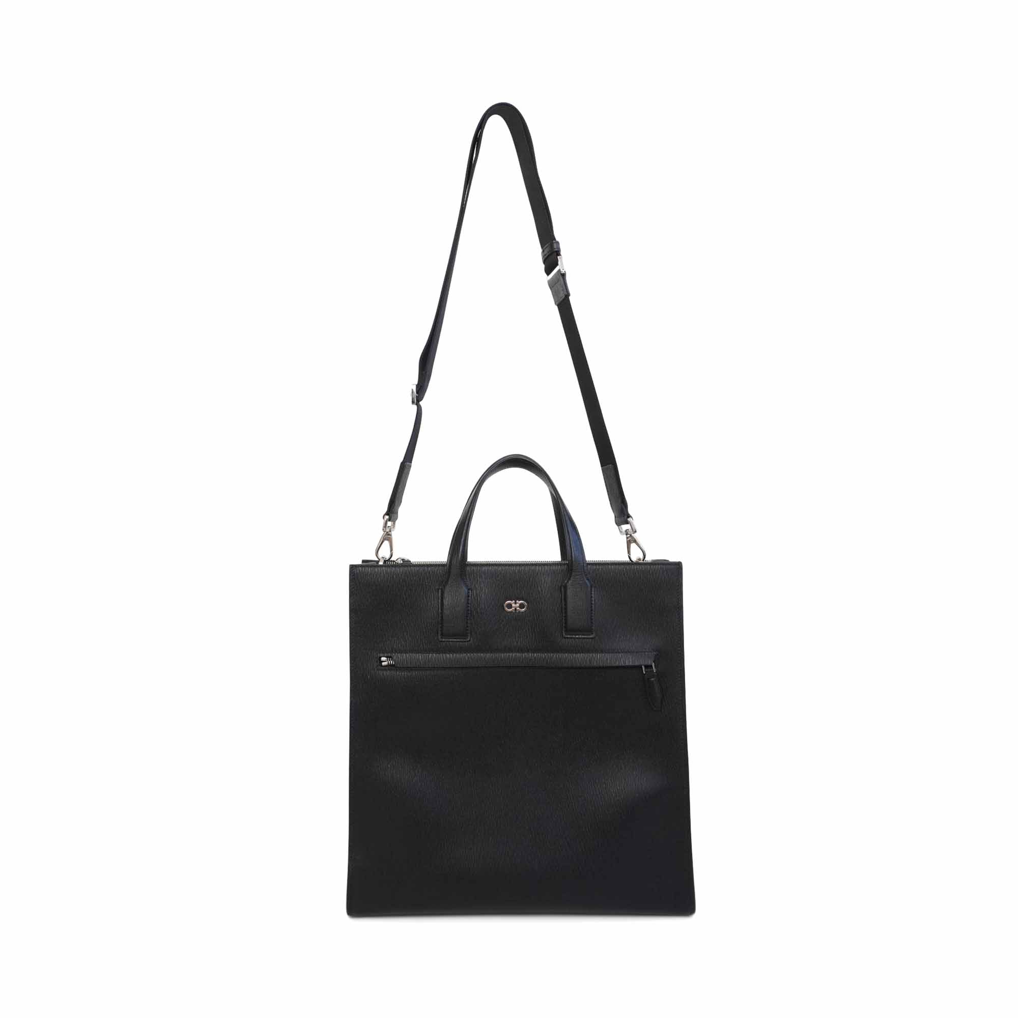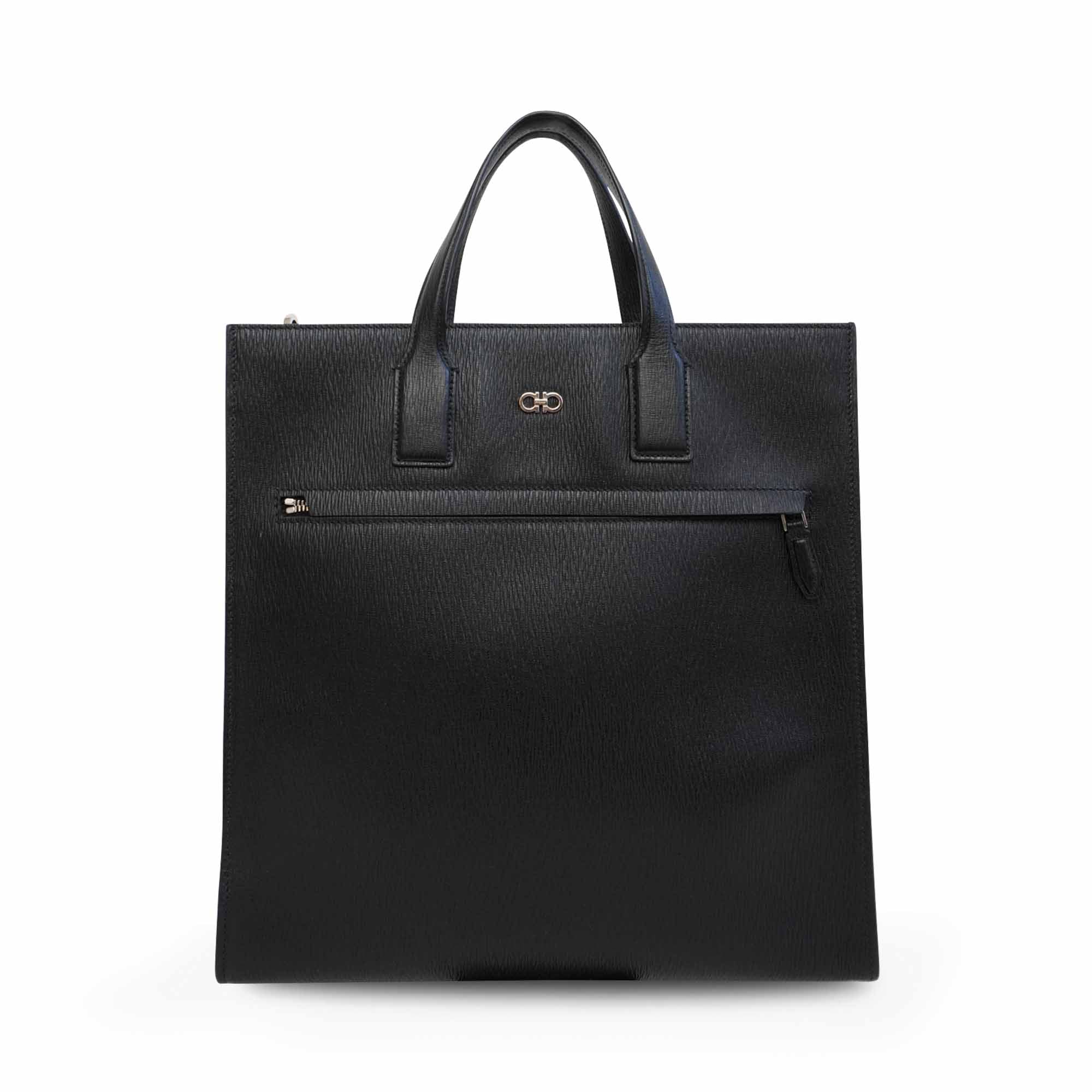 Salvatore Ferragamo tote bag in black textured leather with a front zip pocket, dual top handles, and a removable canvas shoulder strap. The bag has a back zip compartment as well as an open large main compartment with a zip pocket.