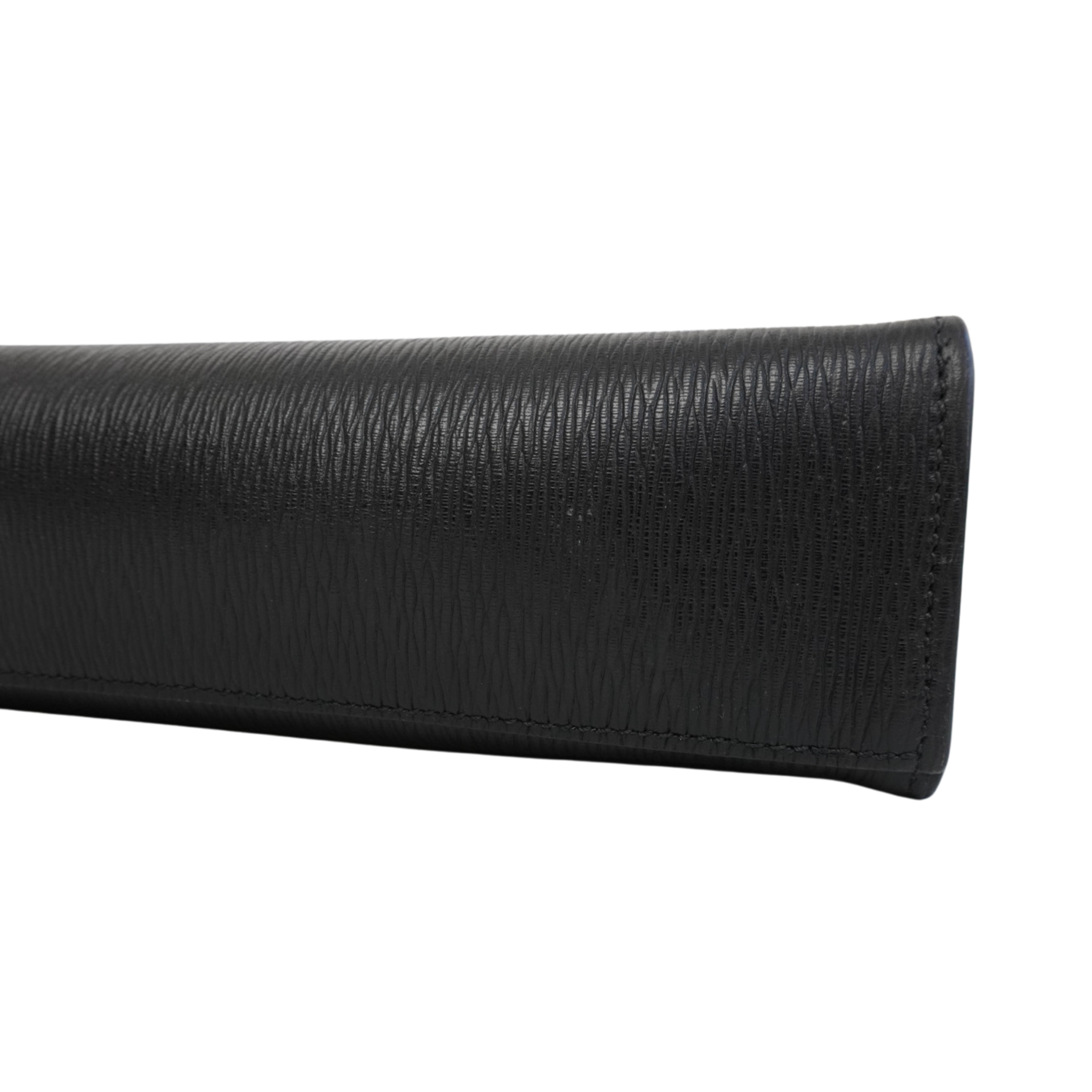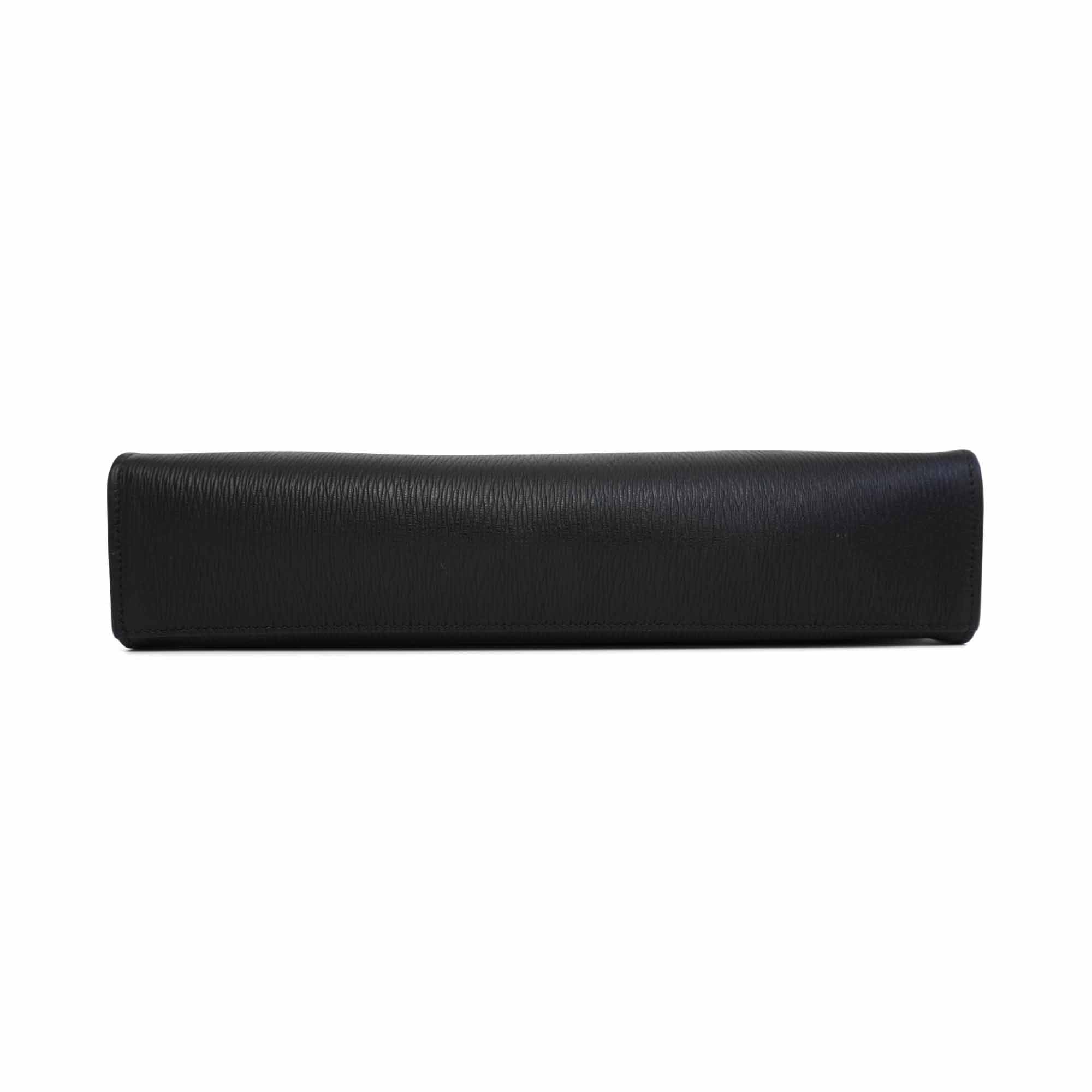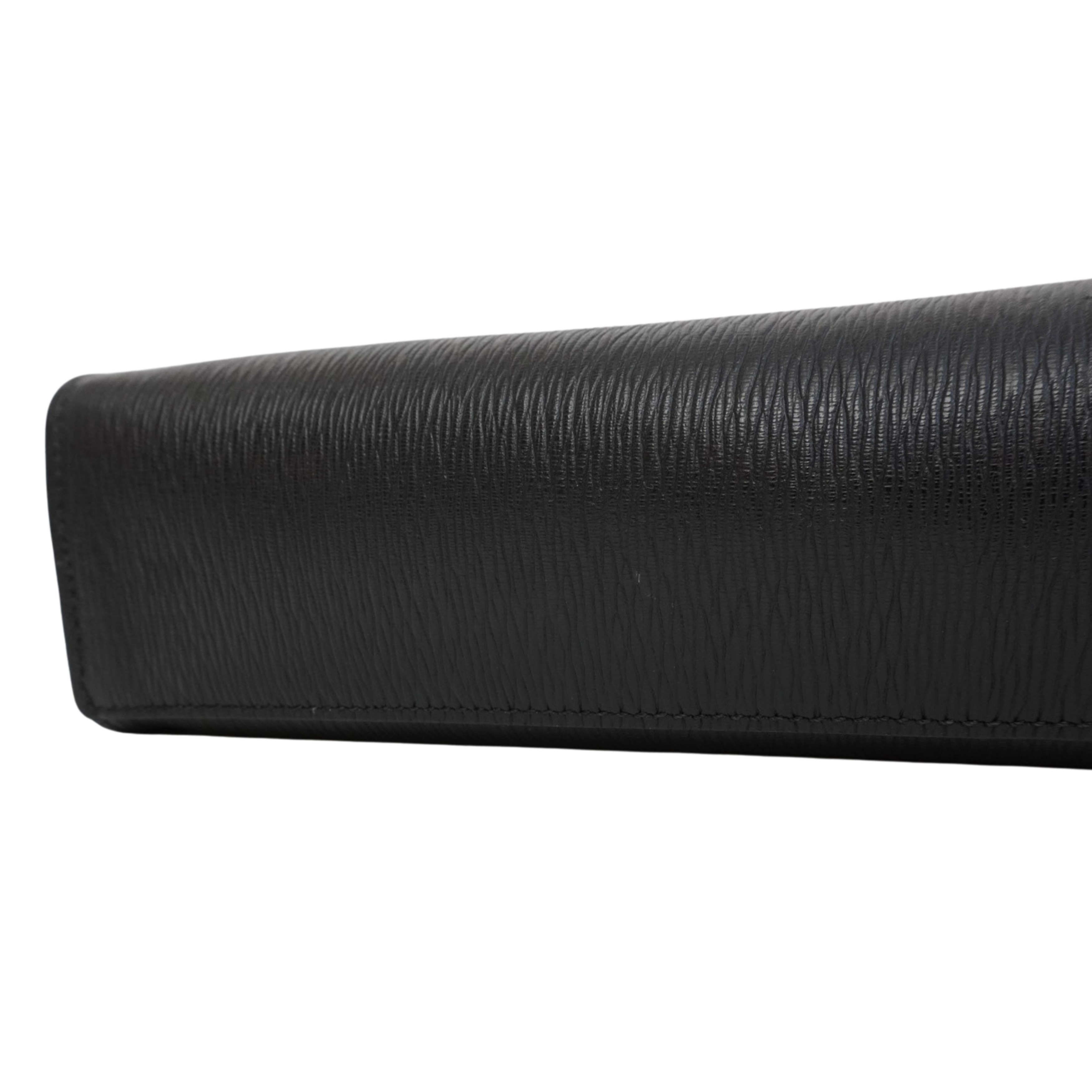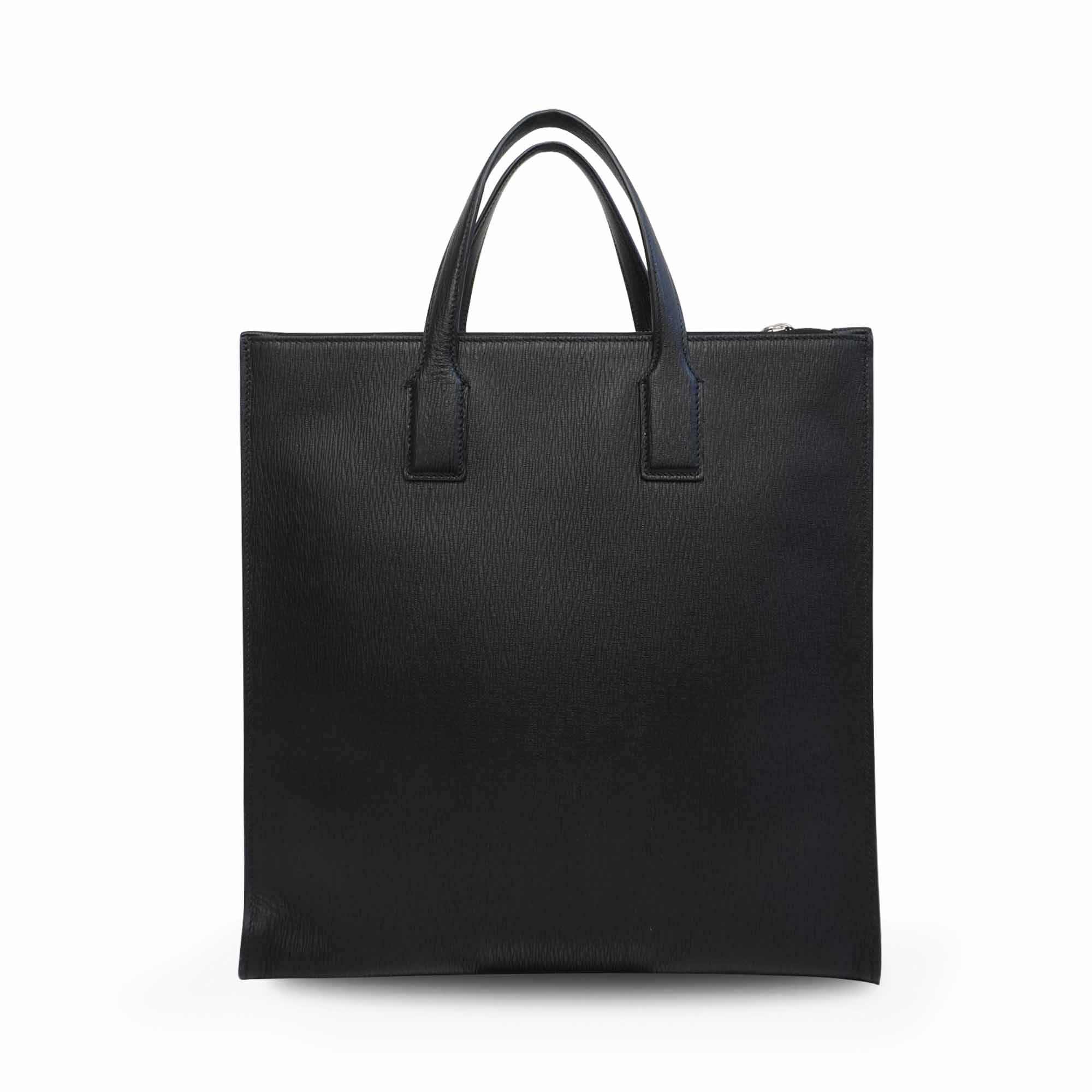 Salvatore Ferragamo tote bag in black textured leather with a front zip pocket, dual top handles, and a removable canvas shoulder strap. The bag has a back zip compartment as well as an open large main compartment with a zip pocket.