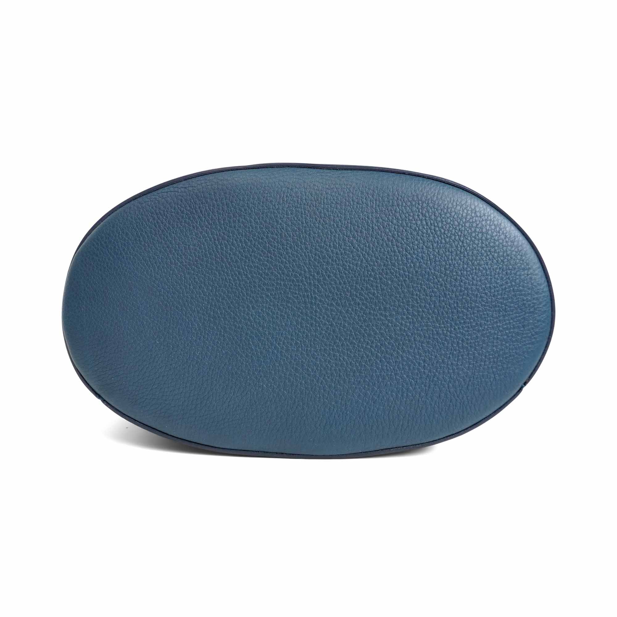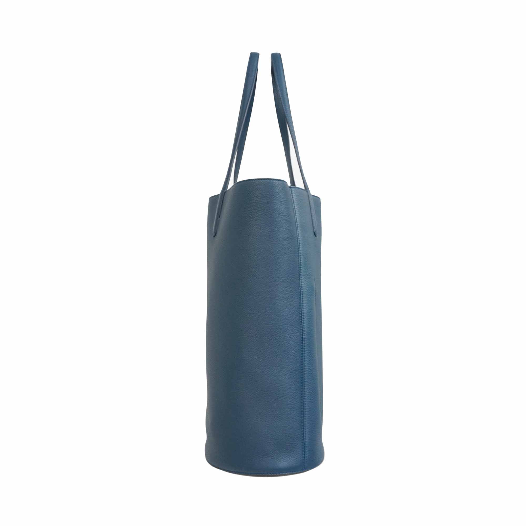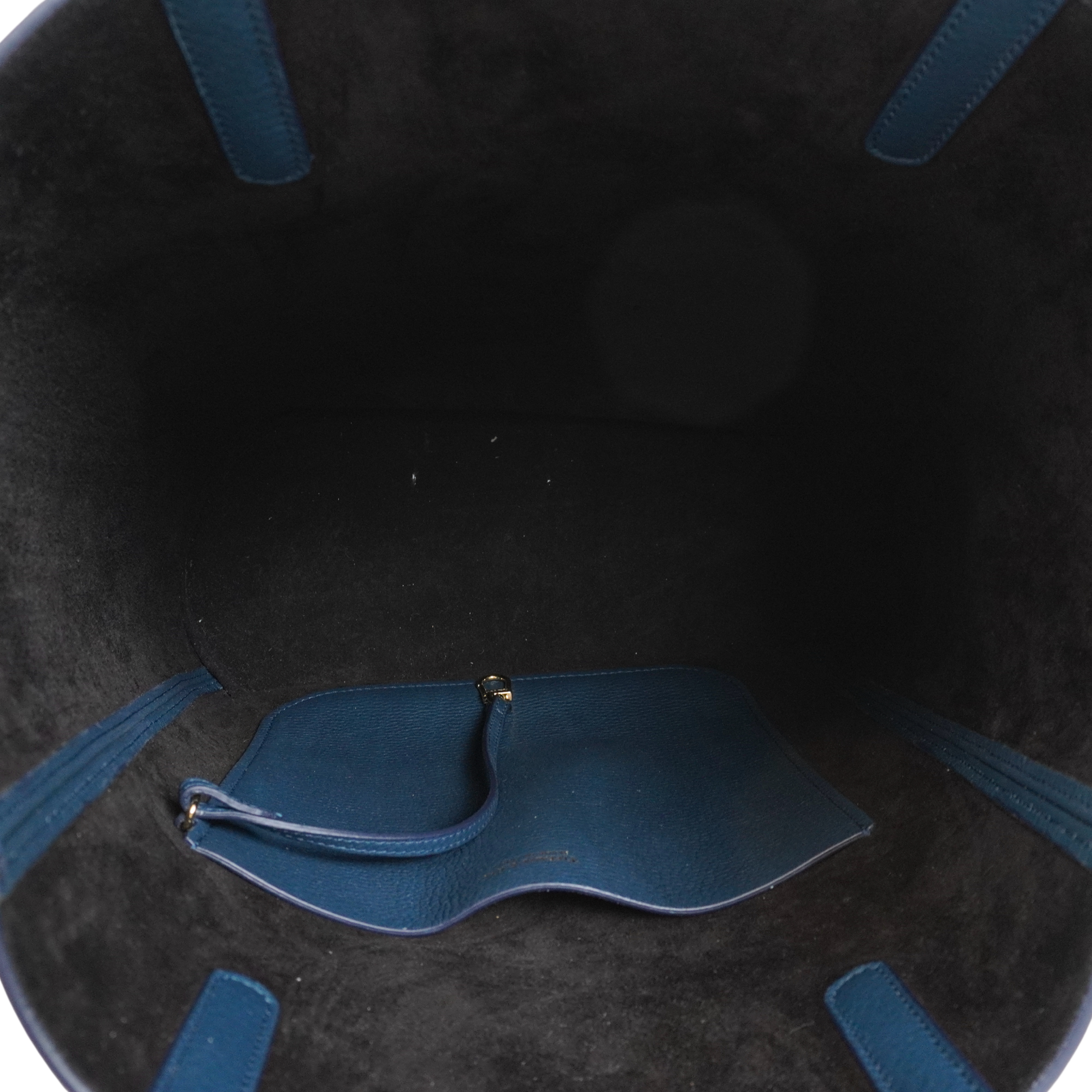 Tiffany & Co. tote bag in deep teal pebbled leather with dual top handles, a gold embossed logo on the front, and a black suede interior with a large slip pocket and an attachable pouch.