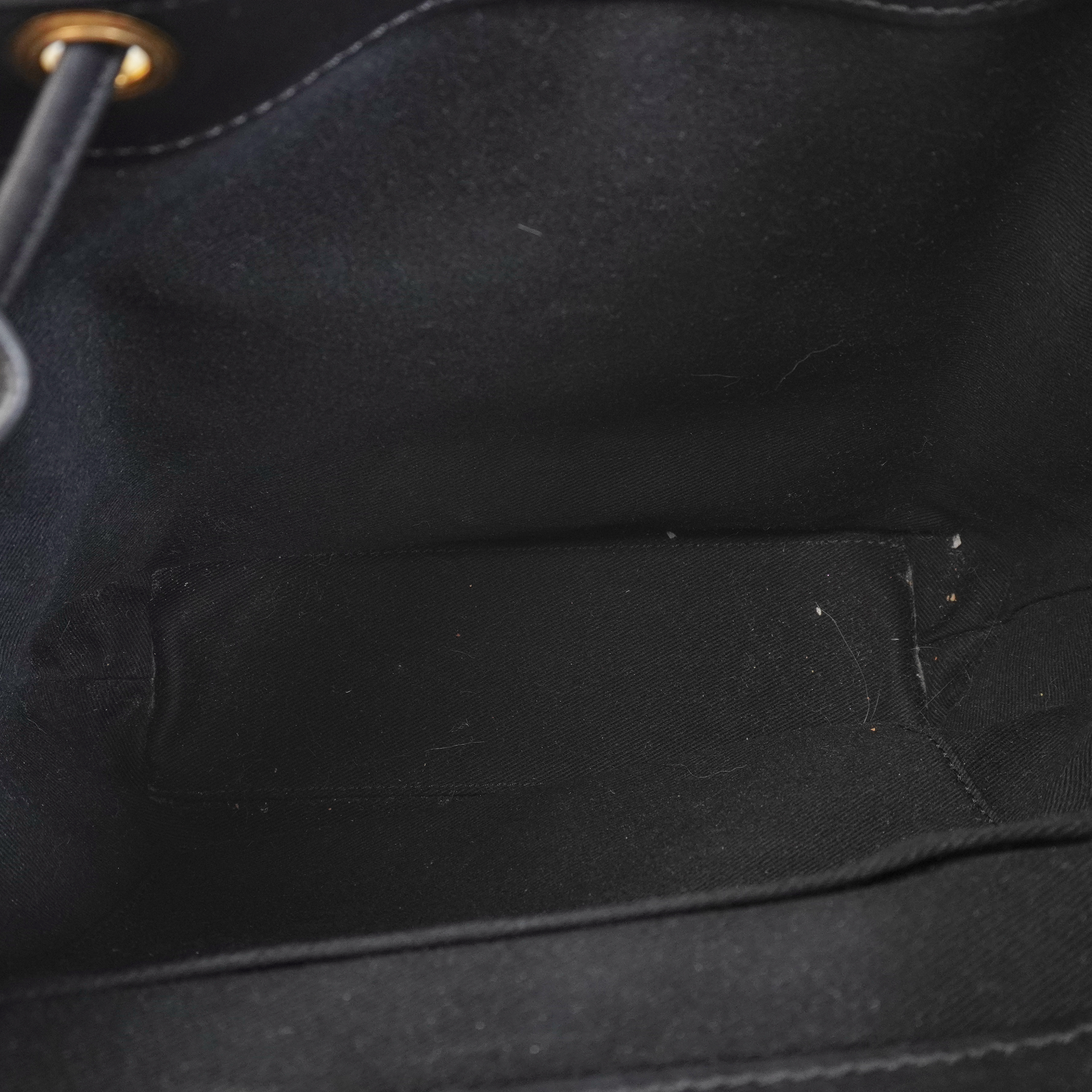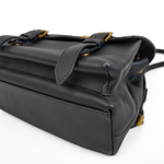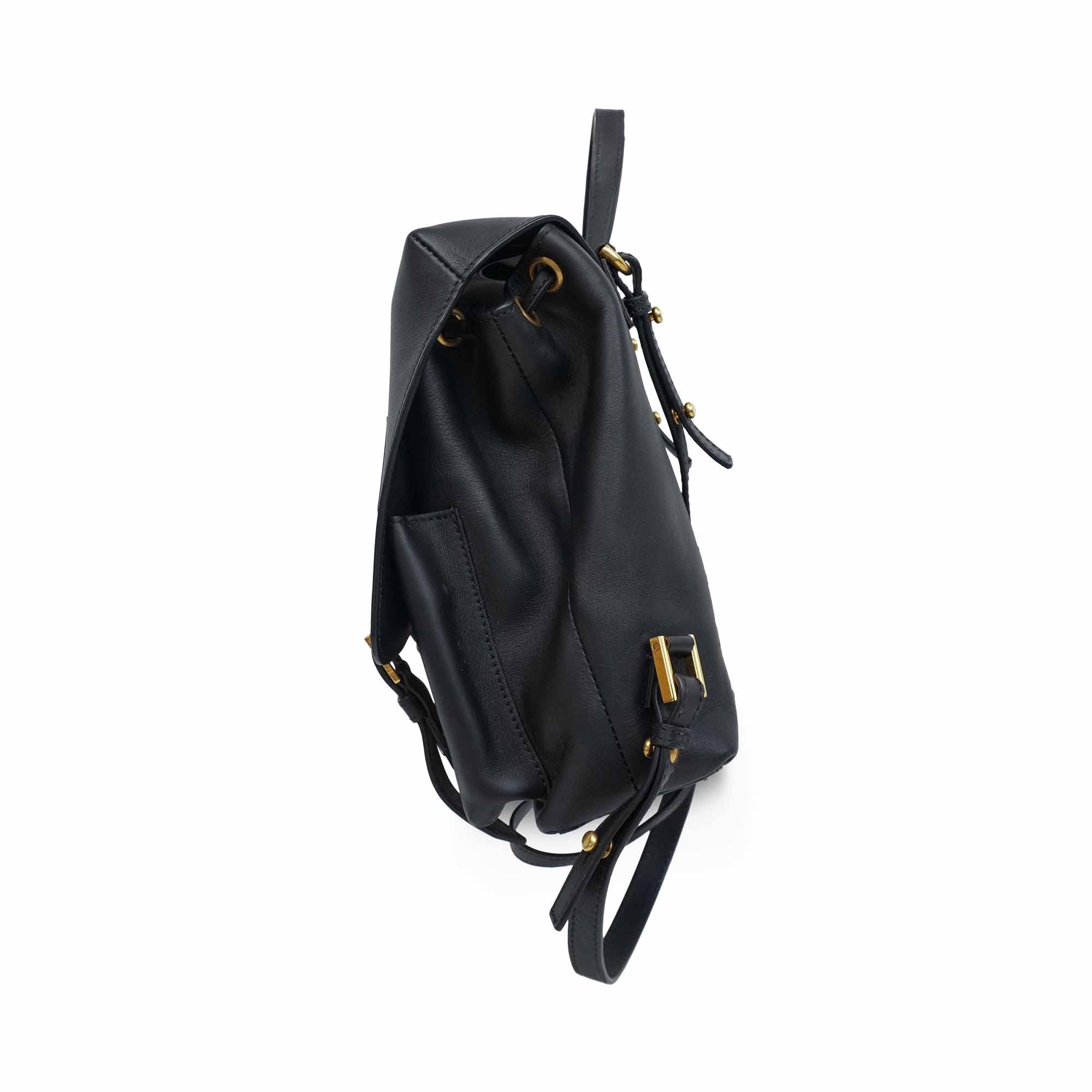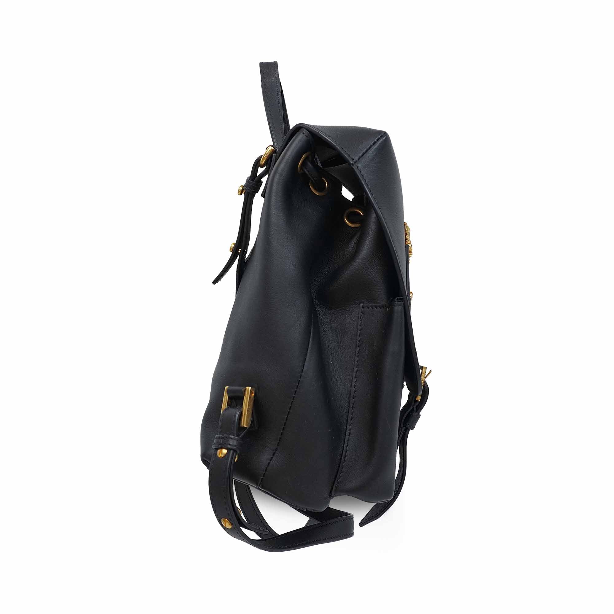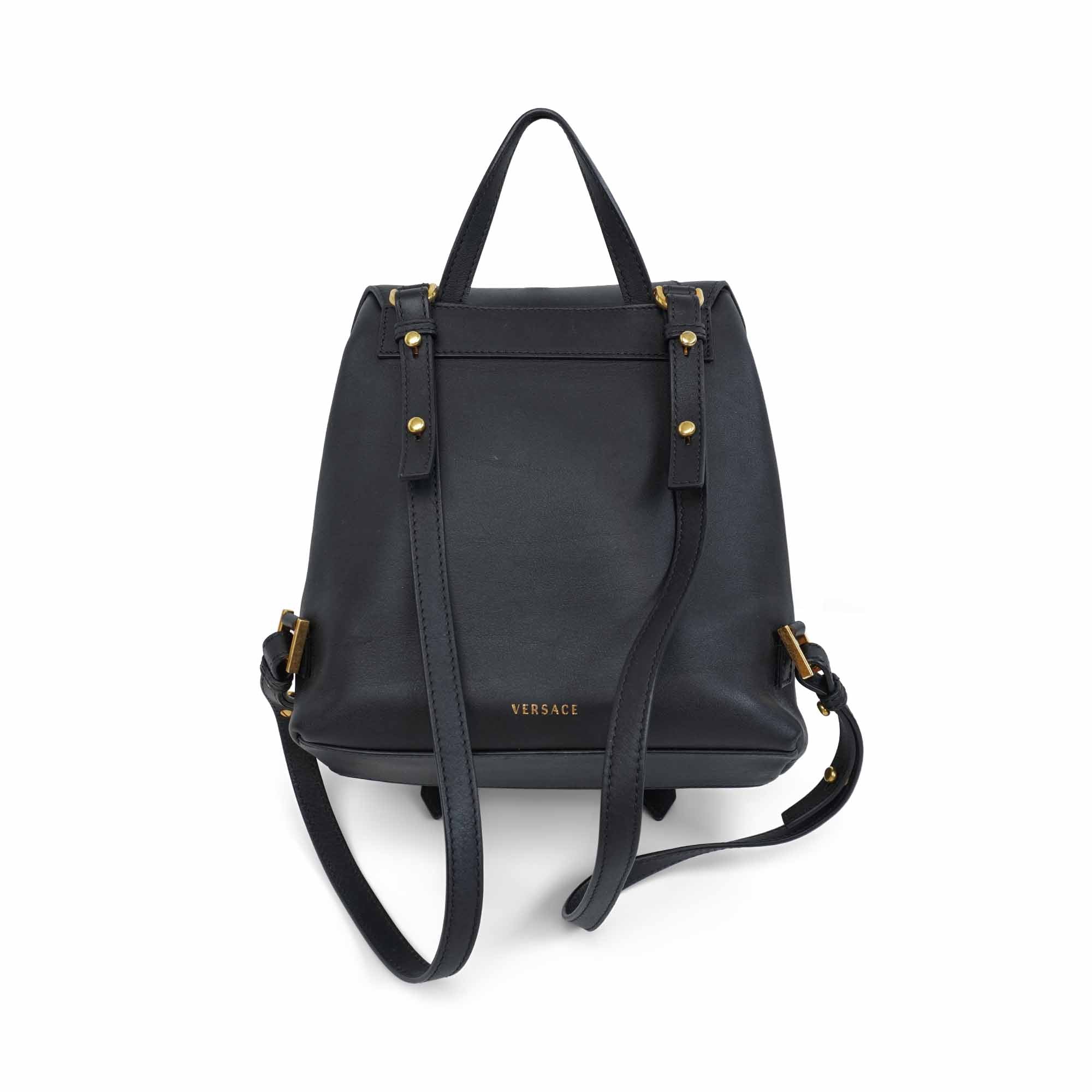 Versace 'Virtus' backpack in black leather with adjustable straps, a top flap opening with a large gold ornate 'V', and magnetic snap closures. The interior is lined with black canvas and has a drawstring closure.