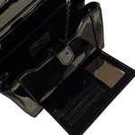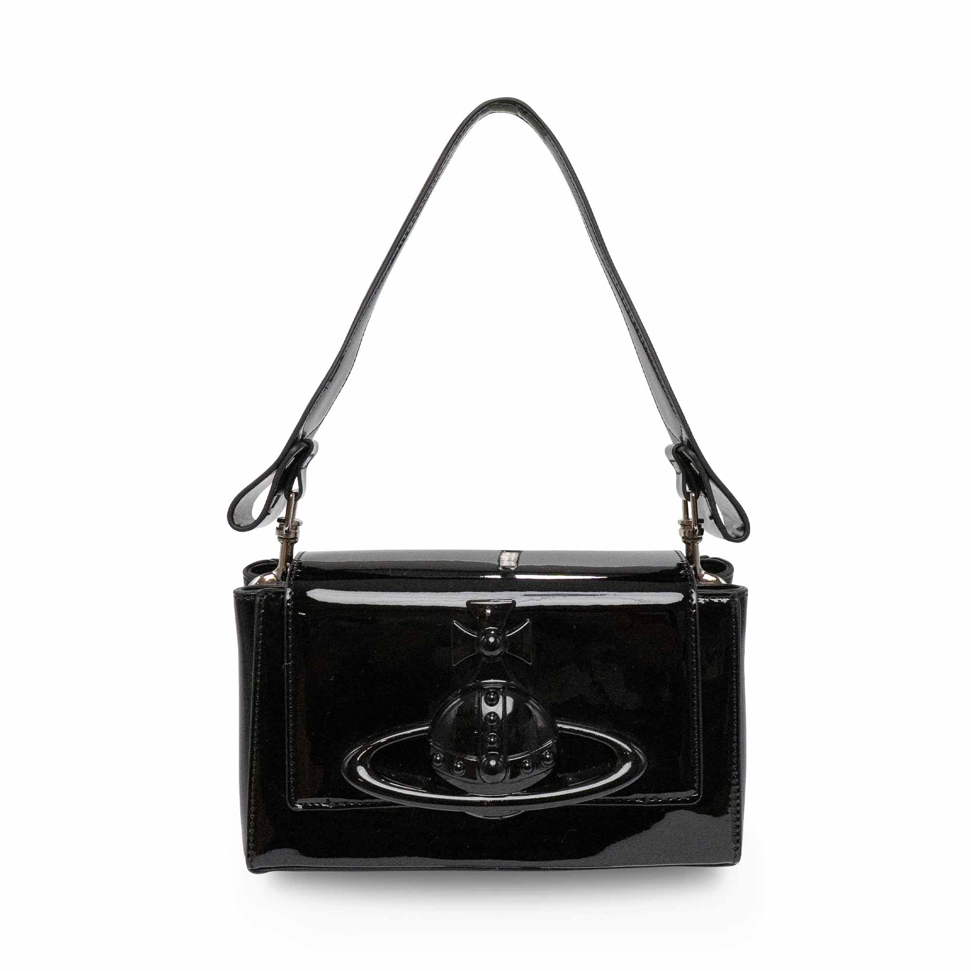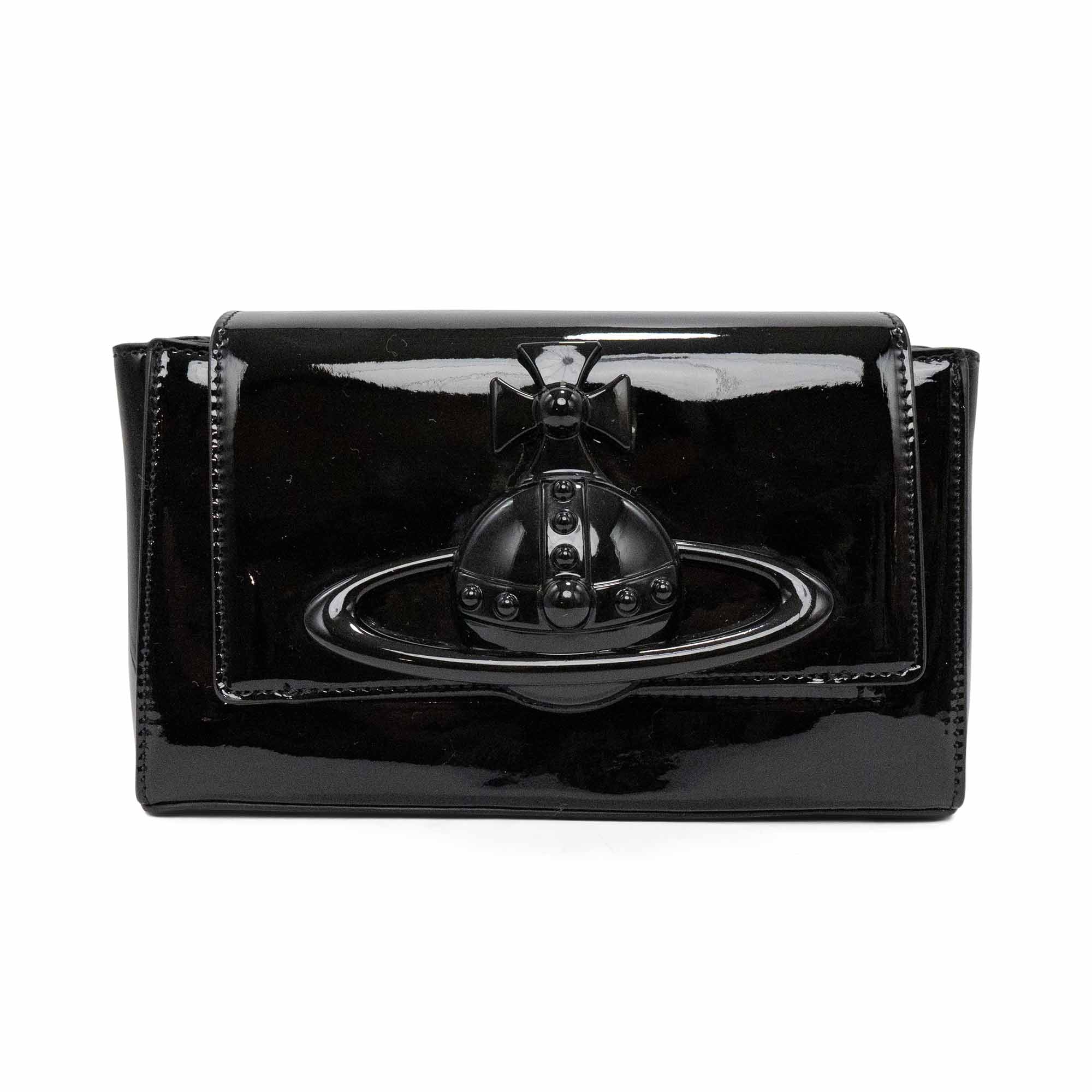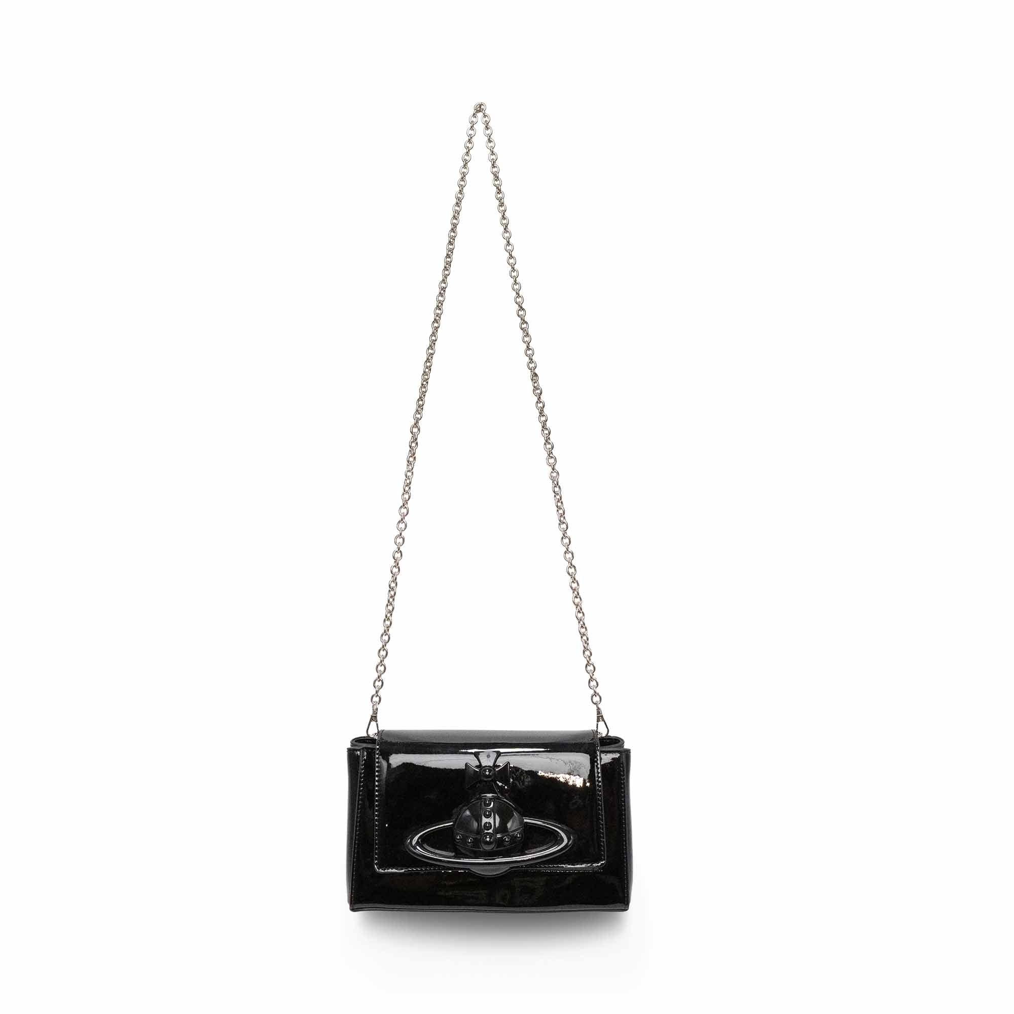 Vivienne Westwood 'Hazel' shoulder bag in black patent leather with a large orb decal on the front flap and a magnetic snap closure. Features a removable patent leather shoulder strap and chain crossbody strap. Interior features black canvas lining and an extra flap underneath the front flap with three card slots and a small compact mirror.