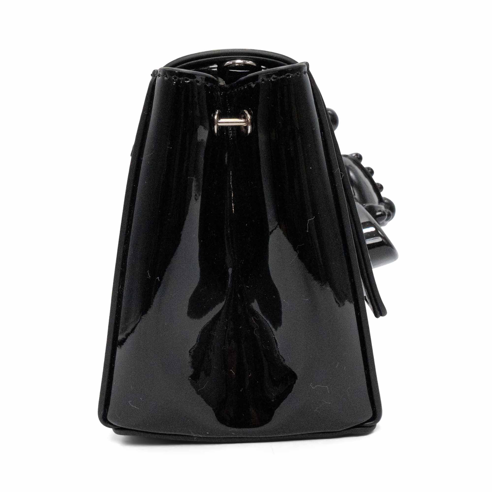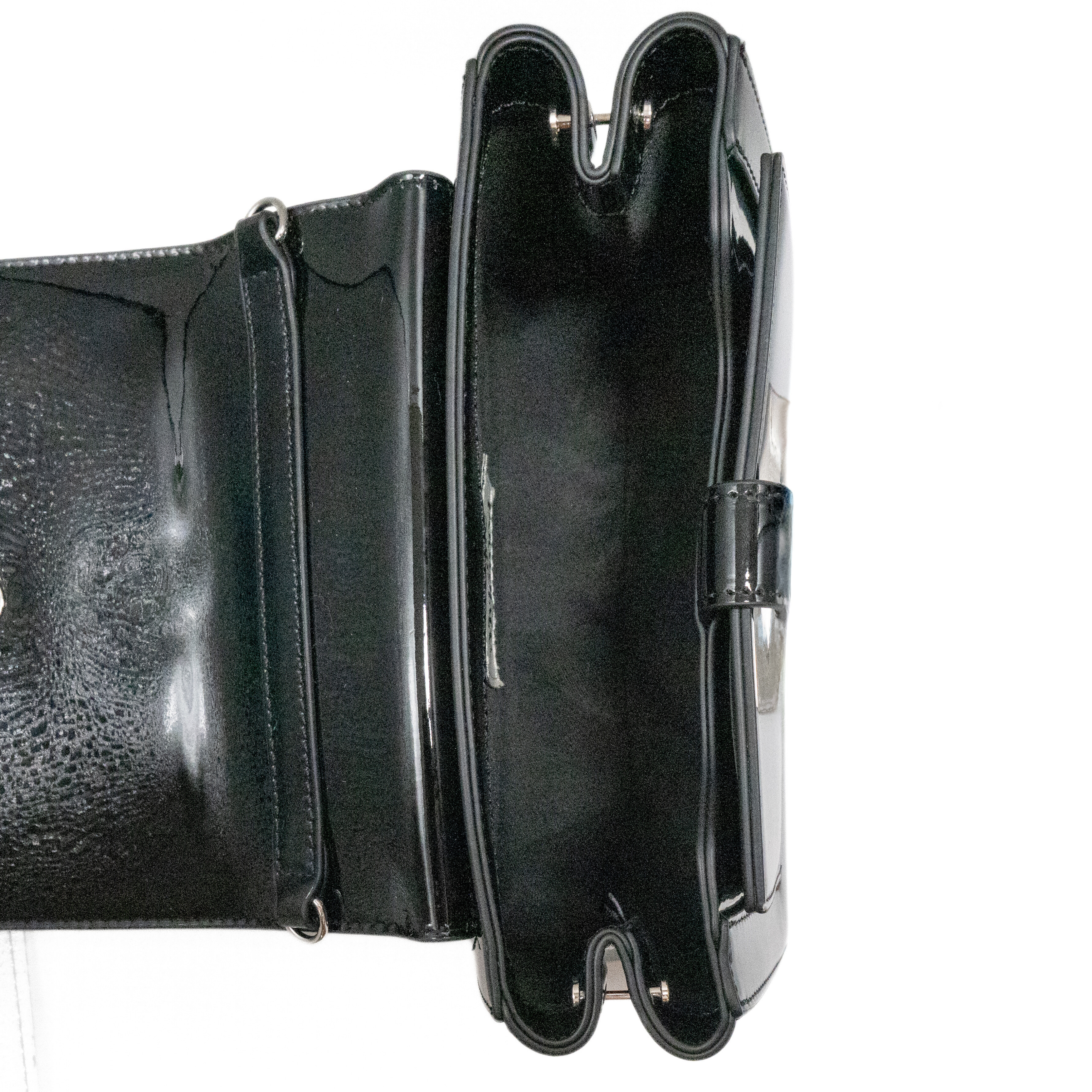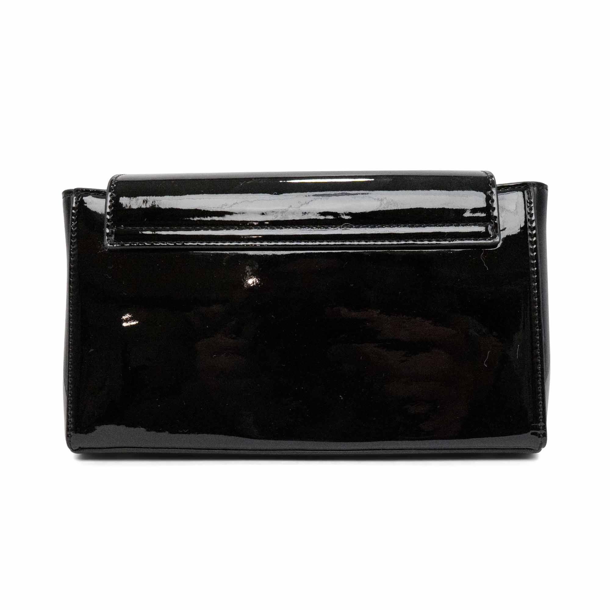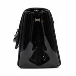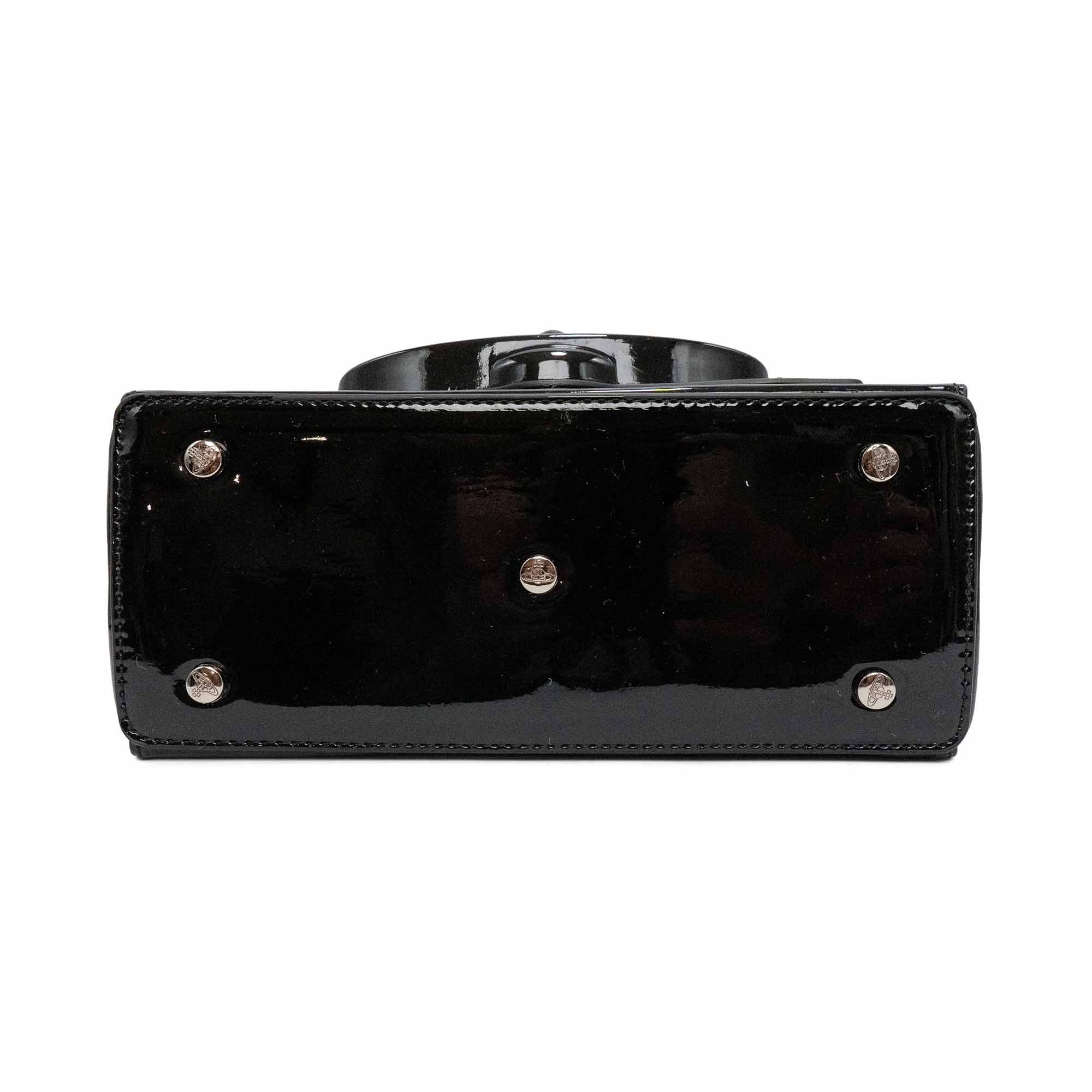 Vivienne Westwood 'Hazel' shoulder bag in black patent leather with a large orb decal on the front flap and a magnetic snap closure. Features a removable patent leather shoulder strap and chain crossbody strap. Interior features black canvas lining and an extra flap underneath the front flap with three card slots and a small compact mirror.