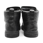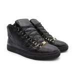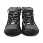 Balenciaga 'Arena' high-top sneakers in black crackled leather with black rubber soles and soft gold hardware.