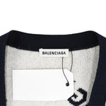 Balenciaga cardigan in navy wool with an all-over white monogram knit pattern with two welt pockets and front button-down closure.