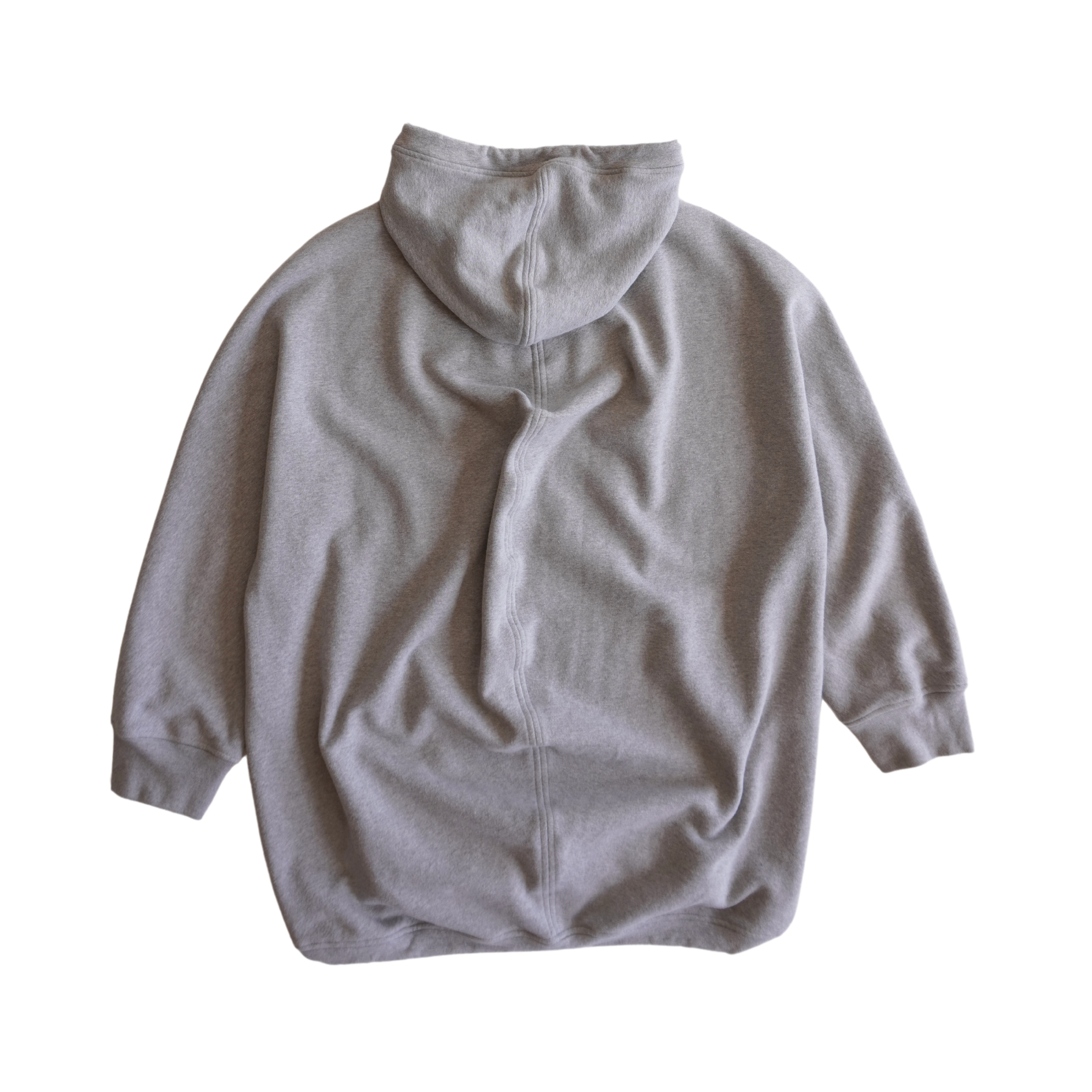 Balenciaga oversized hoodie dress in grey cotton with a black logo on the chest, a drawstring hood, and a drawstring at the hem.