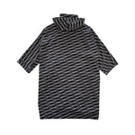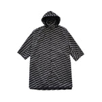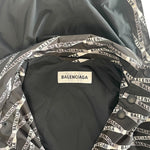 Balenciaga oversized trench rain jacket in black nylon with an all-over grey and white monogram ribbon print, front snap button closures in black hardware, zip pockets, and a drawstring hood.