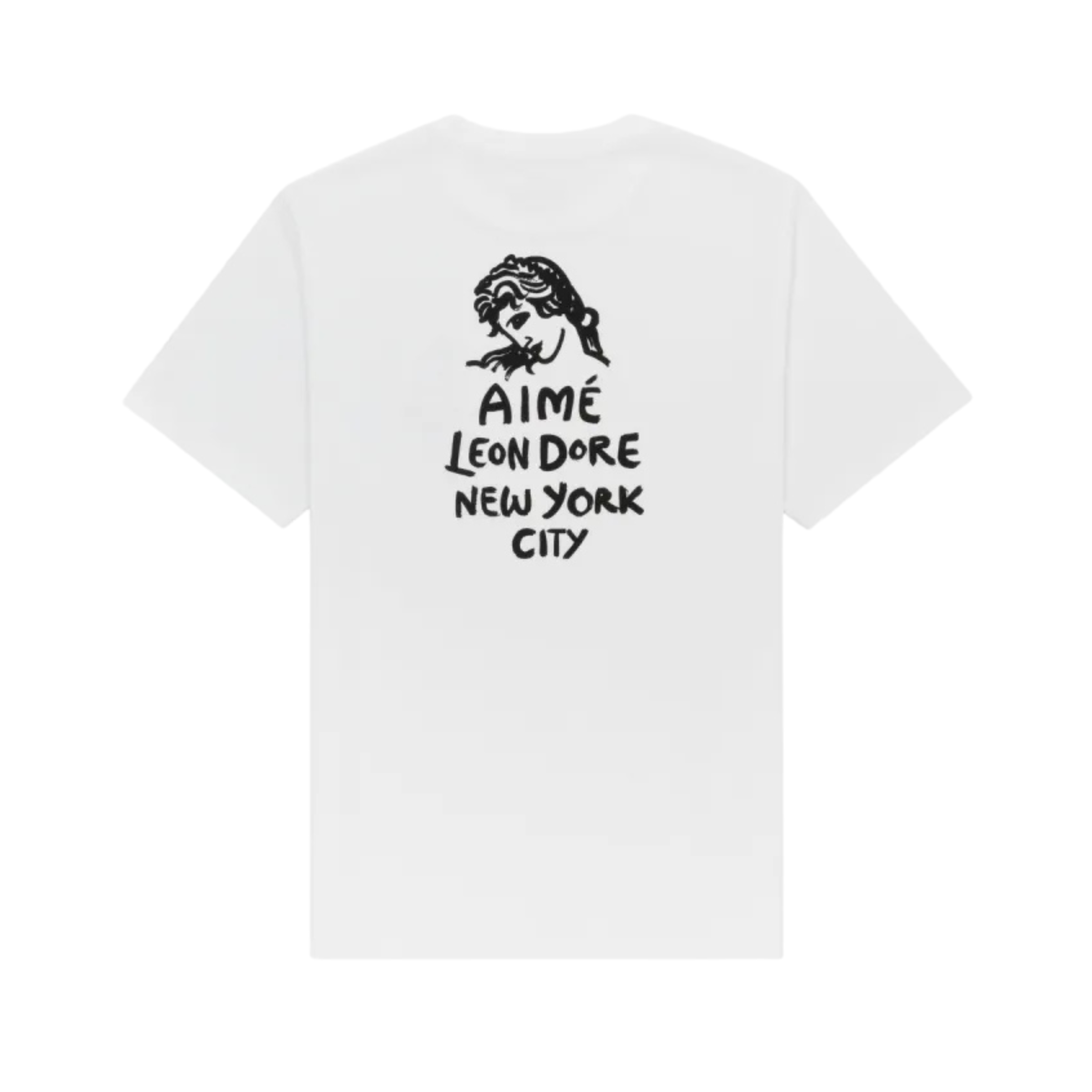 Aime Leon Dore 'Form Logo' t-shirt in white cotton with a black venus outline and logo graphic on the chest and back.