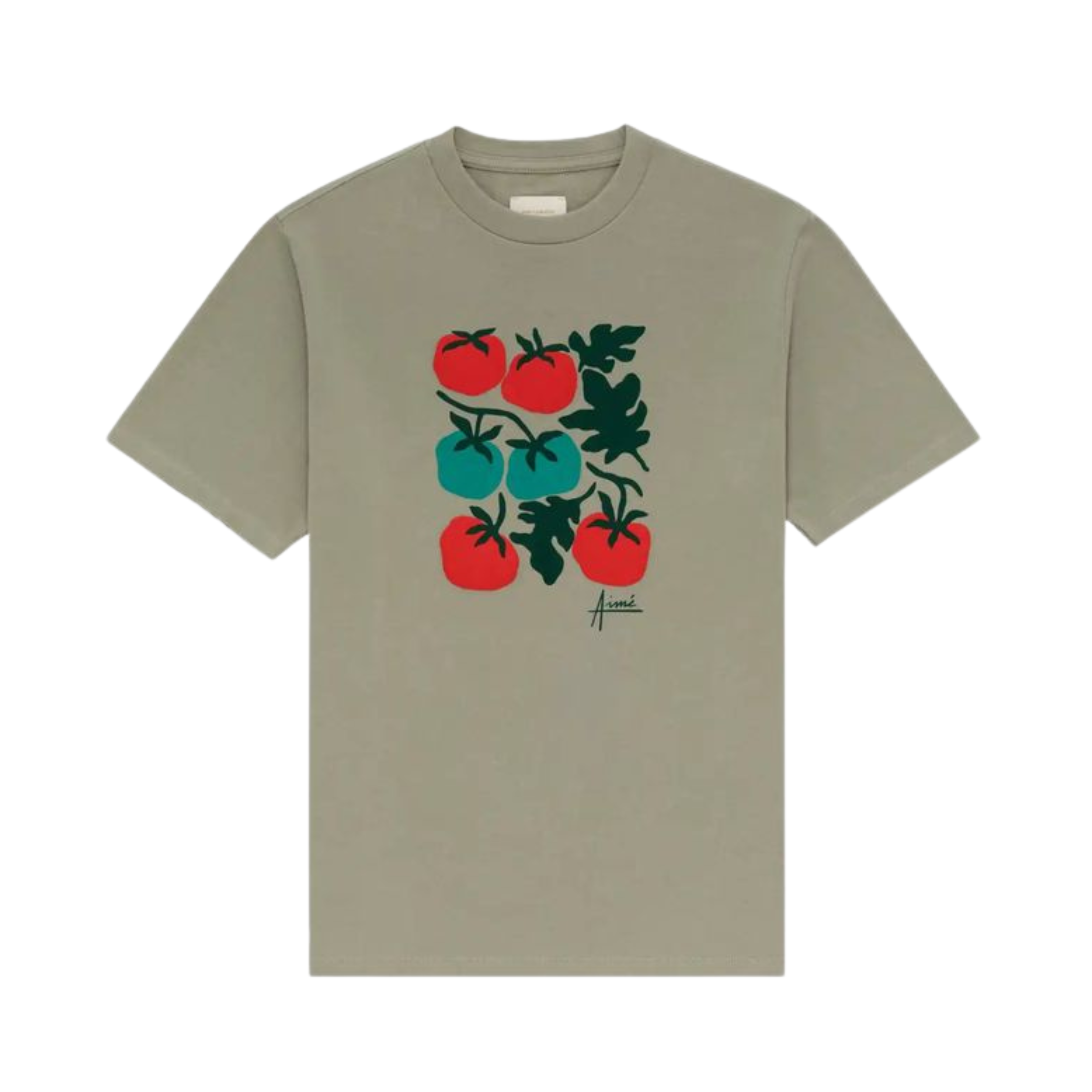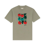 Aime Leon Dore 'Tomato' t-shirt in pale green cotton with a red and green tomato graphic on the chest.