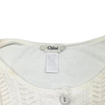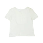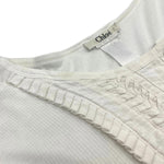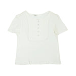 Chloe top in lightweight white ribbed cotton with a scoop neckline, ruffle detailing on the chest, and a front button closure.