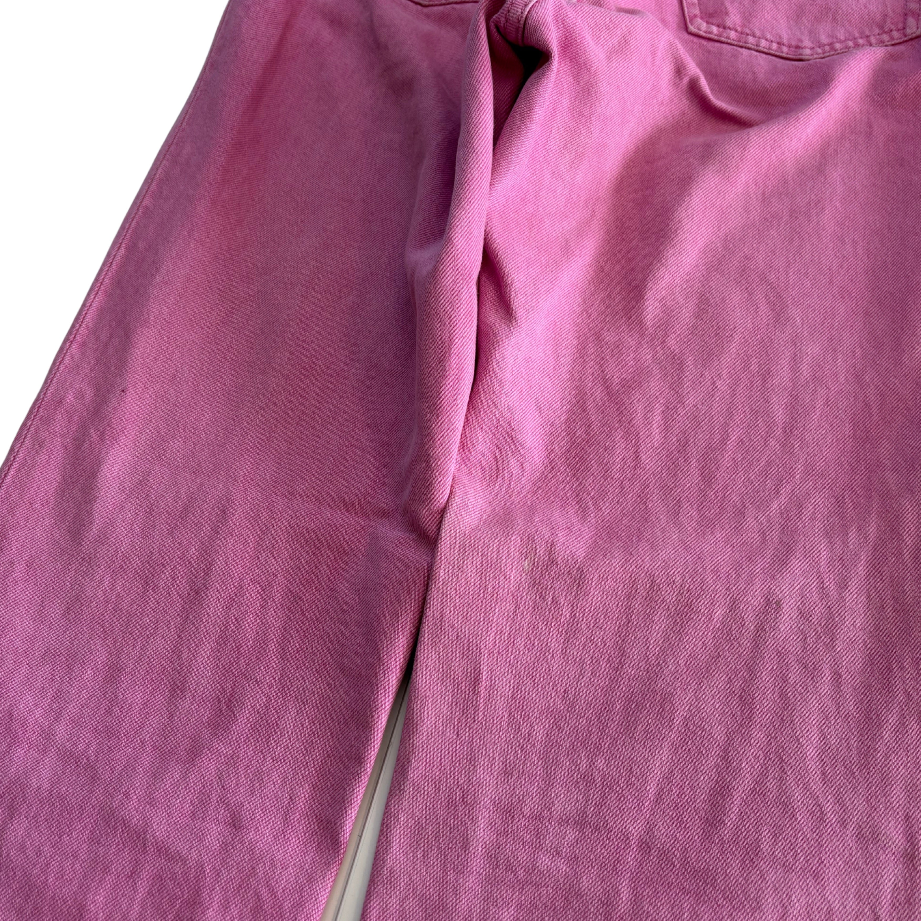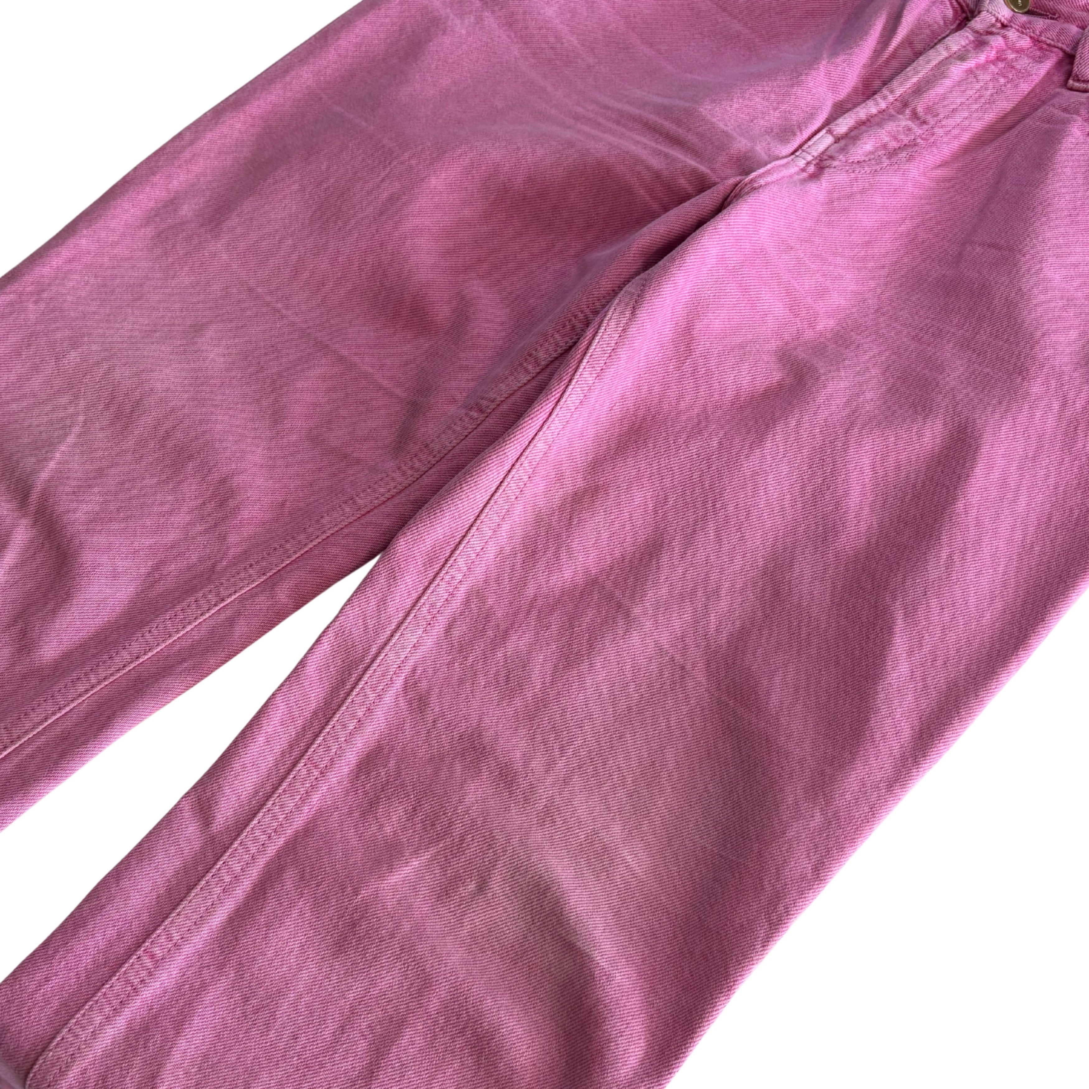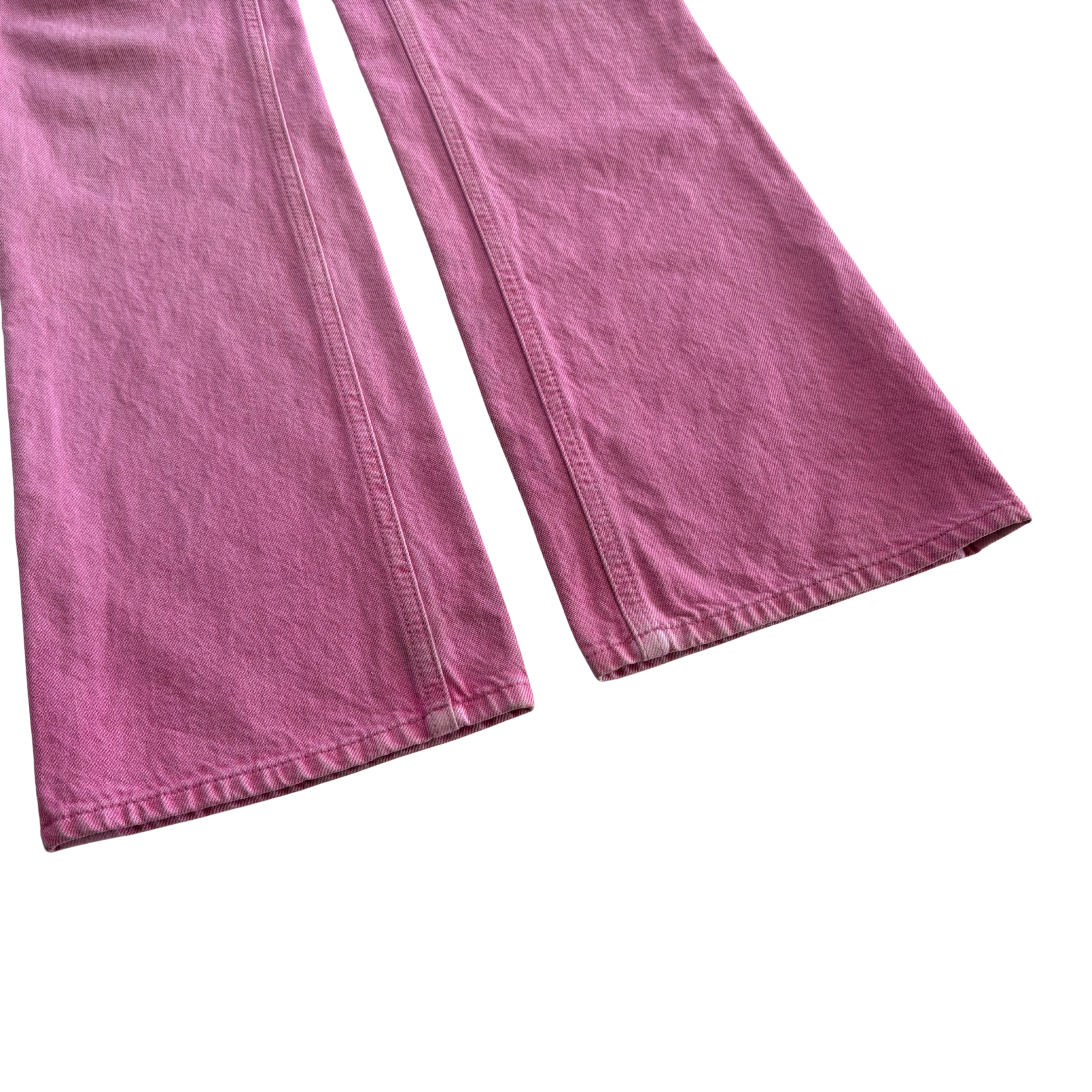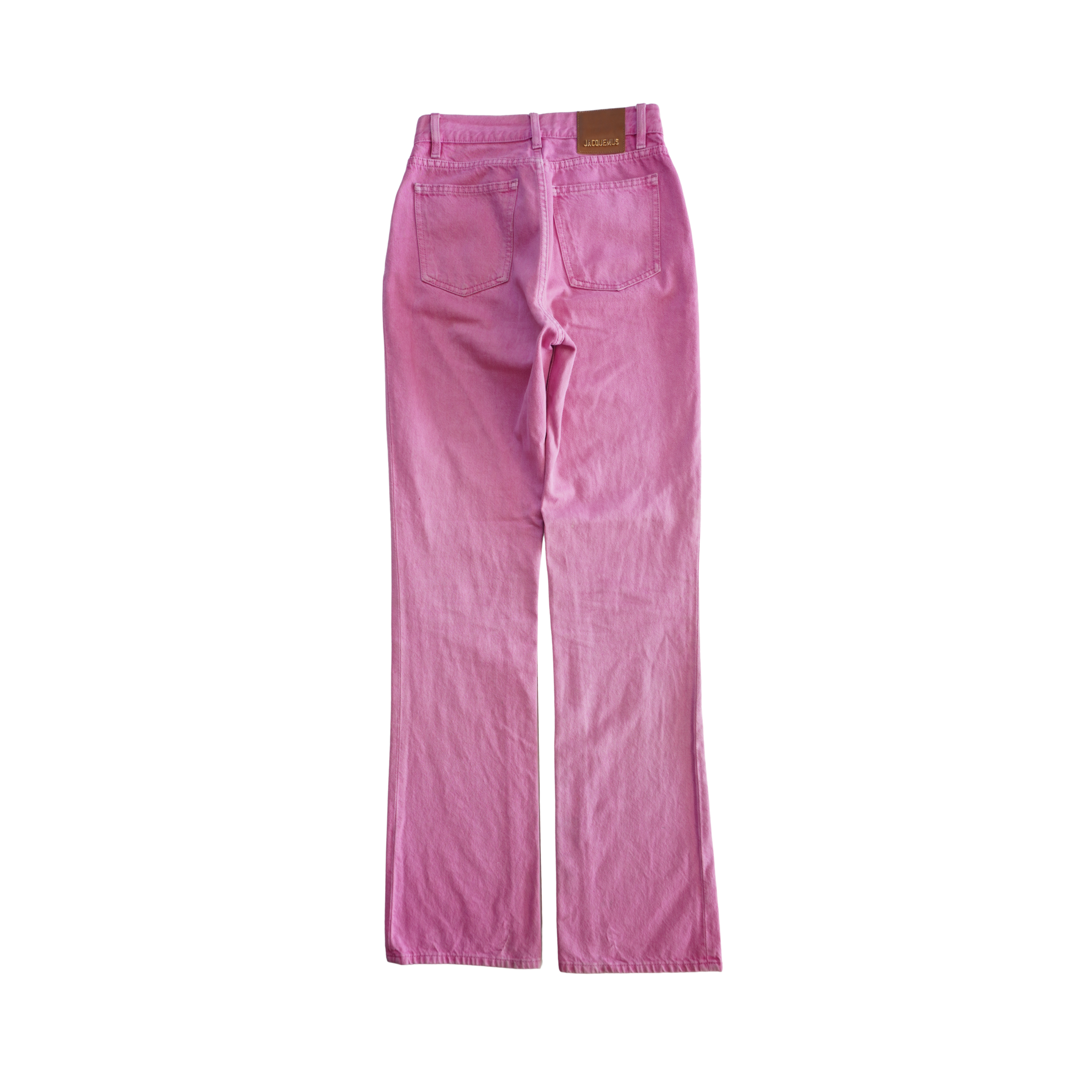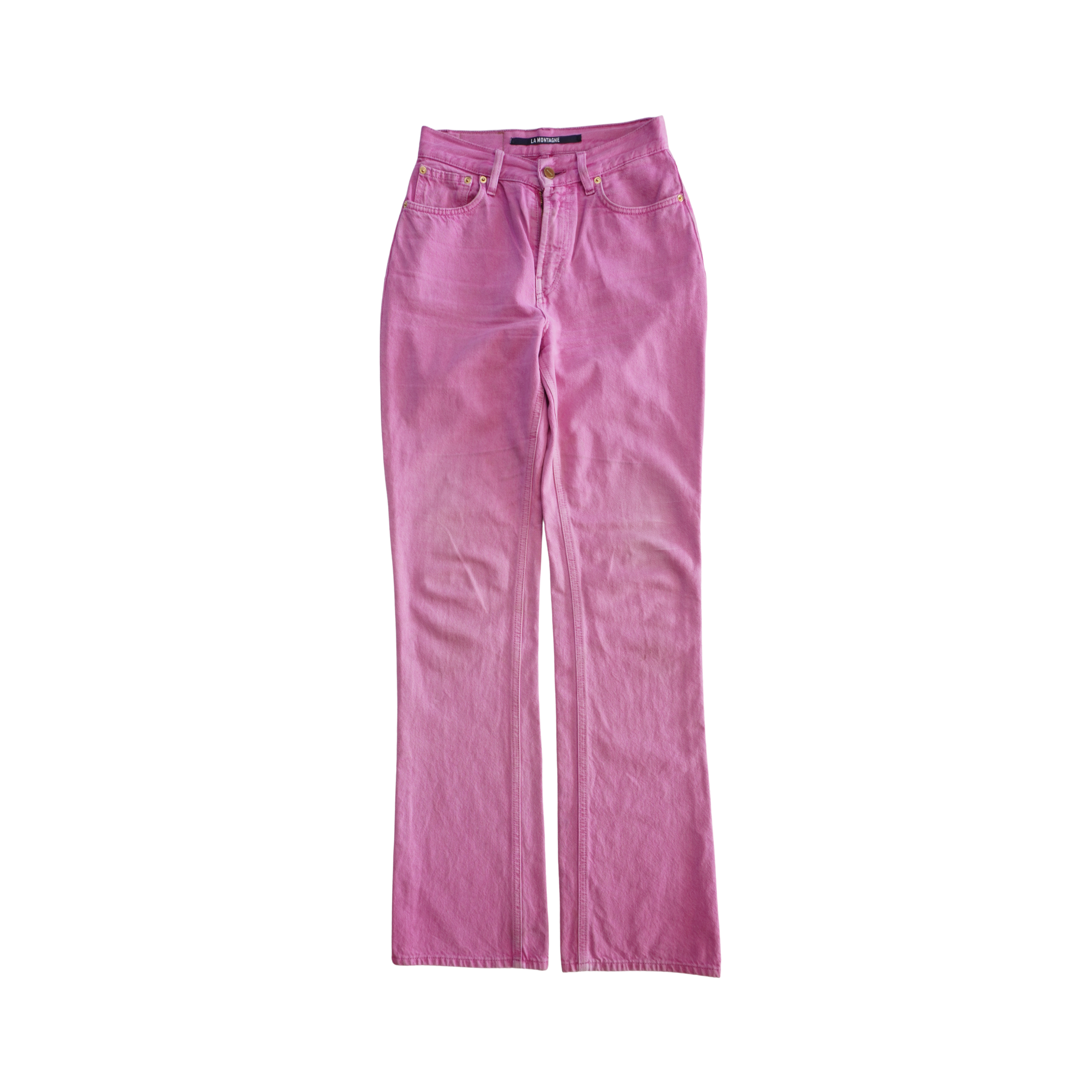 Jacquemus 'La Montagne' high-waisted jeans in washed pink denim with gold button hardware, a brown leather logo patch at the back waist, and a straight leg.