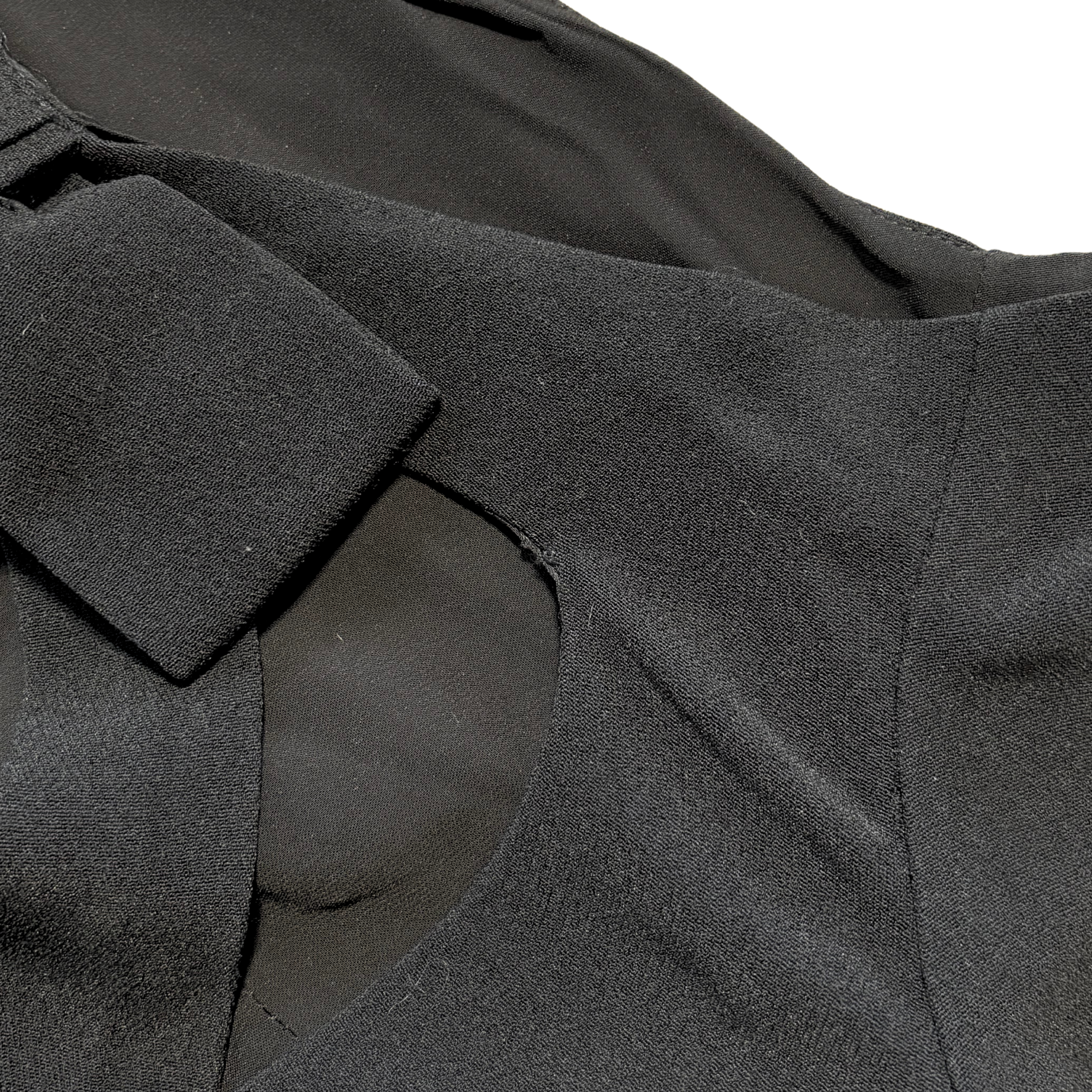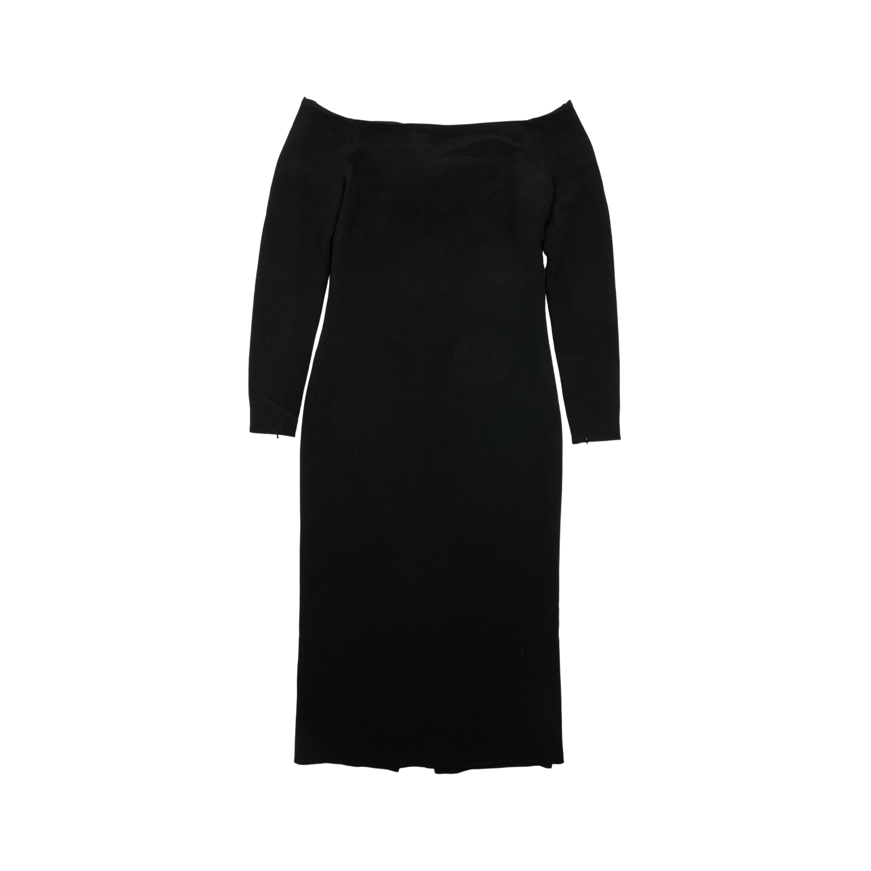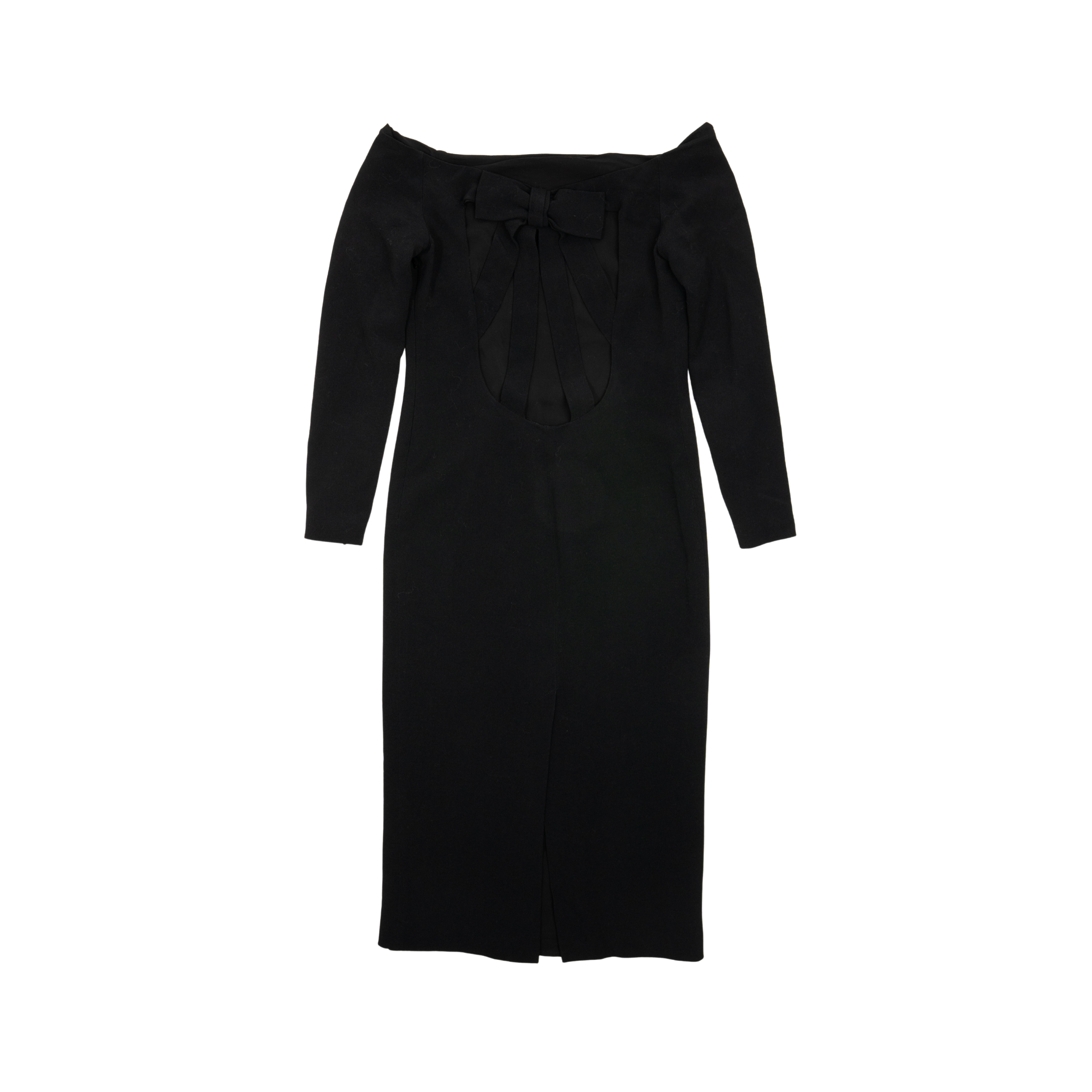 Burberry mid-length off-the-shoulder dress in black crepe with 3/4" sleeves with zipper slits and a large back bow cutout.