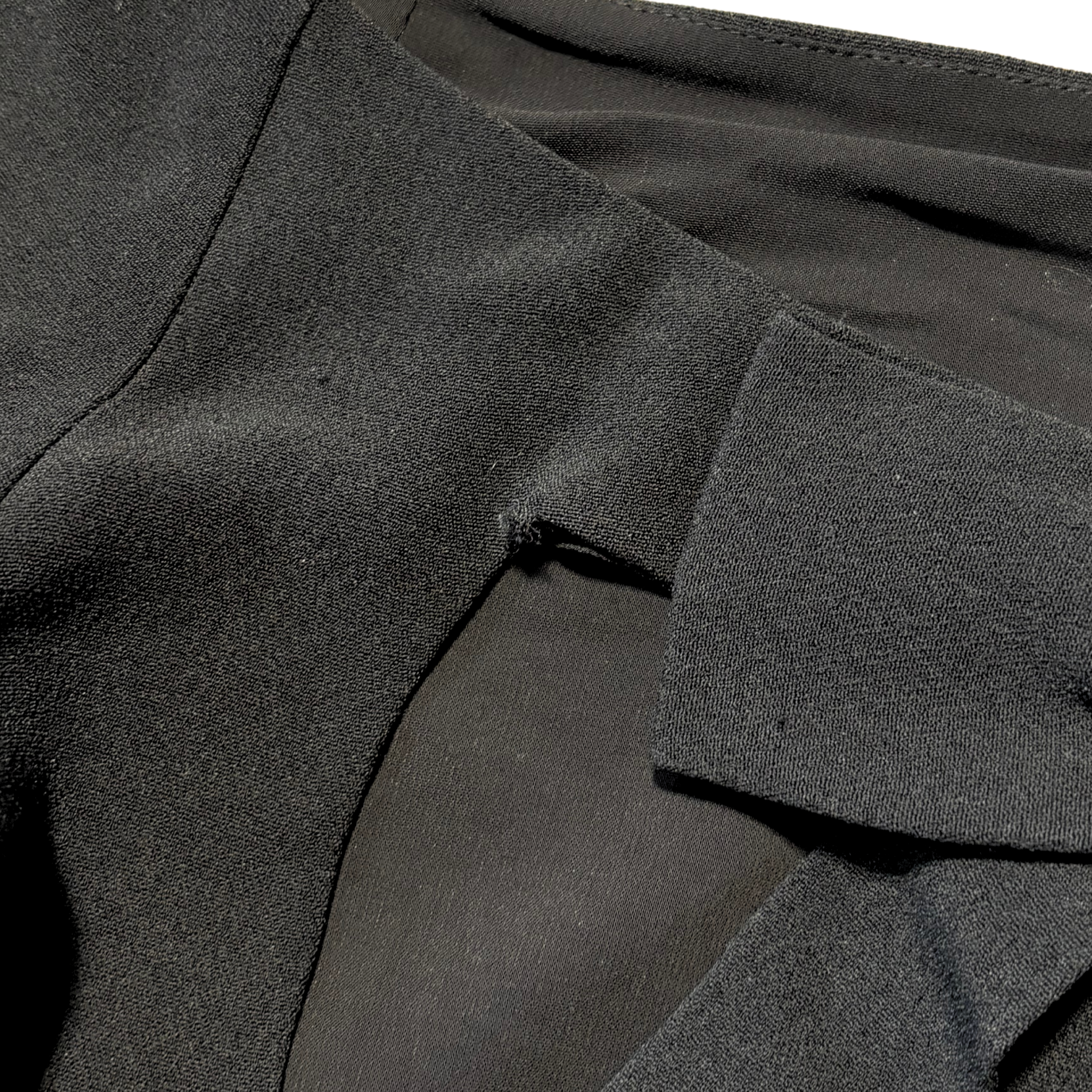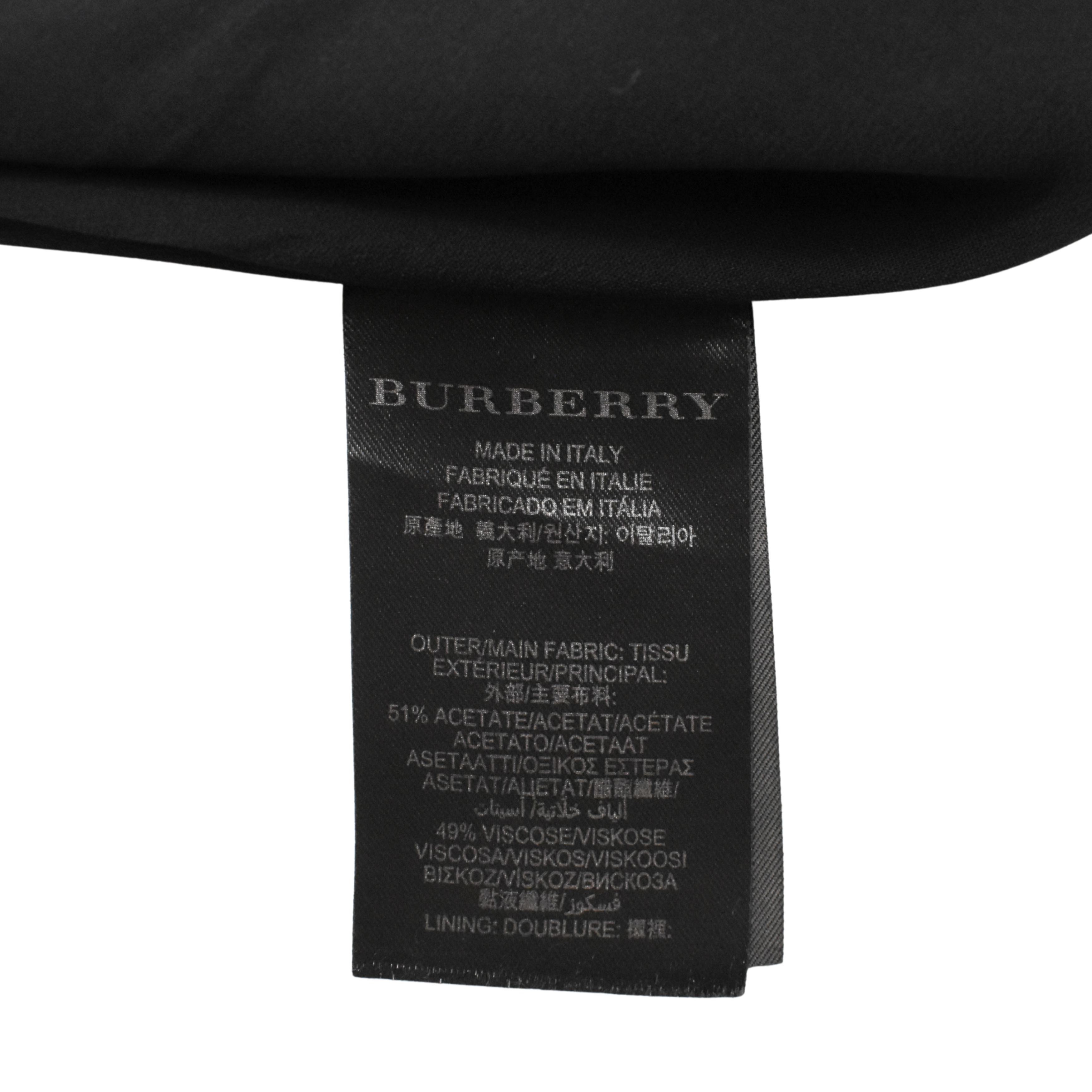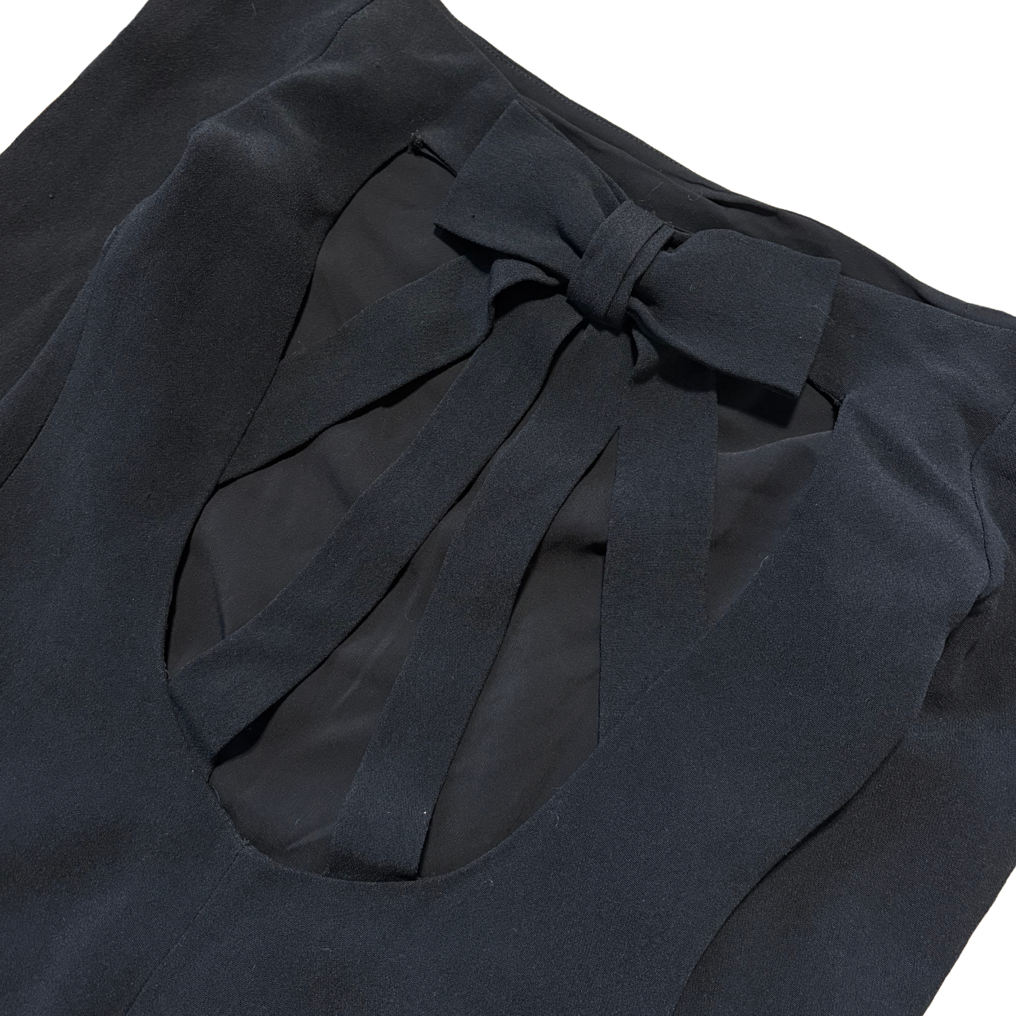 Burberry mid-length off-the-shoulder dress in black crepe with 3/4" sleeves with zipper slits and a large back bow cutout.