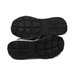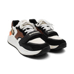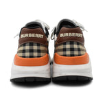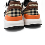 Burberry 'Regis' sneakers in black suede and rubber with white mesh, brown leather, orange rubber, and beige novacheck canvas panelling. The shoes have a chunky rubber sole, white laces, and a velcro toe strap with a logo graphic across.
