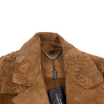 Burberry Prorsum mid-length jacket in tan brown suede with a notched collar. Features whipstitch detailing on the collar and shoulders, fringe on the back, side slip pockets, and a buckle waist belt.