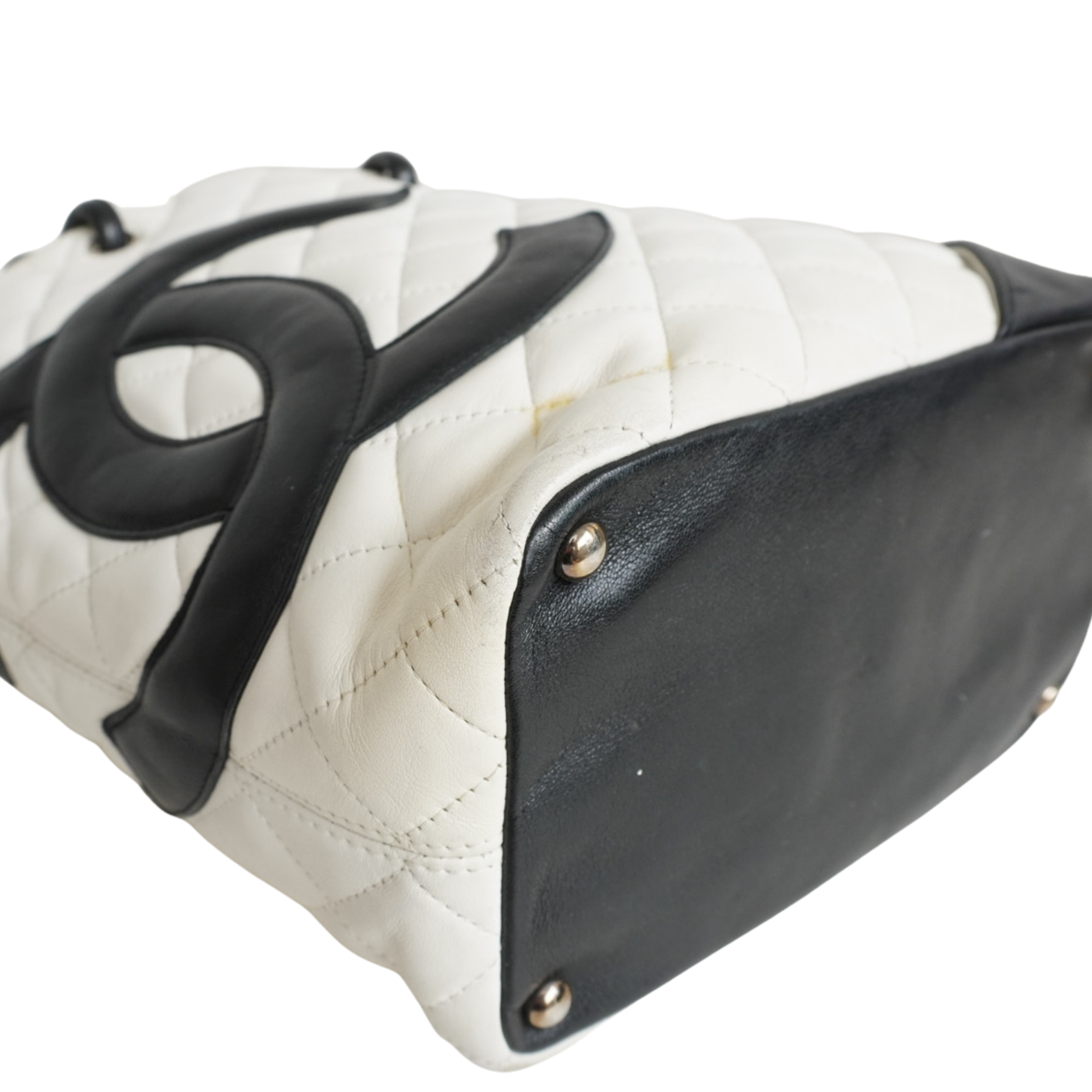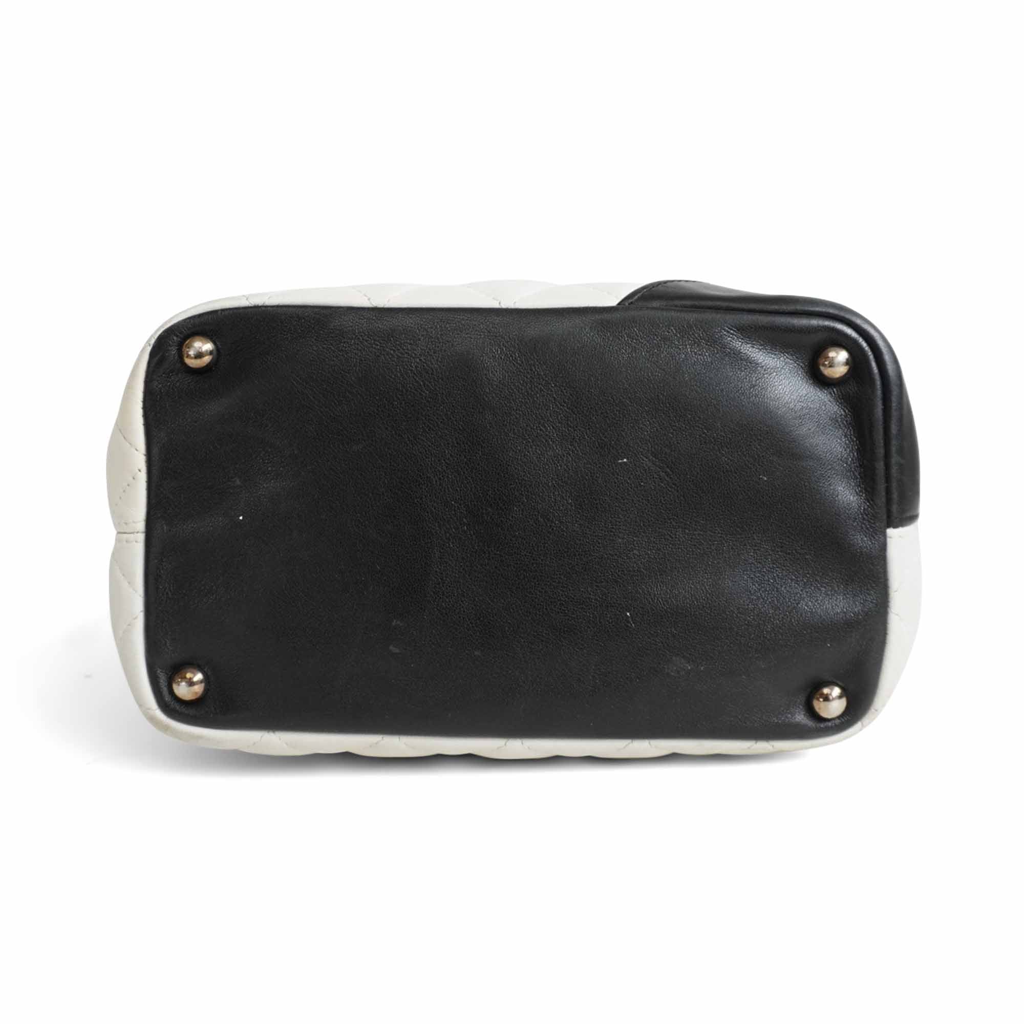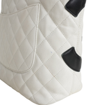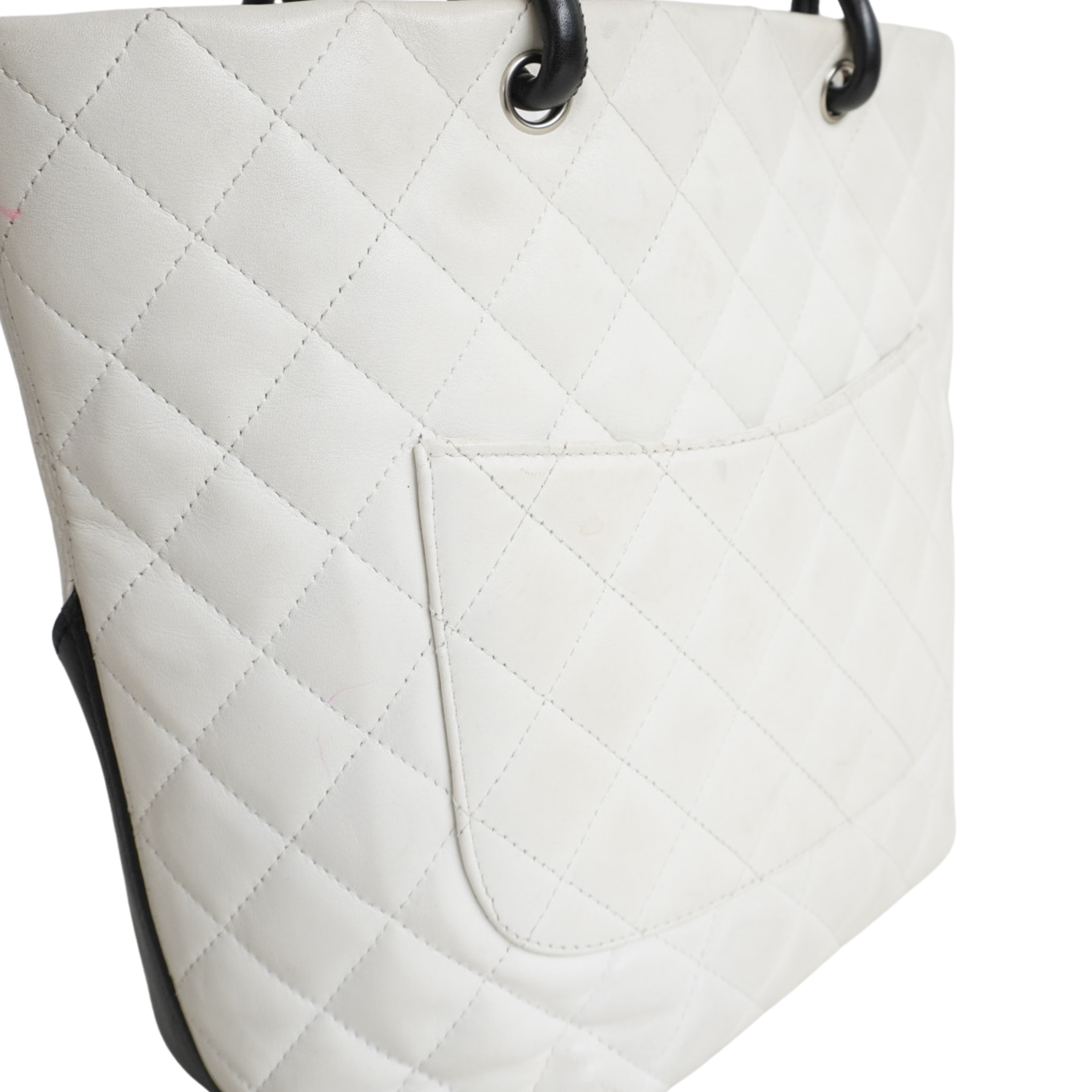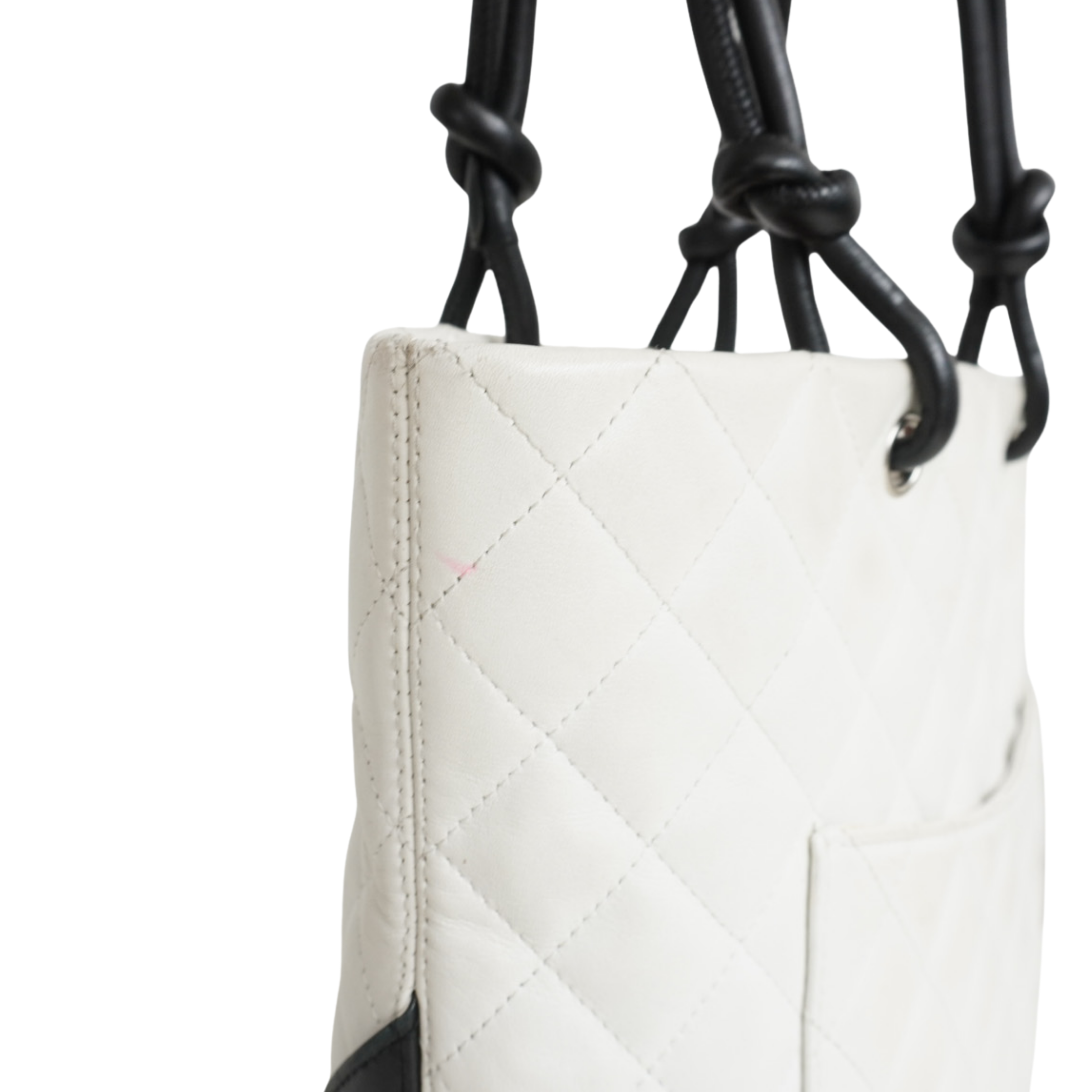 Chanel 'Cambon' bucket bag in white quilted leather with black leather CC patch, base, and double rolled handles. Features a neon pink monogram jacquard lining with inner zip closure and a slip pocket on the back side of the bag.