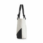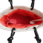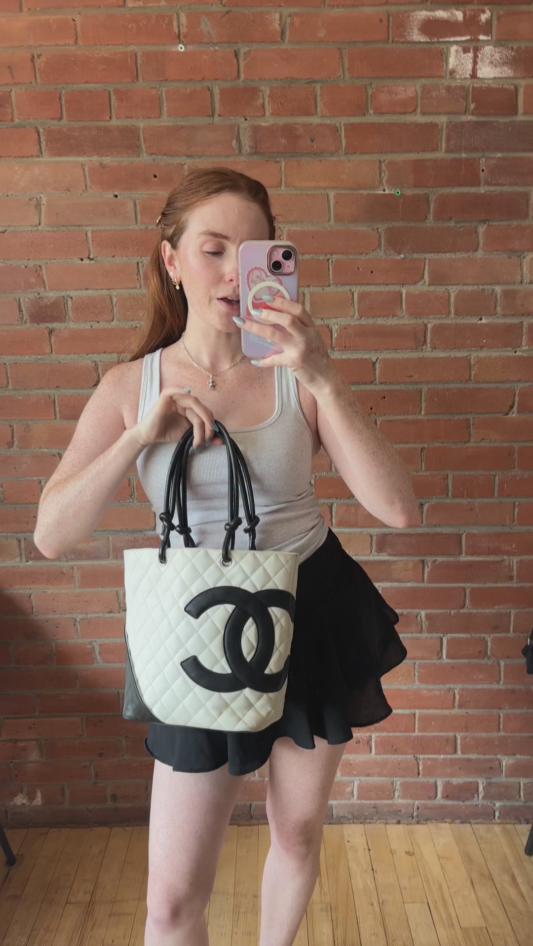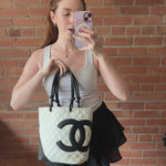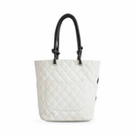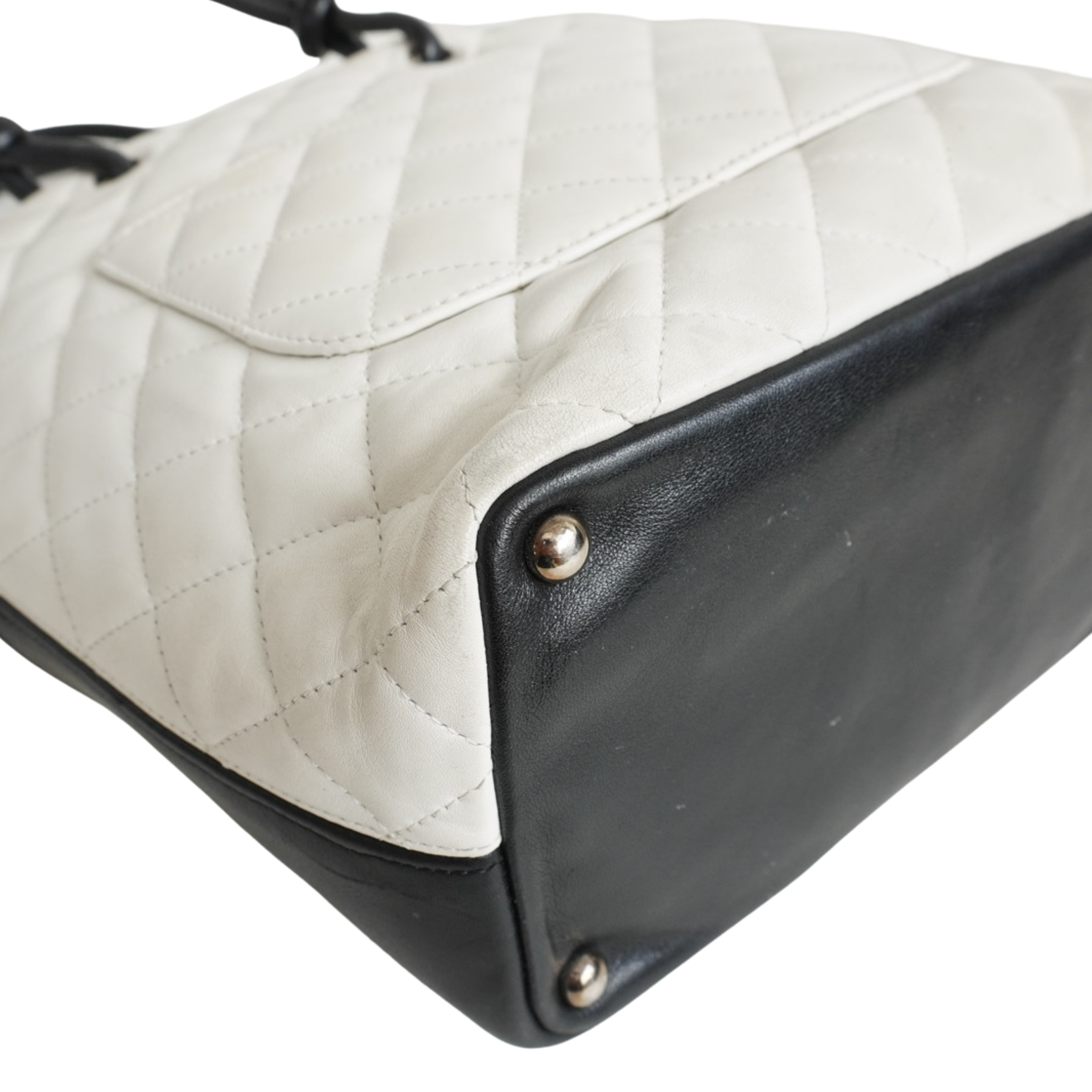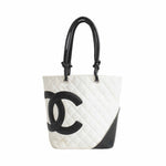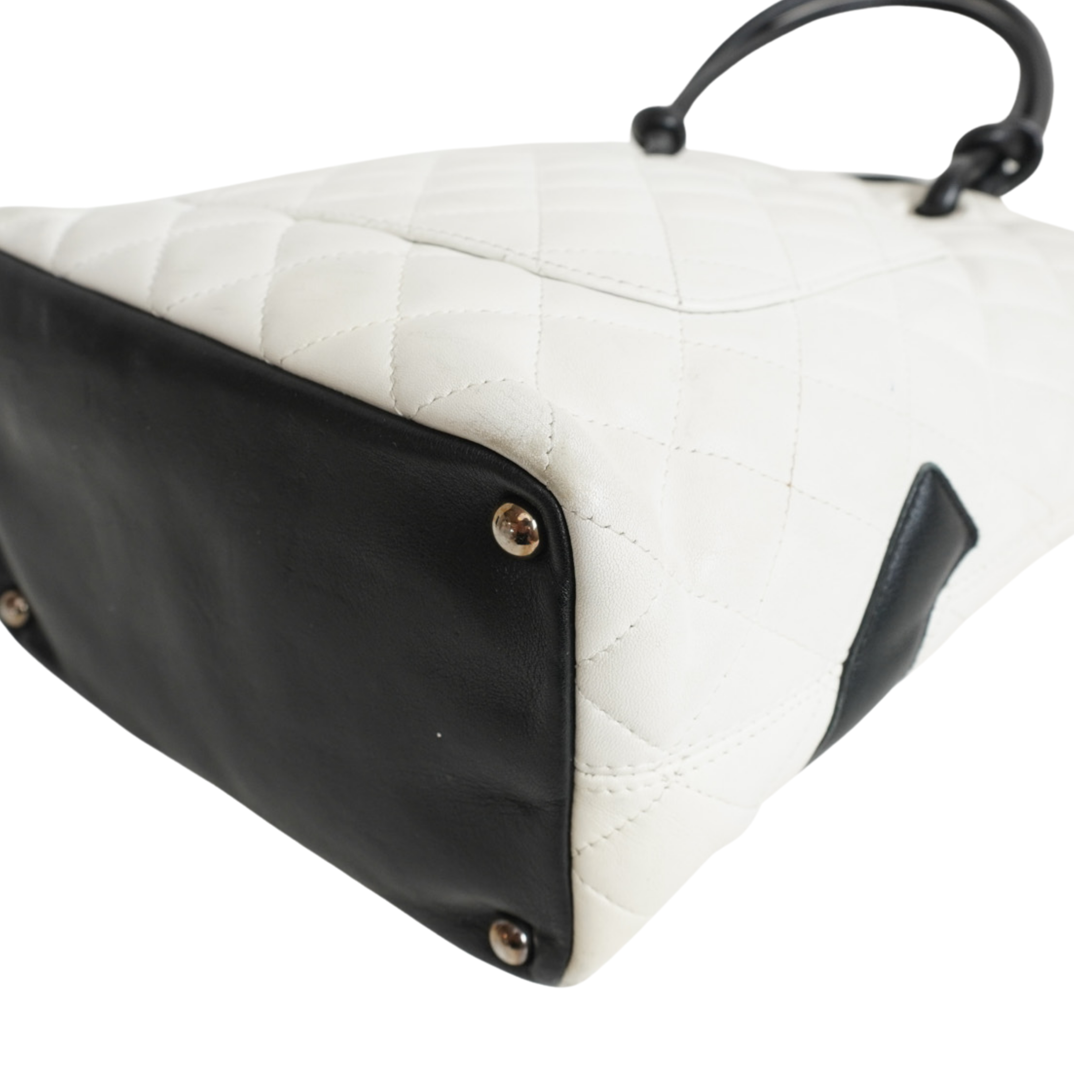 Chanel 'Cambon' bucket bag in white quilted leather with black leather CC patch, base, and double rolled handles. Features a neon pink monogram jacquard lining with inner zip closure and a slip pocket on the back side of the bag.