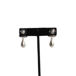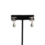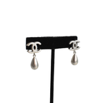 Chanel brushed silver drop earrings with 'CC' stud and teardrop pendant.