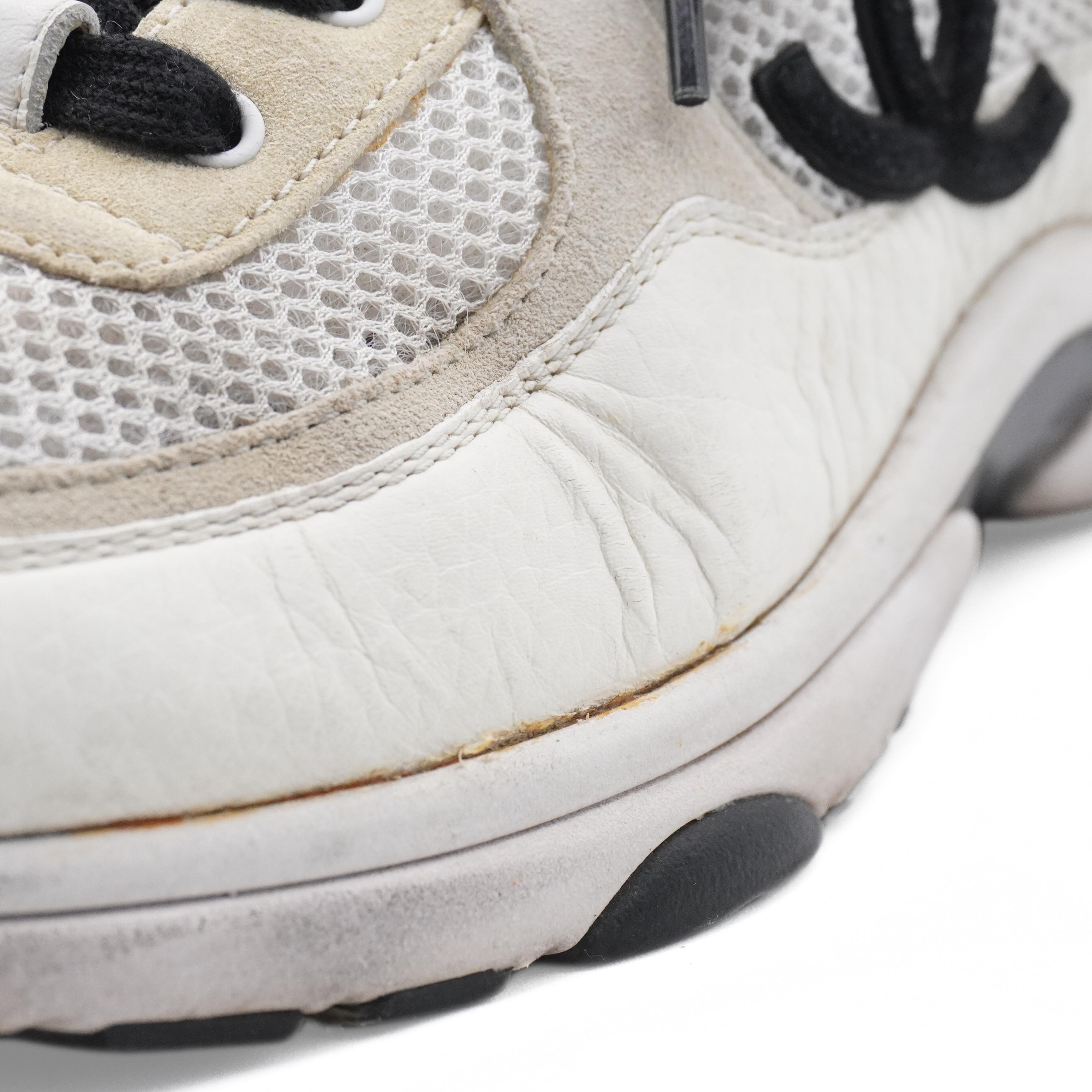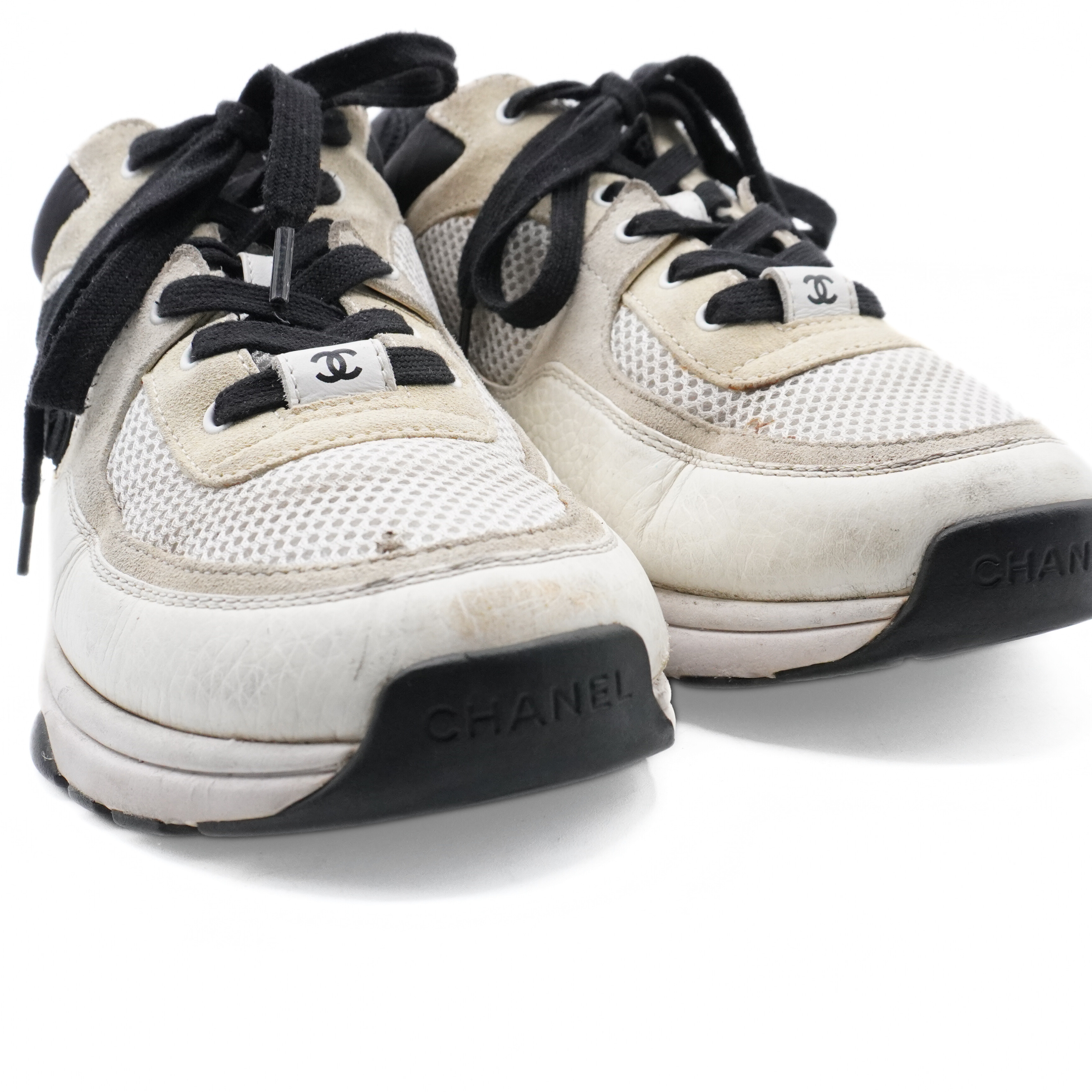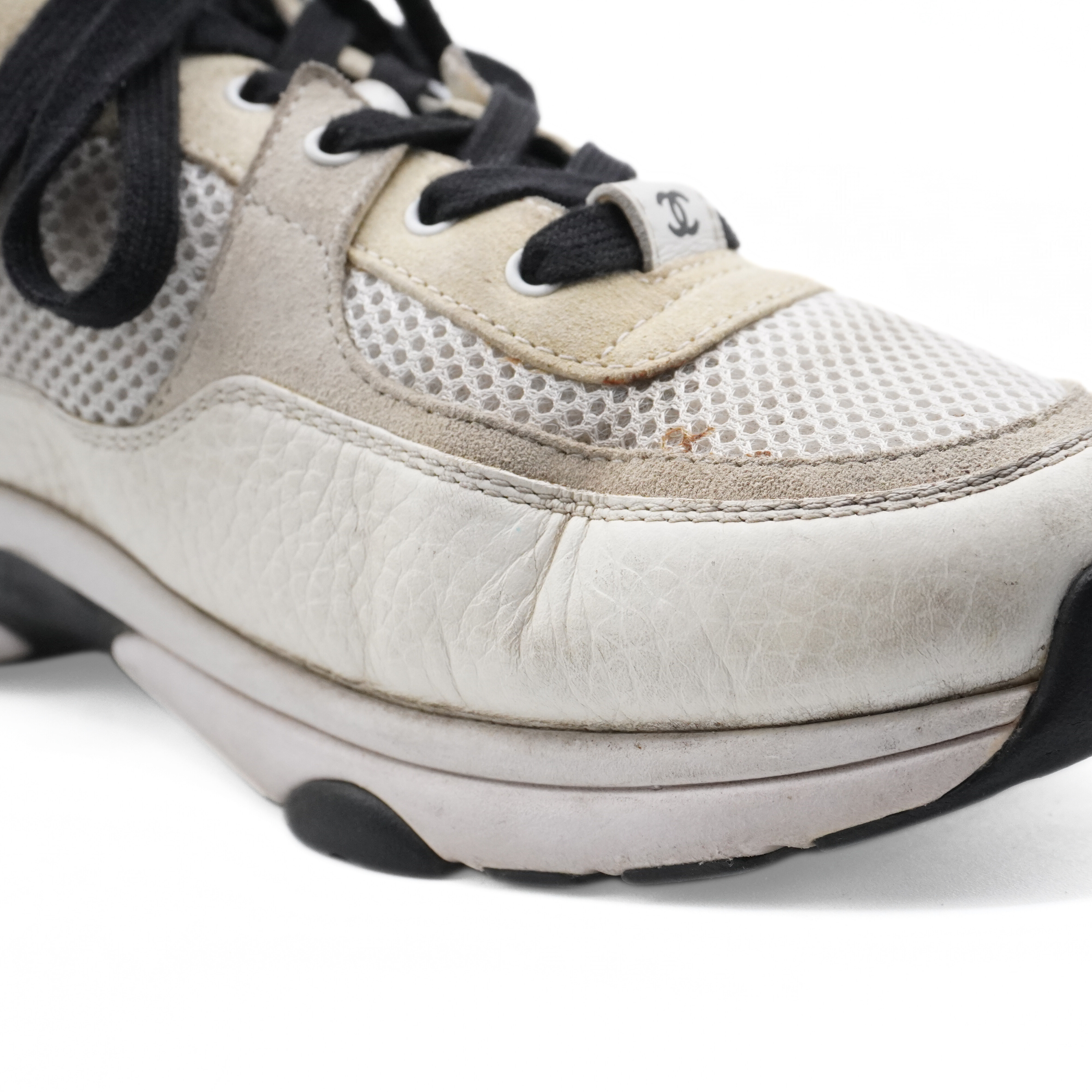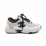 Chanel 'CC' sneakers in cream, black, and beige mesh, leather and suede with a black 'CC' emblem on the sides and a white and black rubber sole.