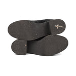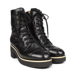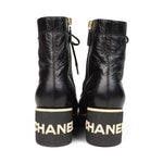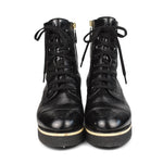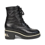 Chanel combat boots in black crinkled lambskin leather with beige trim, a rubber sole with logo text across the heel, and an embroidered 'CC' toe cap.