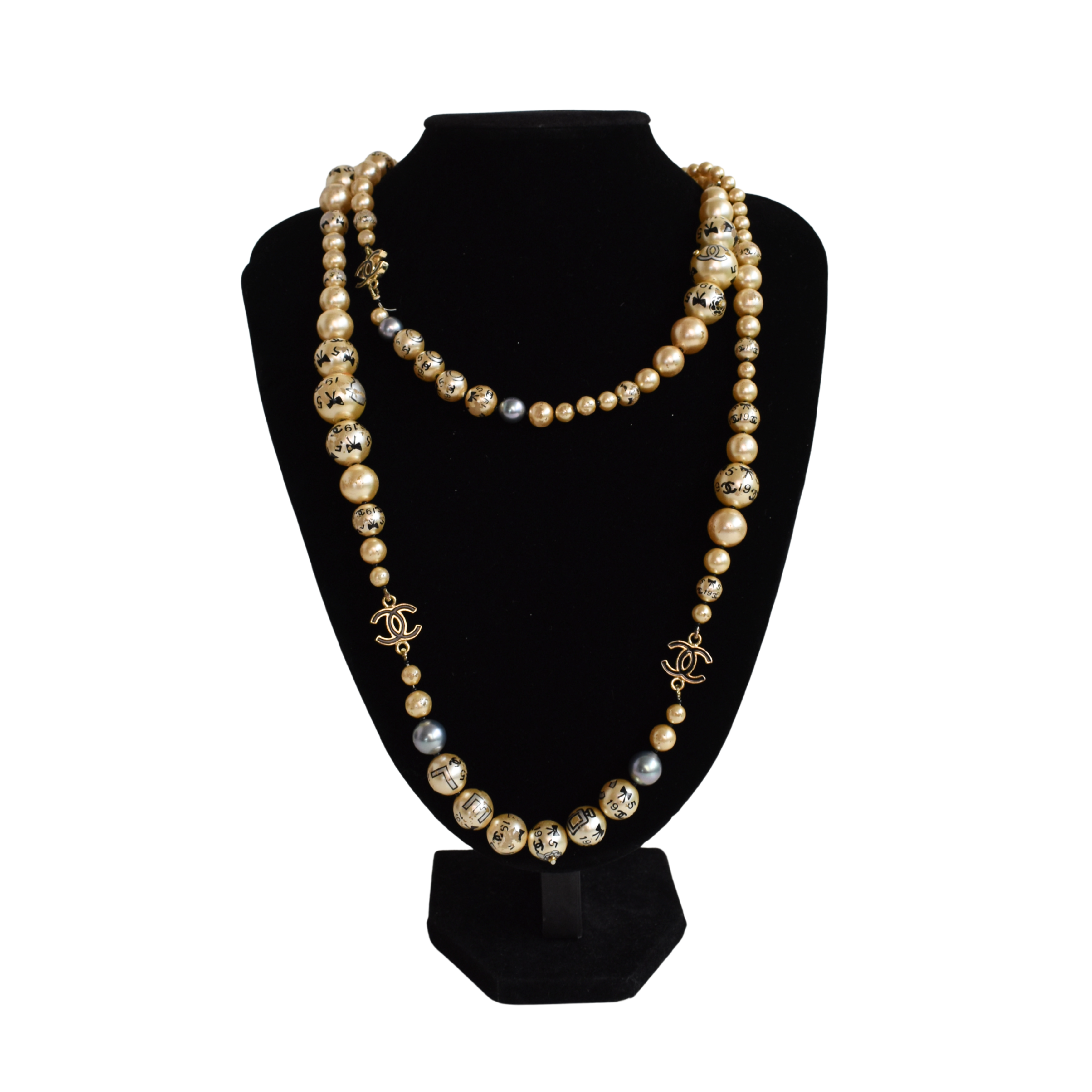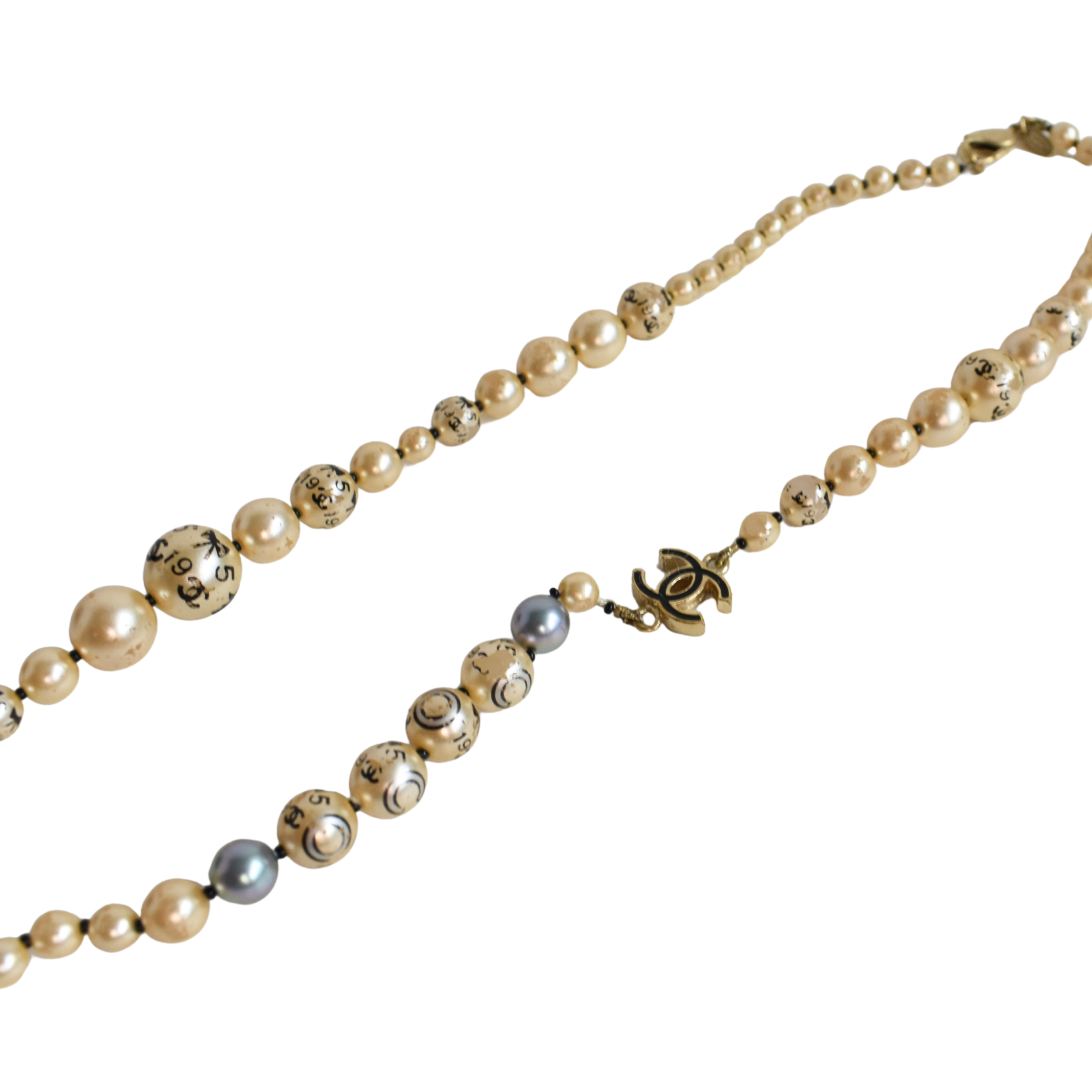 Chanel graduated imitation pearl necklace with gold and black enamel 'CC' links and house motifs doodled on the beads.