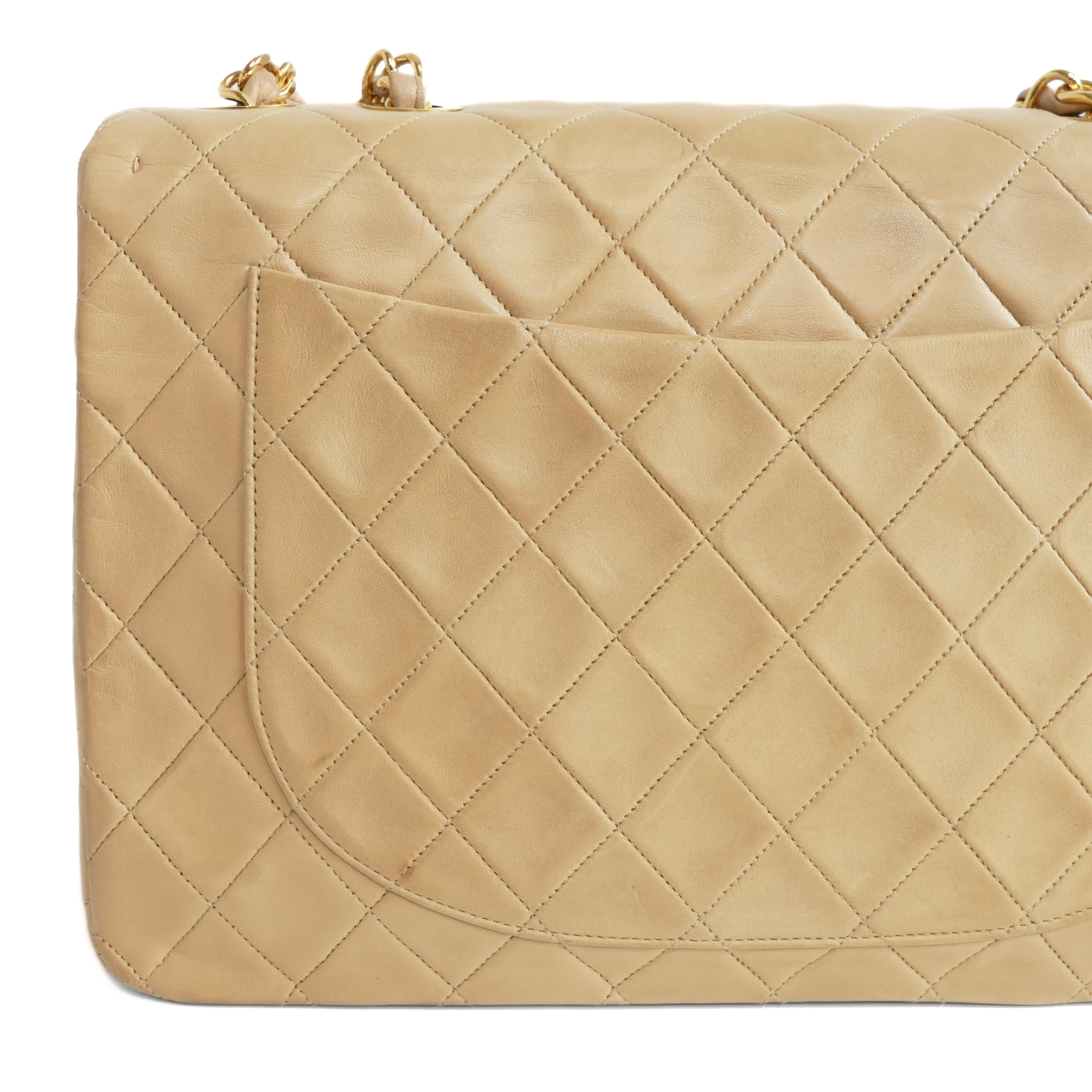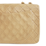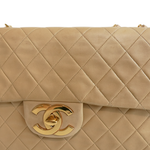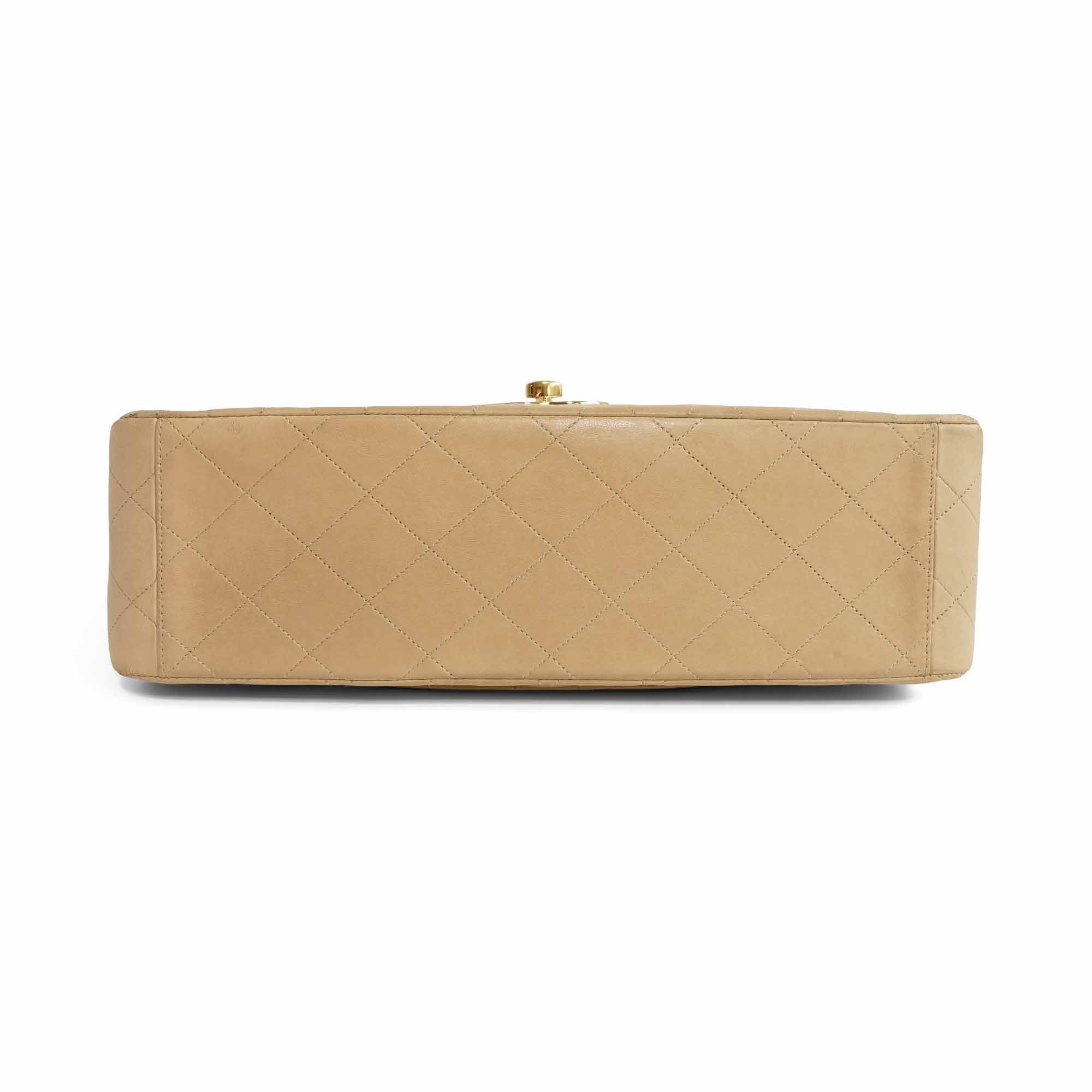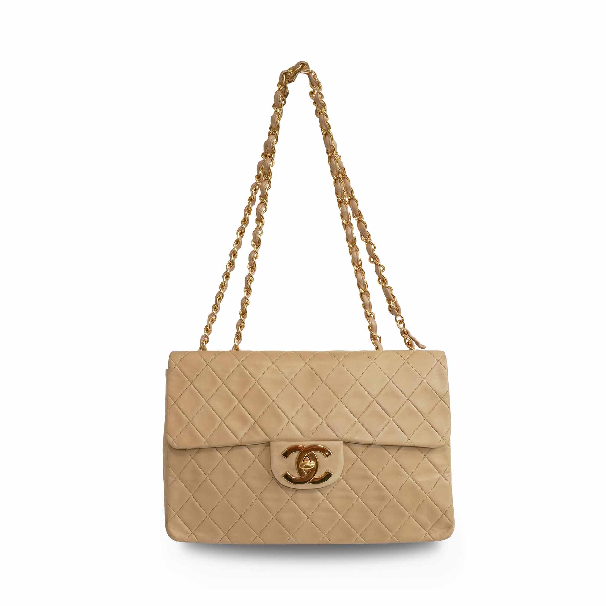 Chanel 'Jumbo Classic Flap' bag in diamond quilted beige lambskin leather with 22k gold plated hardware and a mademoiselle leather woven chain strap.. Features an interlocking CC turnlock closure, an interior flap with snap button, and leather lining with slip pockets. There is an additional slip pocket on the back of the back.
