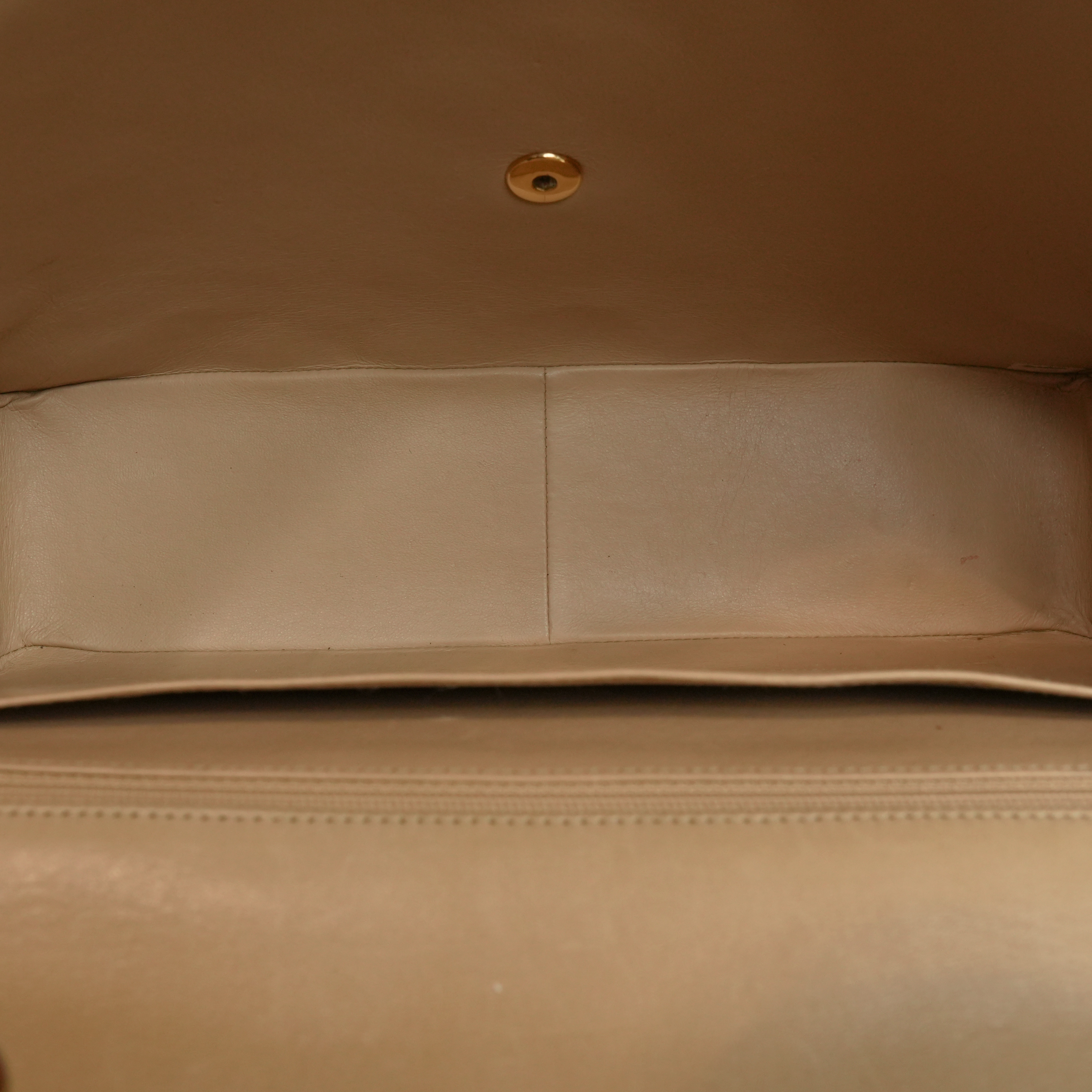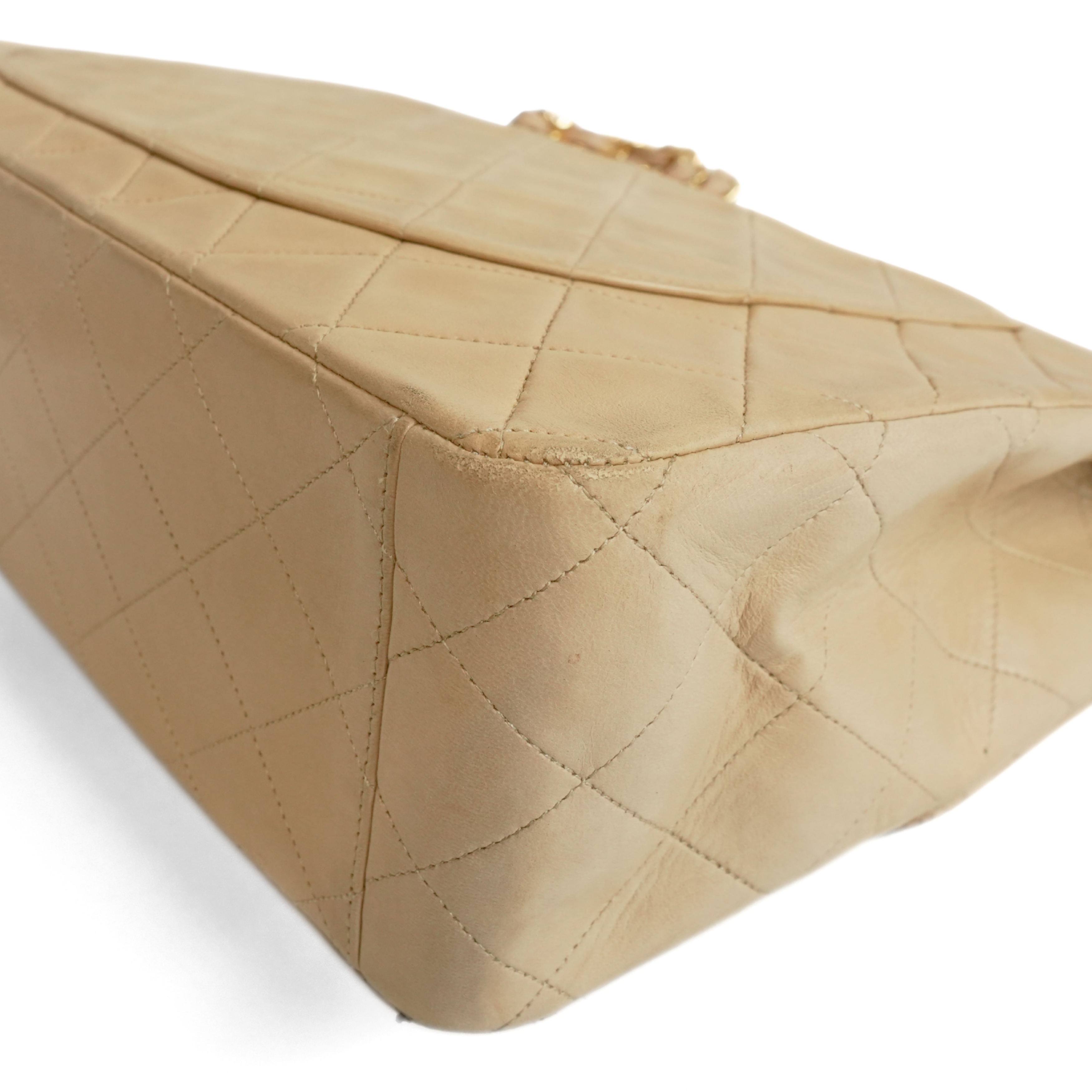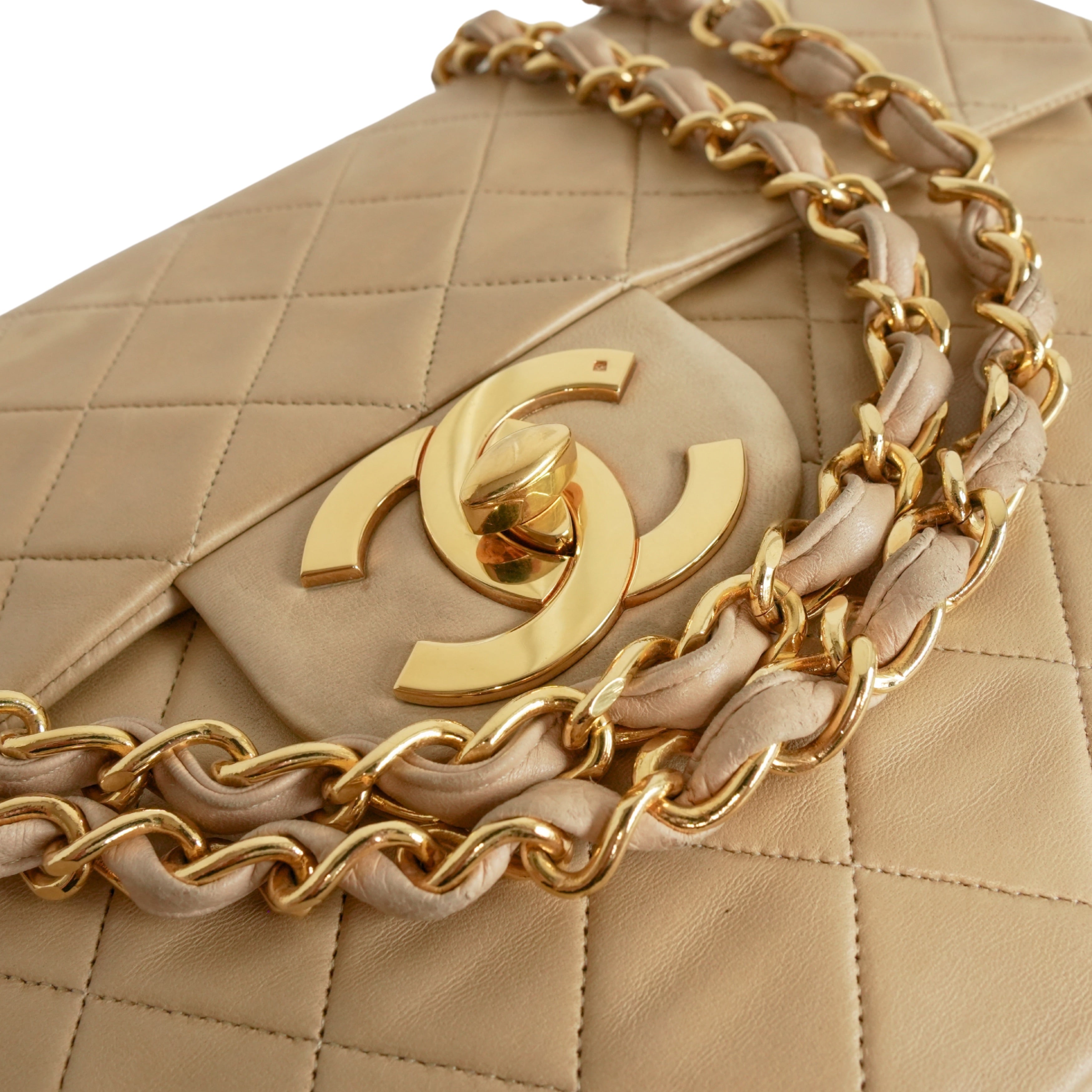 Chanel 'Jumbo Classic Flap' bag in diamond quilted beige lambskin leather with 22k gold plated hardware and a mademoiselle leather woven chain strap.. Features an interlocking CC turnlock closure, an interior flap with snap button, and leather lining with slip pockets. There is an additional slip pocket on the back of the back.