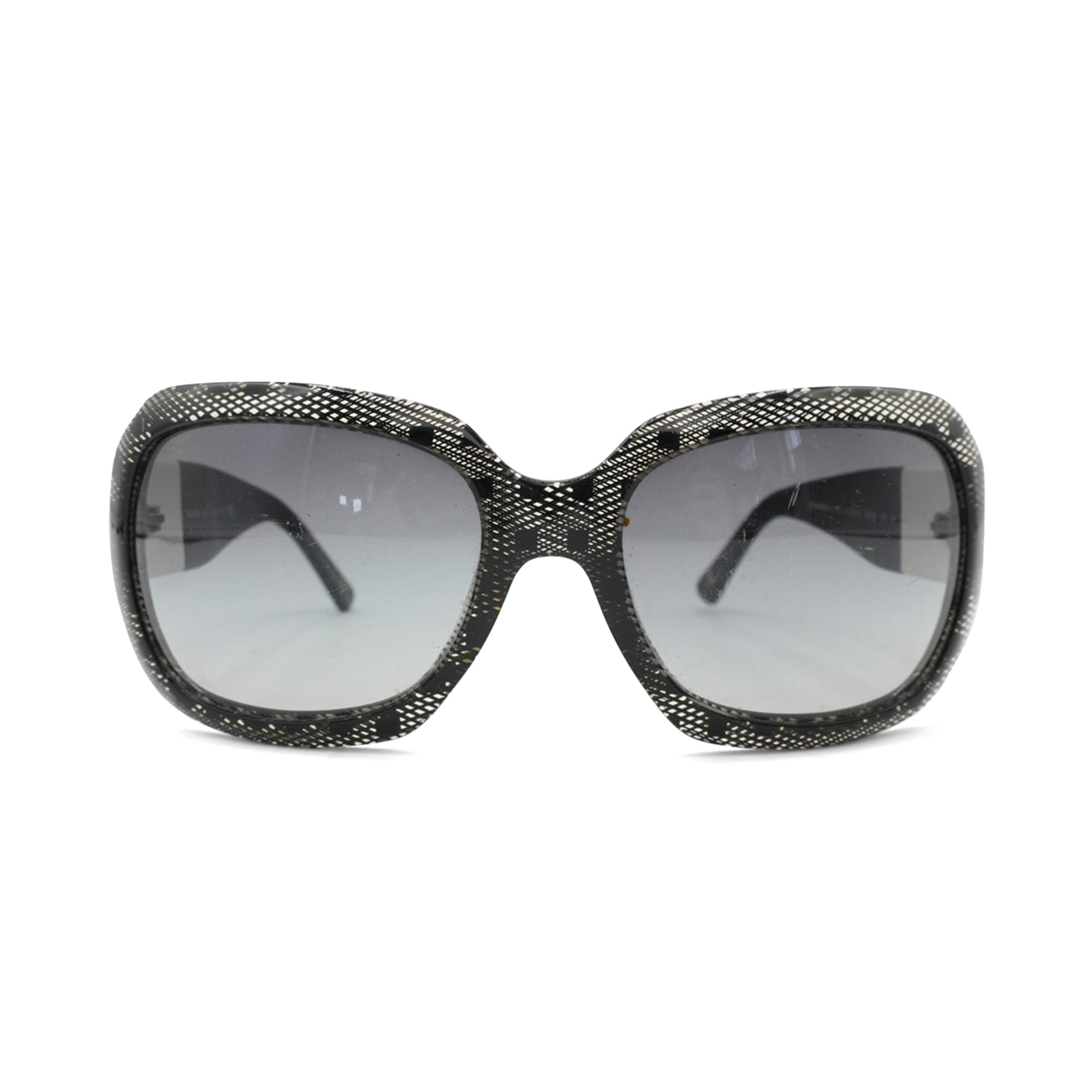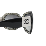Chanel oversized sunglasses with clear frames featuring black polka dot mesh print and a white CC panel on the arms.