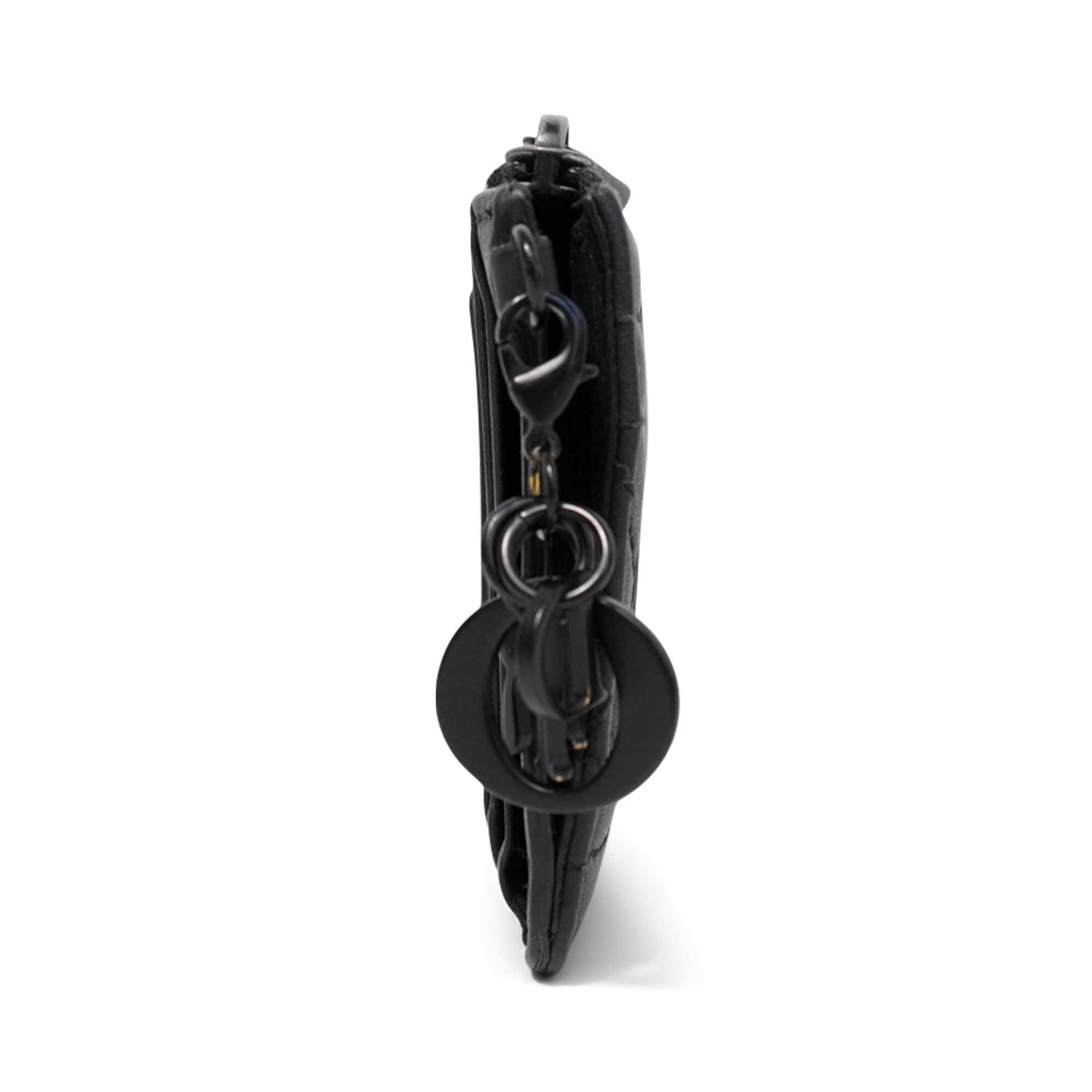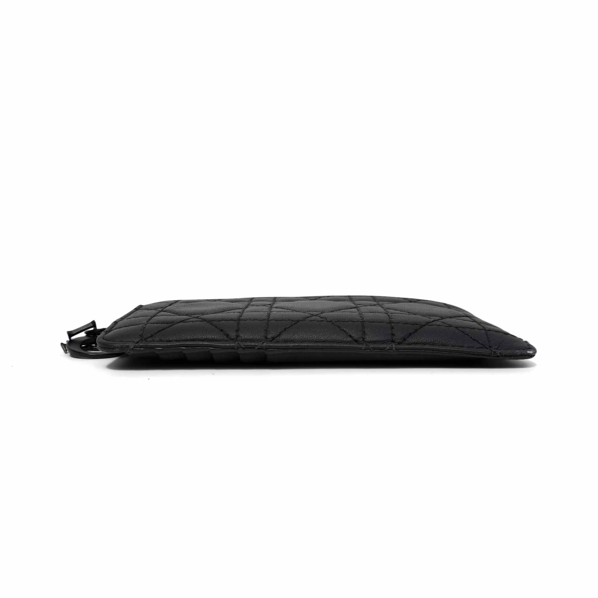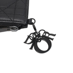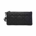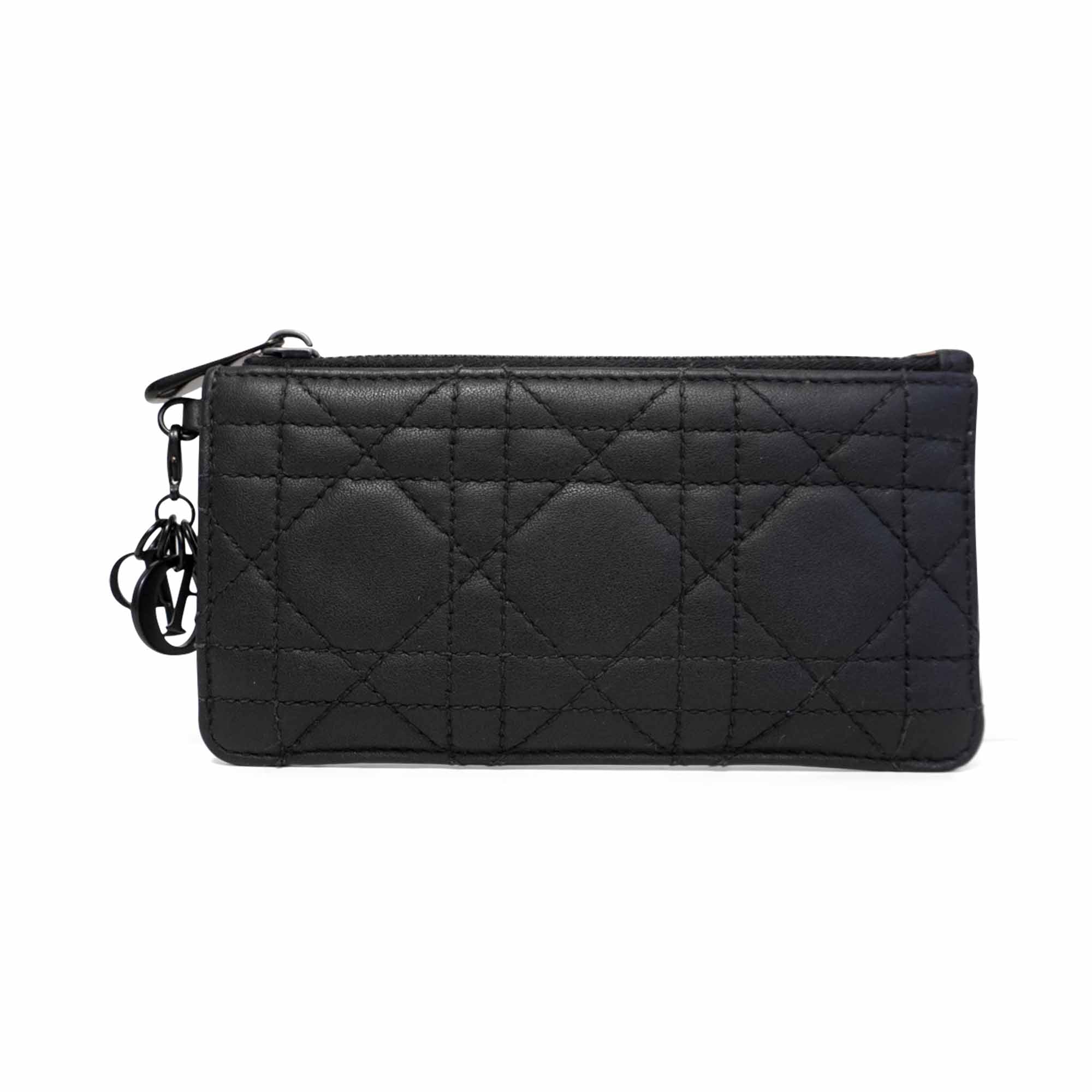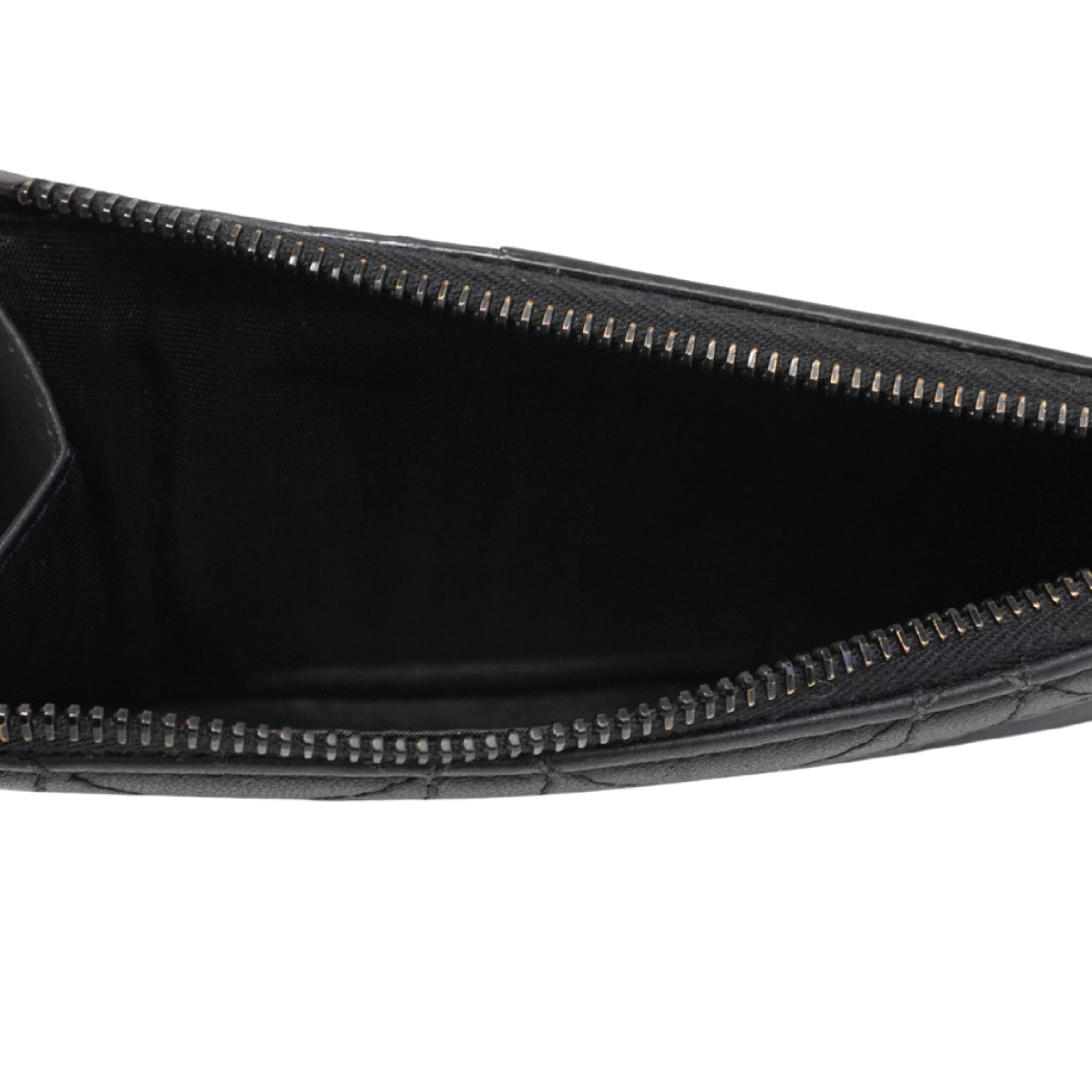 Christian Dior cannage quilted zip cardholder in black leather with top zipper, six card slots and letter keychain attachment.