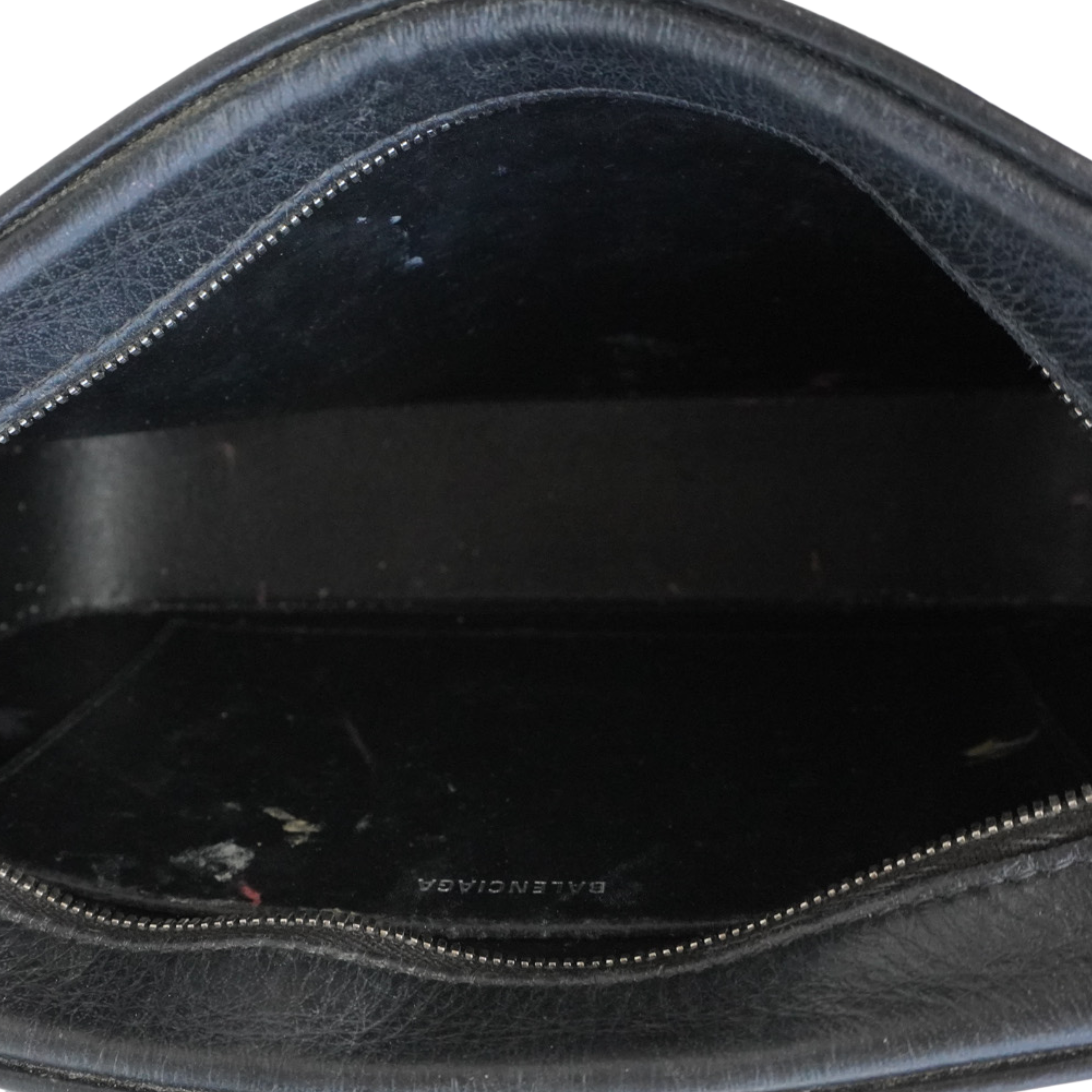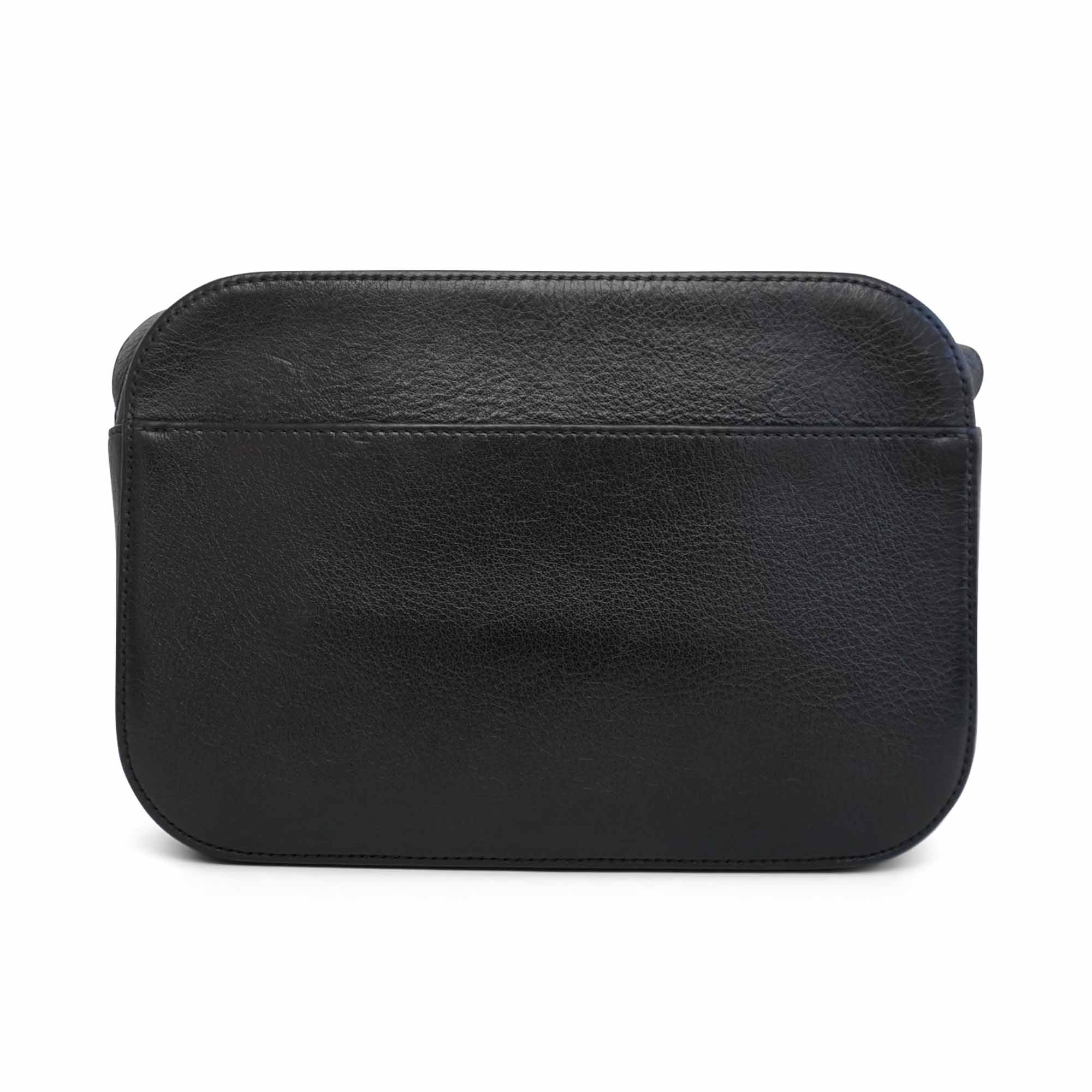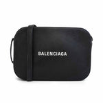 Balenciaga 'Everyday' camera bag in black leather with white logo print and zip closure. Features a leather lining with interior slip pocket.