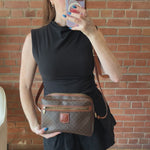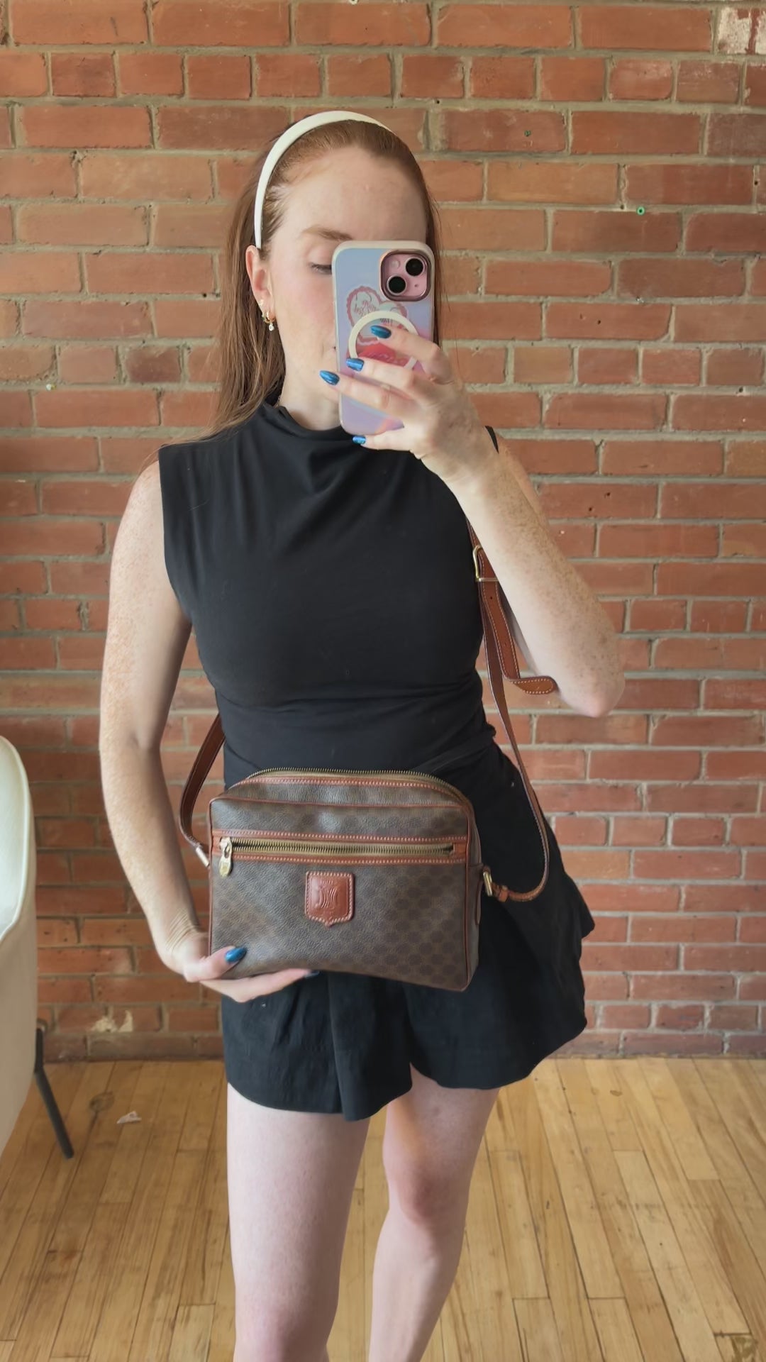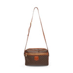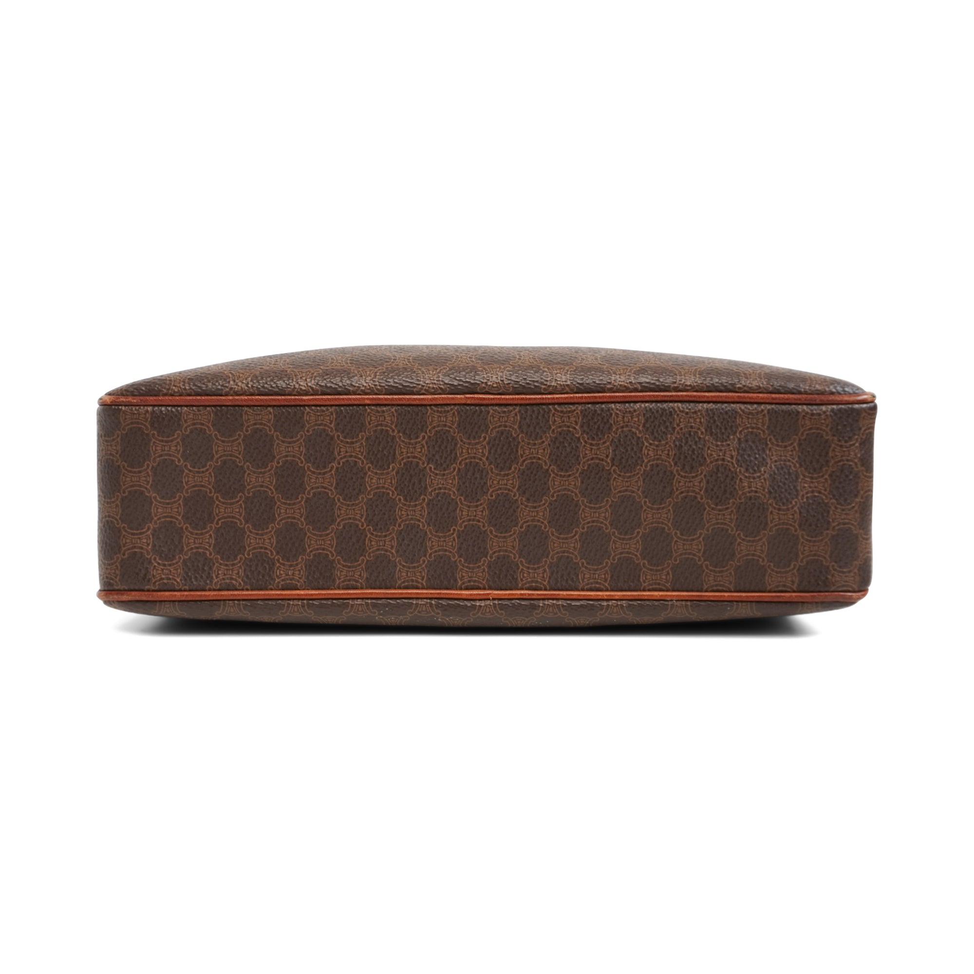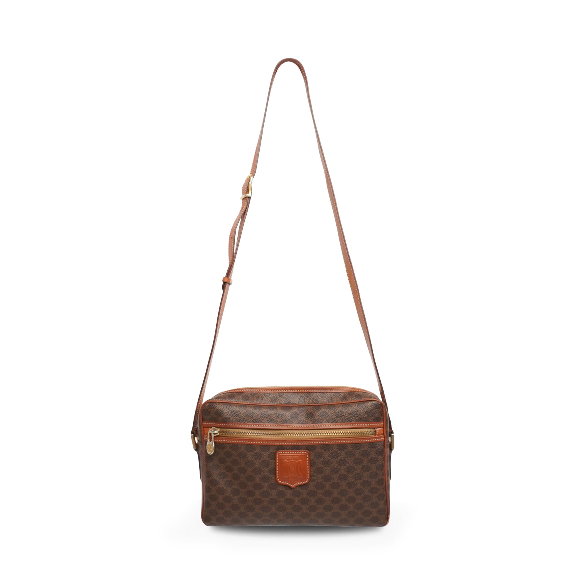 Celine 'Macadam' crossbody bag in brown coated canvas vintage print with brown leather trim and a front zip pocket. Interior features brown coated canvas lining with single zip pocket.