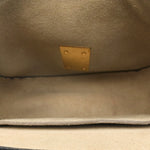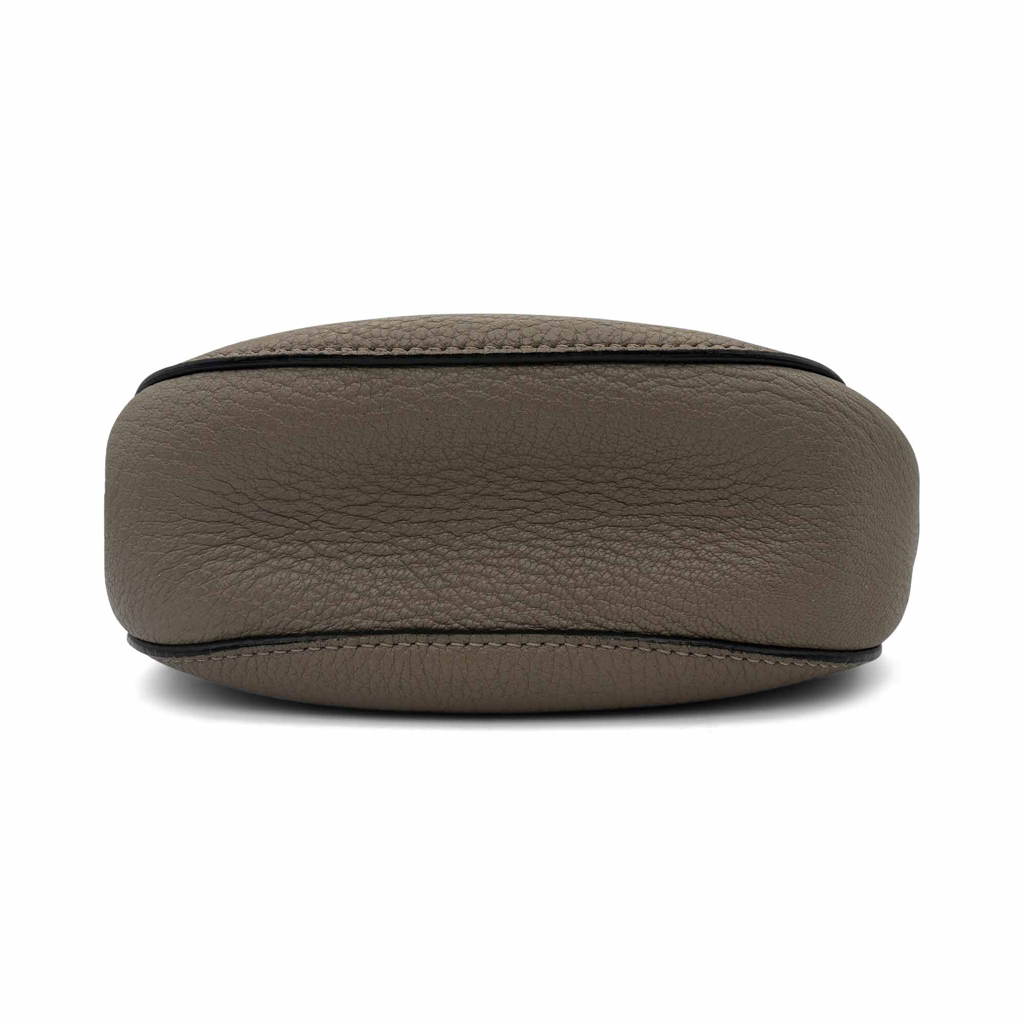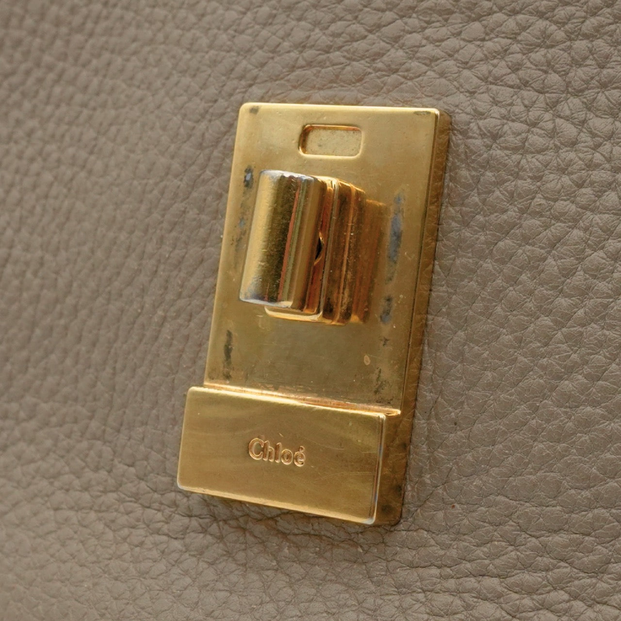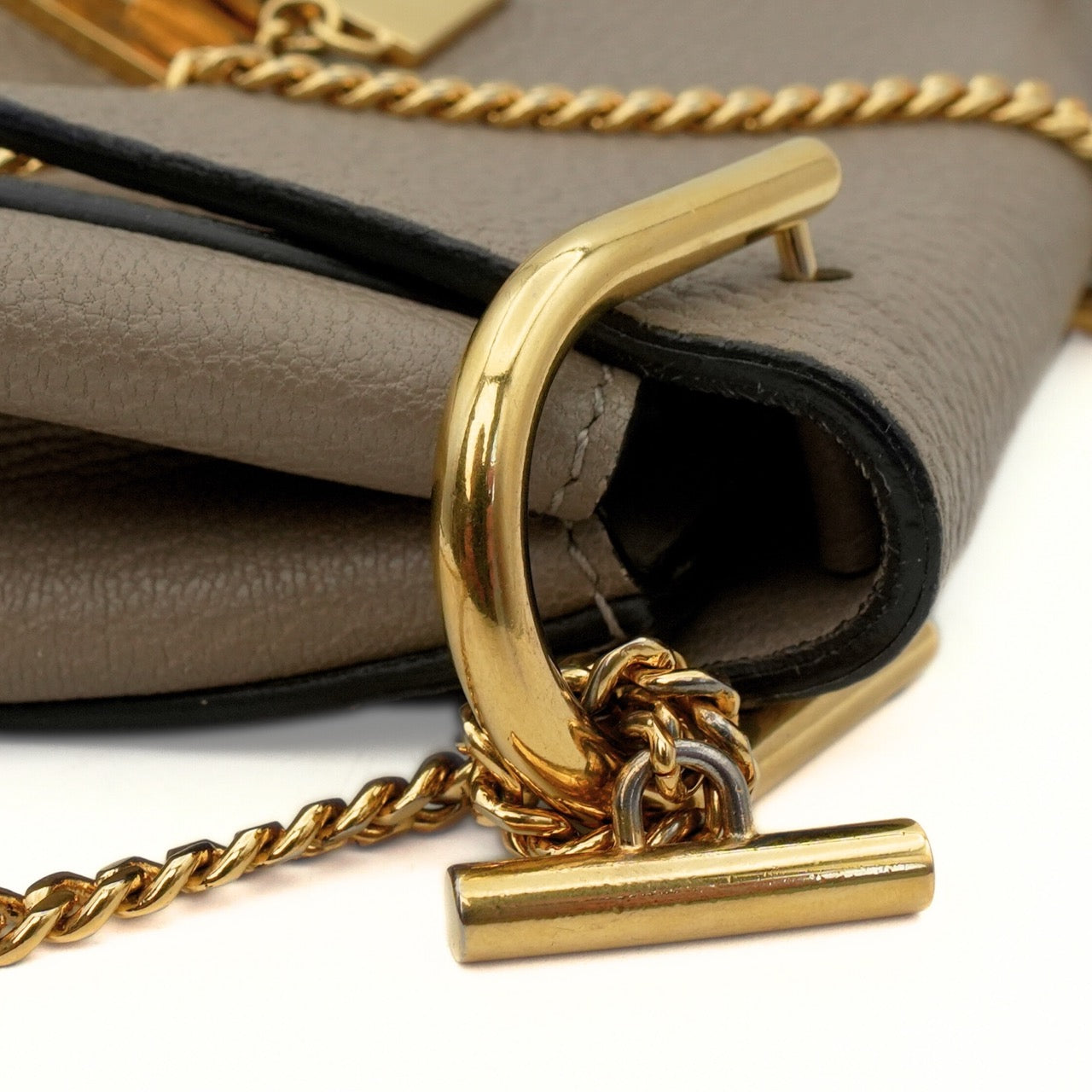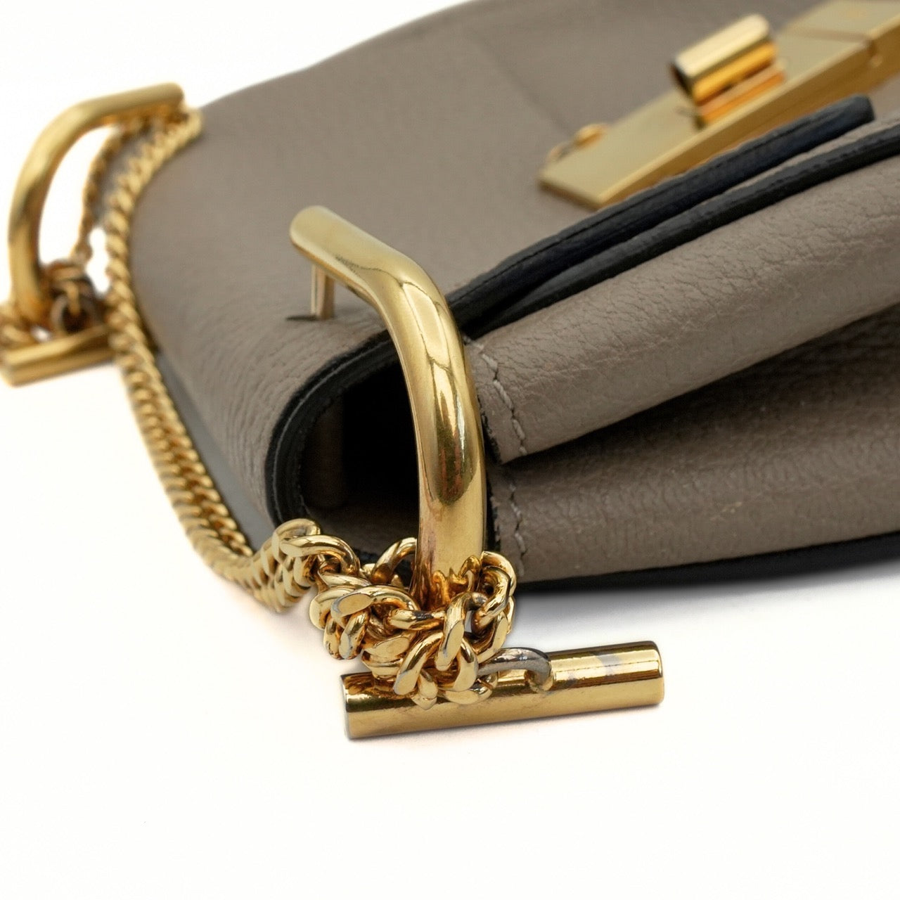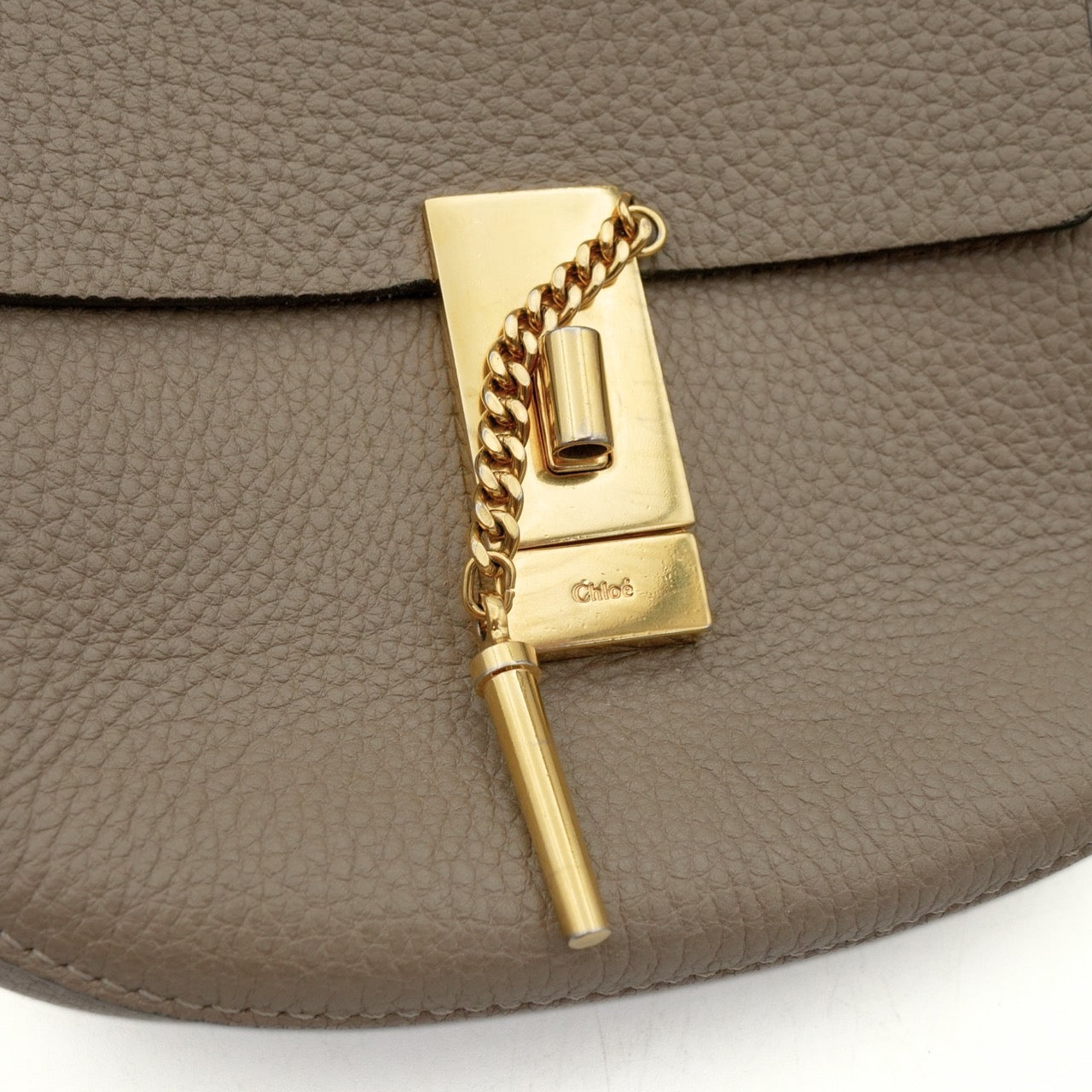 Chloe 'Drew' crossbody saddle bag in taupe grained leather and a chain strap. Features turnlock closure with metal bar detail that opens to a beige suede lining with interior slip pocket.
