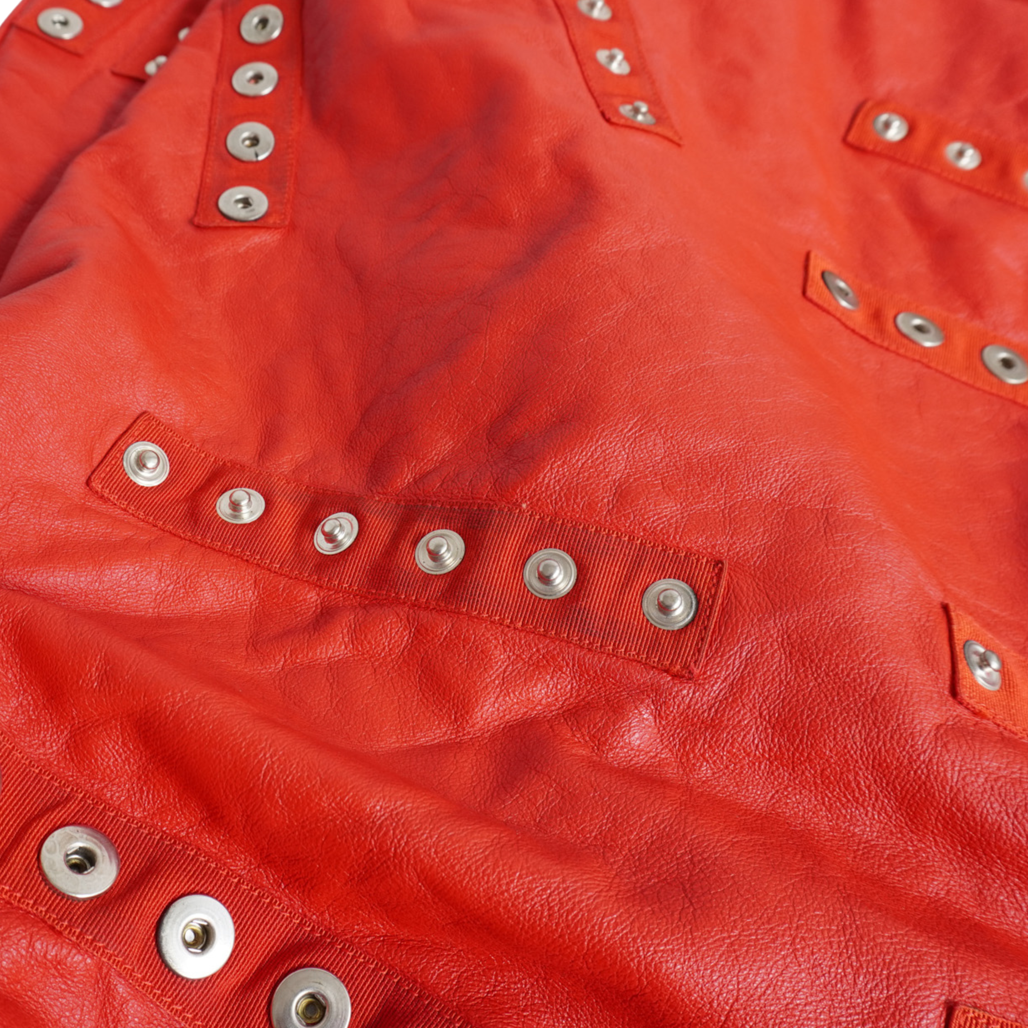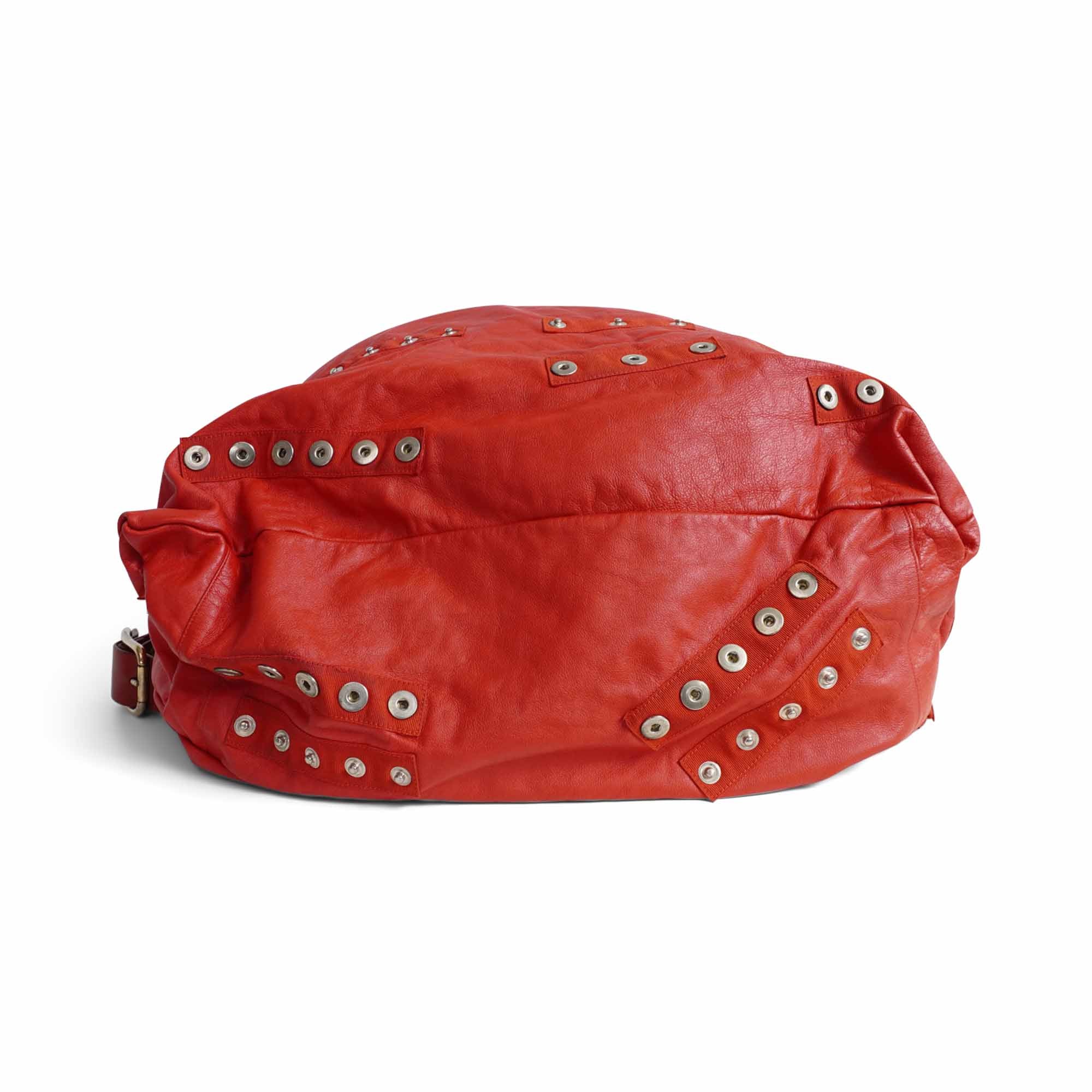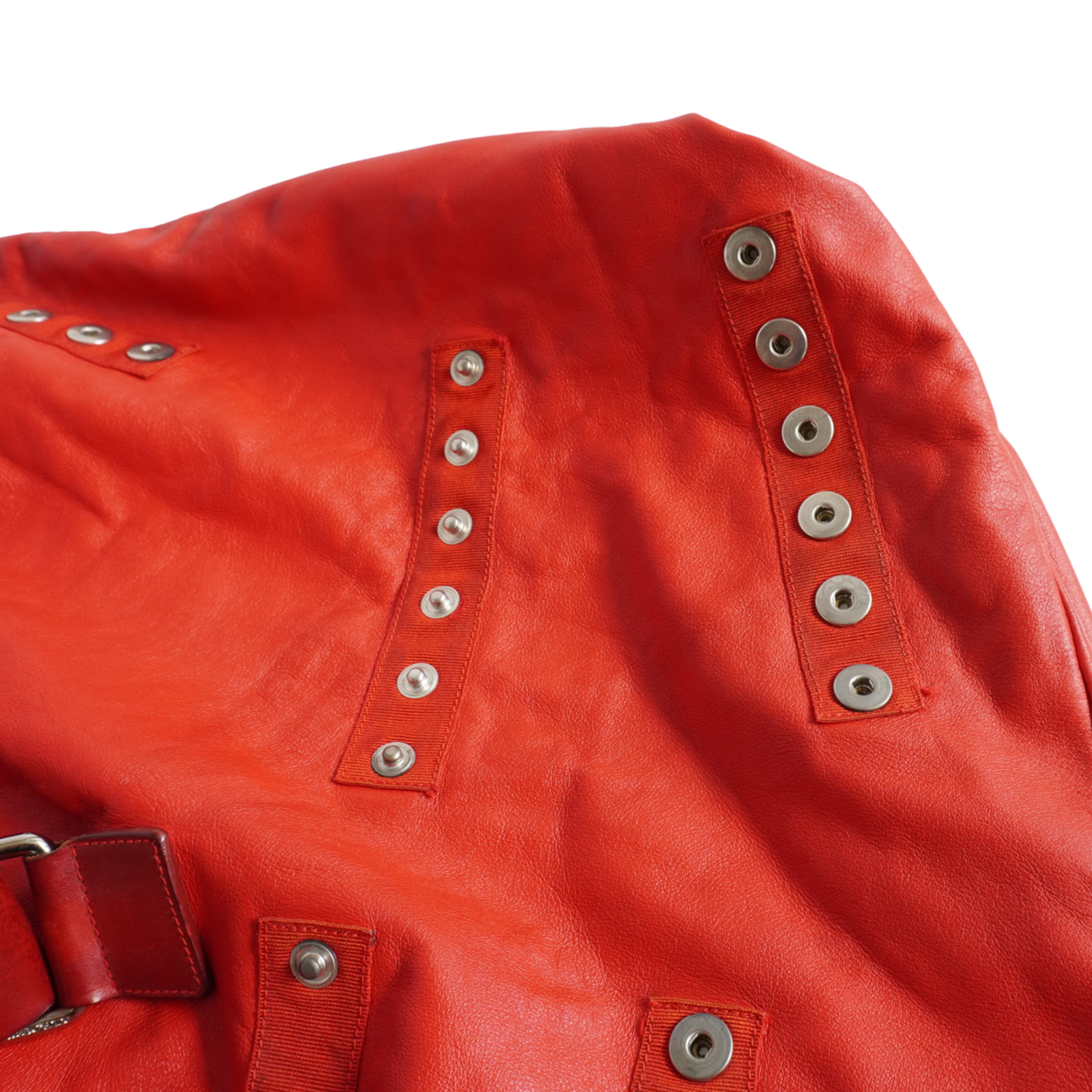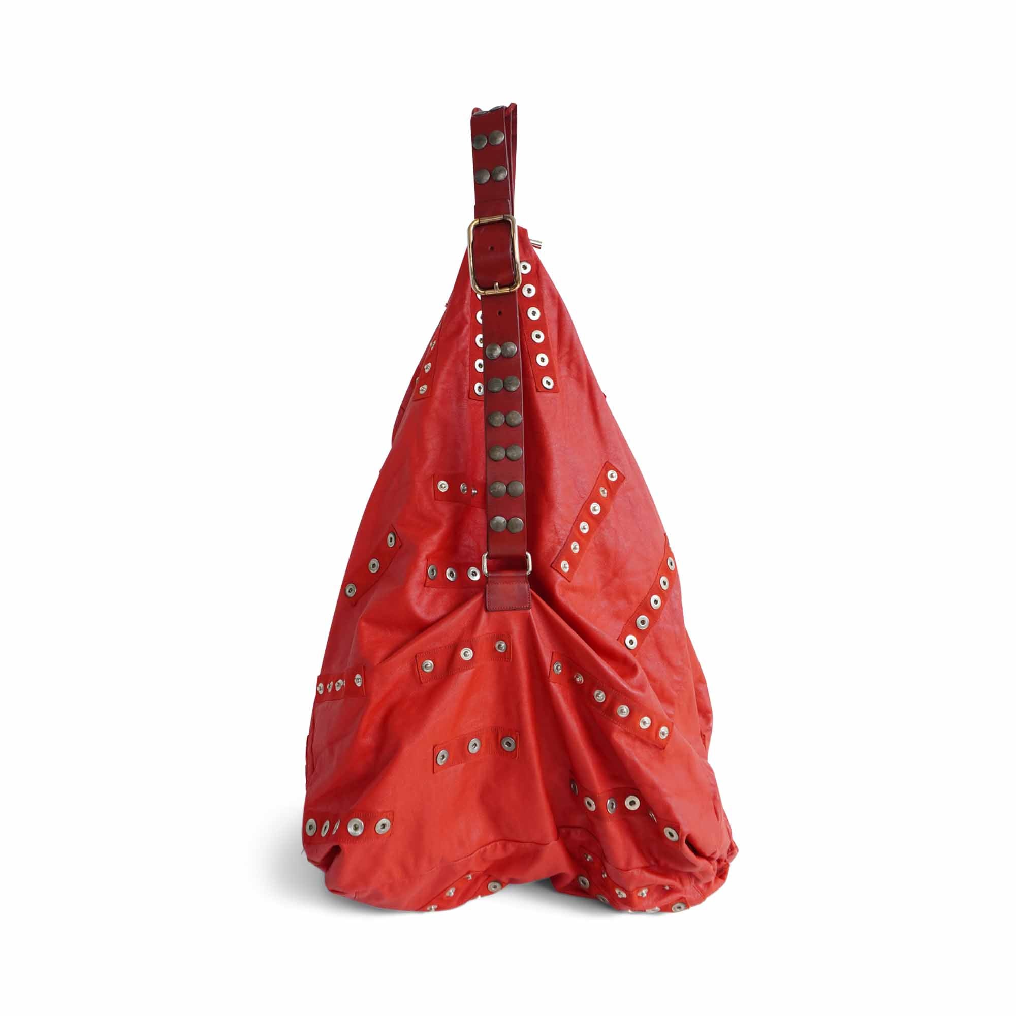 Dolce & Gabbana oversized convertible sling bag in red leather with a studded adjustable crossbody strap, silver snap button hardware throughout, and snap button closures. The interior compartment is lined with leopard print nylon and features a top zip pocket.