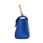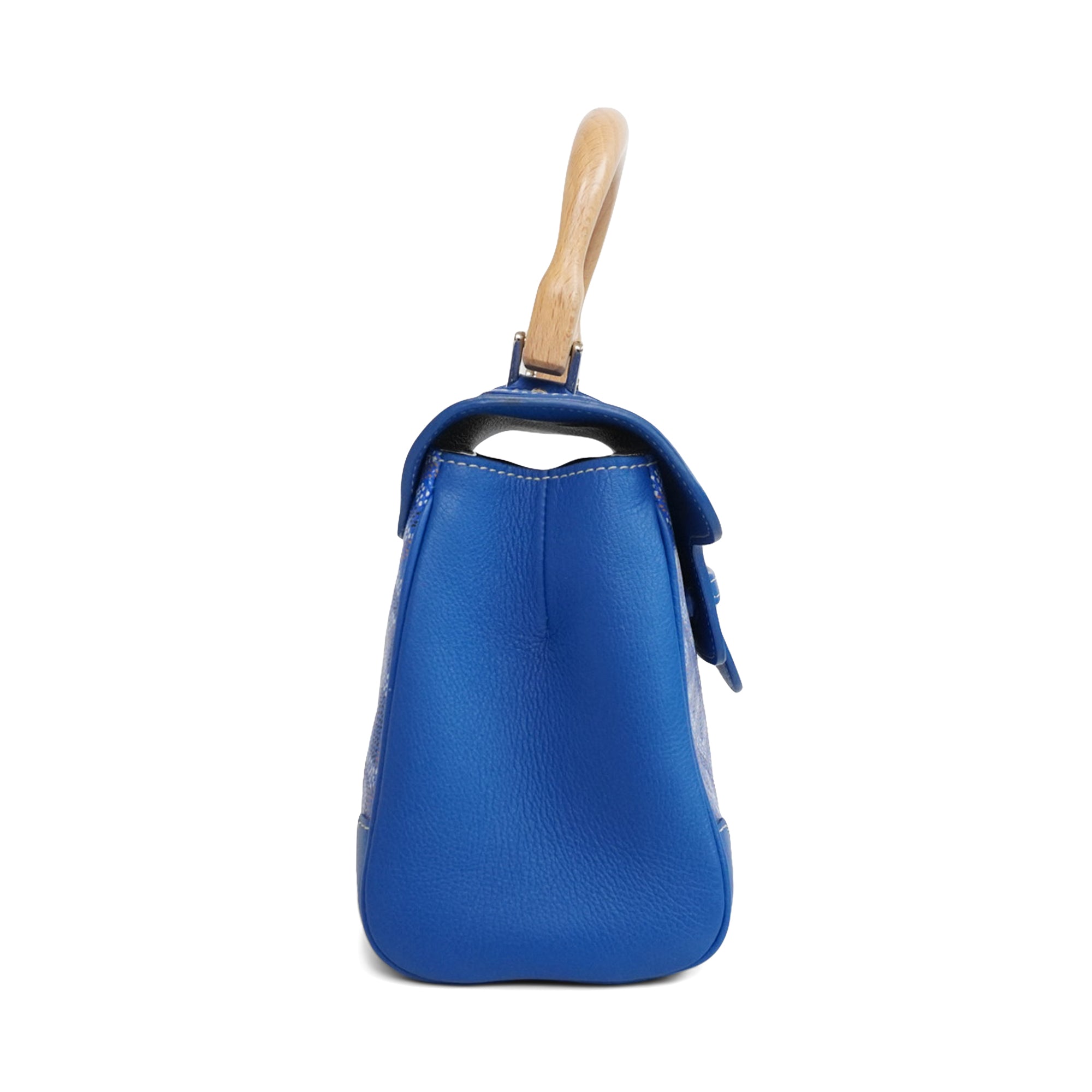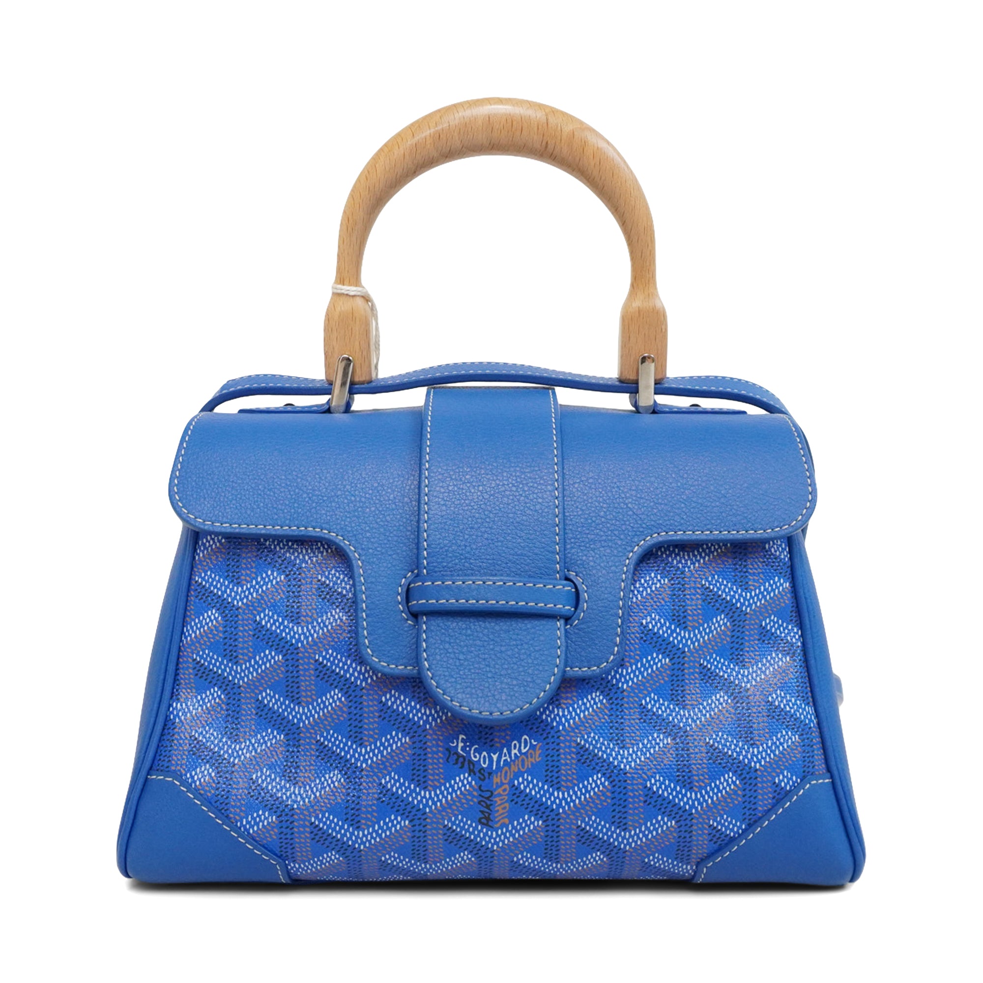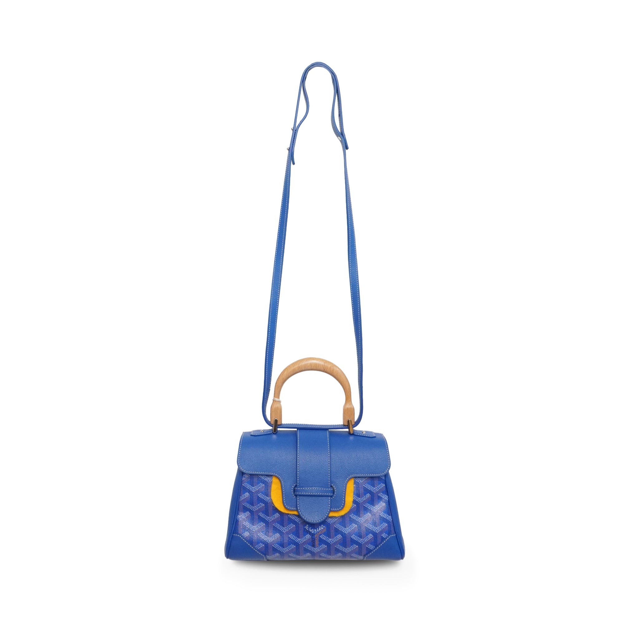 Goyard 'Mini Saigon' handbag in blue, brown and white Goyardine monogram printed coated canvas with leather trim, wood baton detailing, and silver hardware. The bag has a wood top handle, a removable and adjustable crossbody strap, and a top flap opening revealing a yellow canvas inner lining.