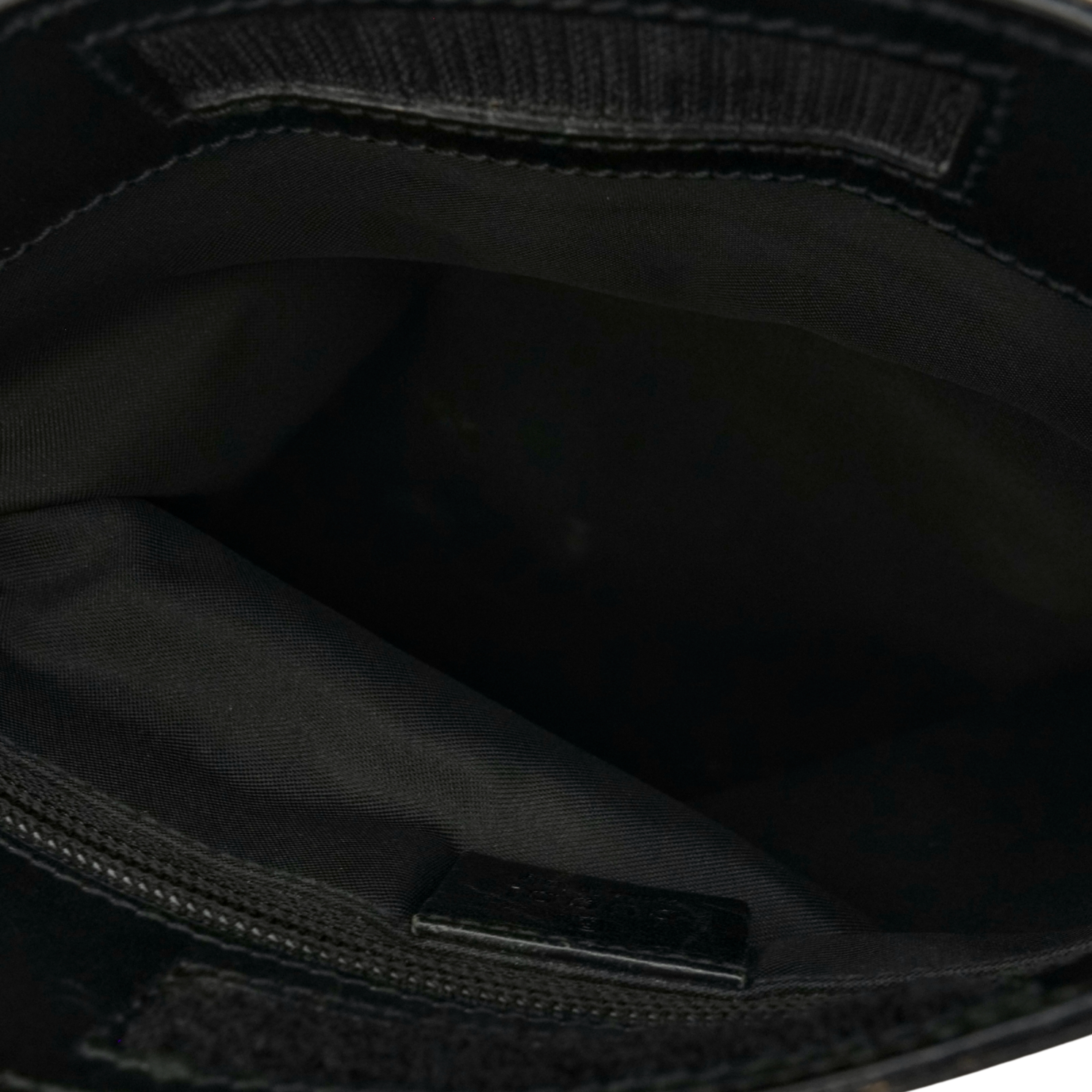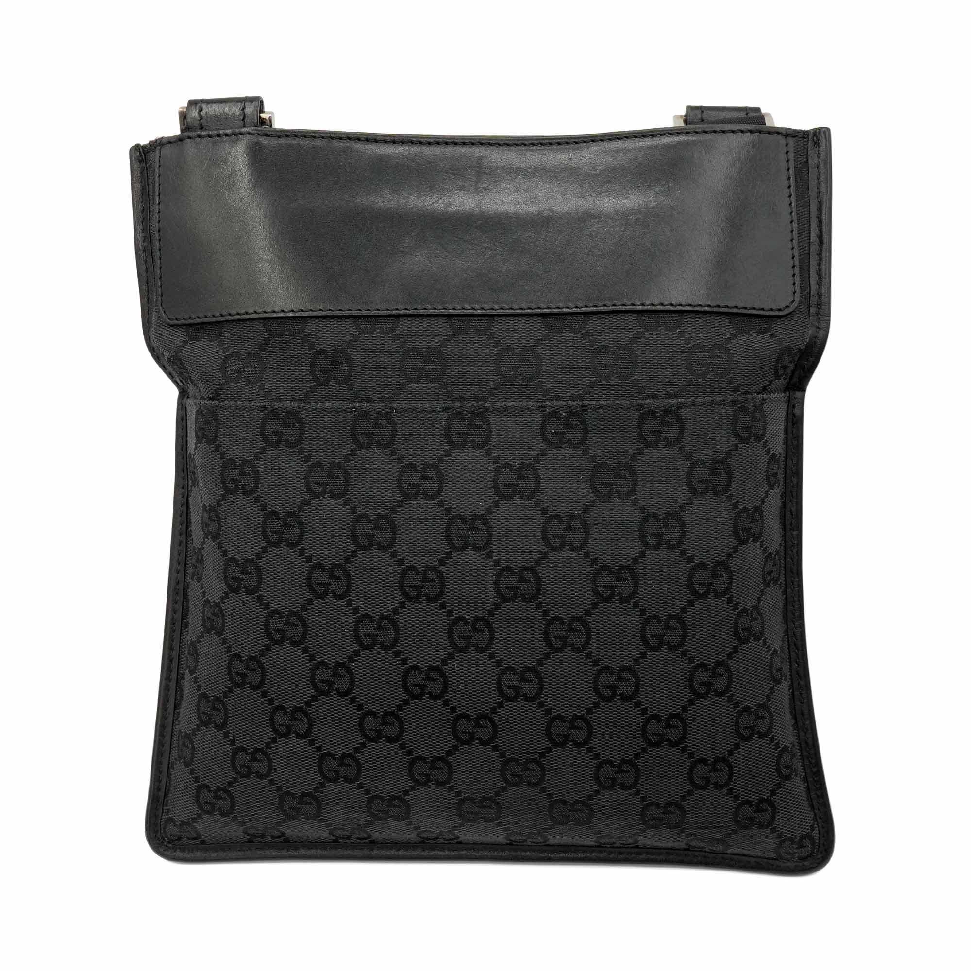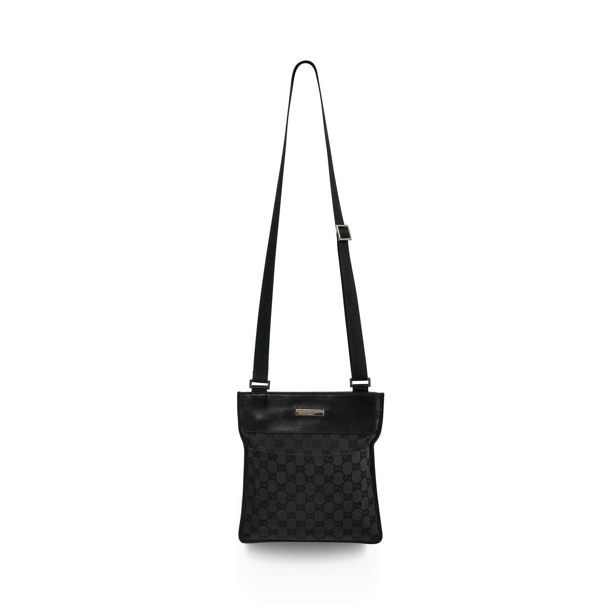 Gucci crossbody bag in black monogram canvas with black leather trim, front and back slip pockets, adjustable crossbody strap and silver plaque logo on the front. Interior features a velcro closure with black lining and zip pocket.