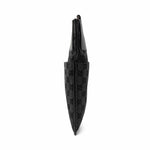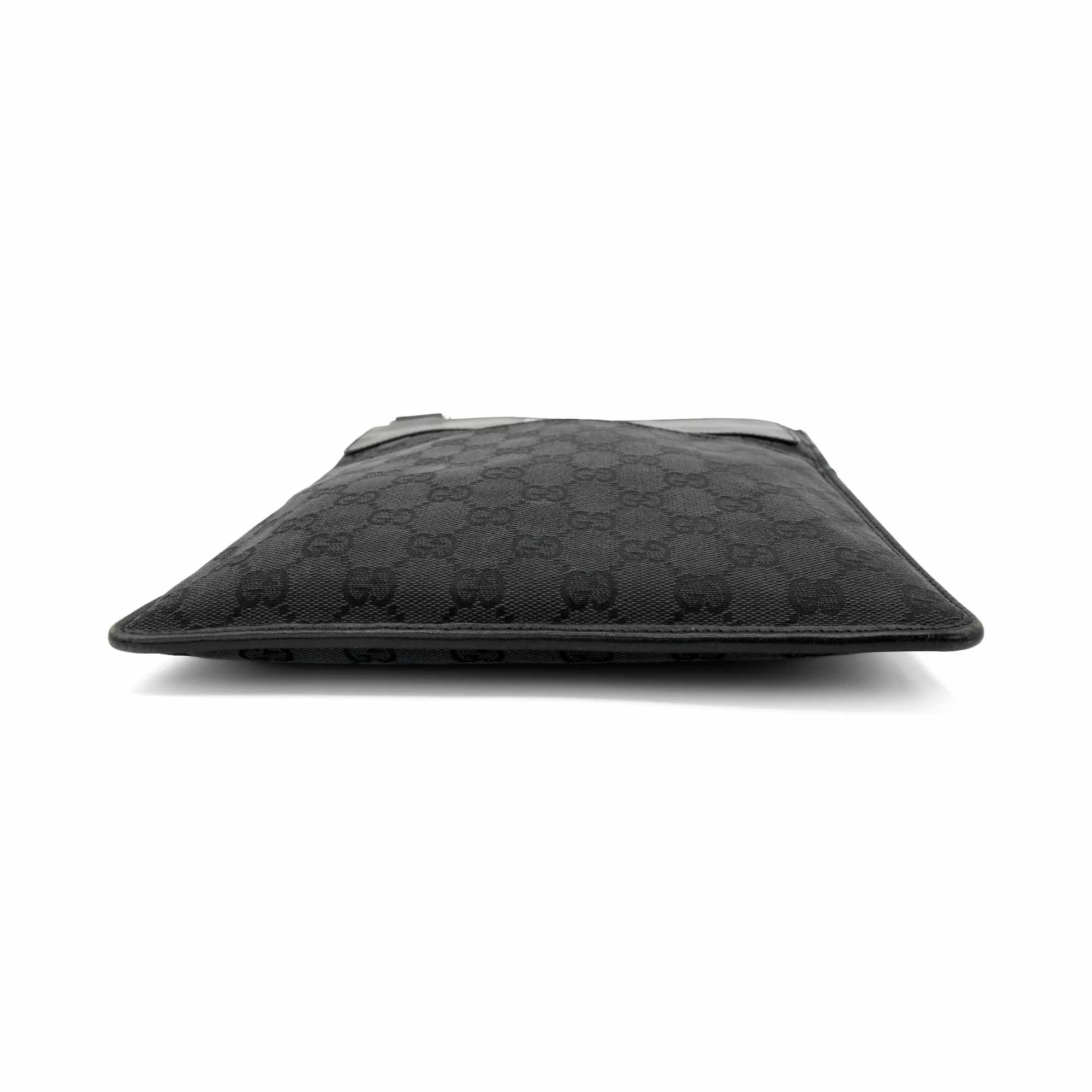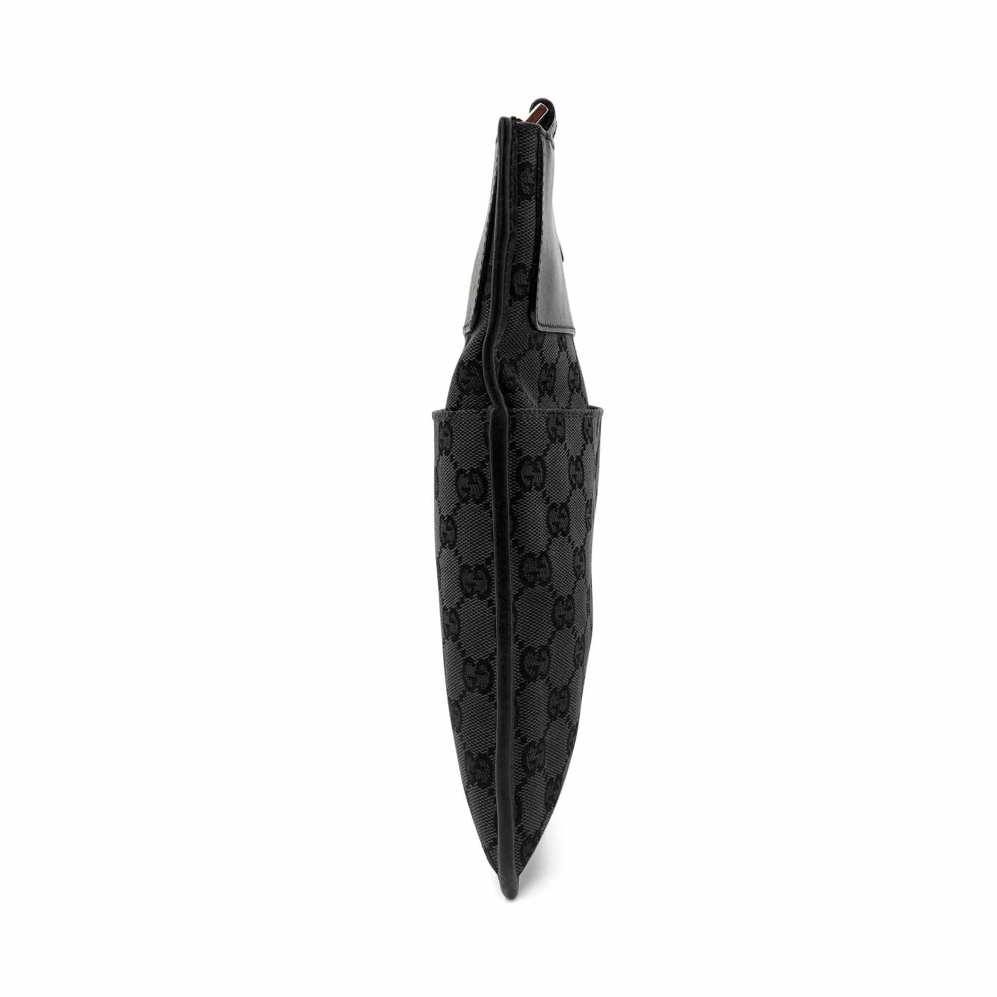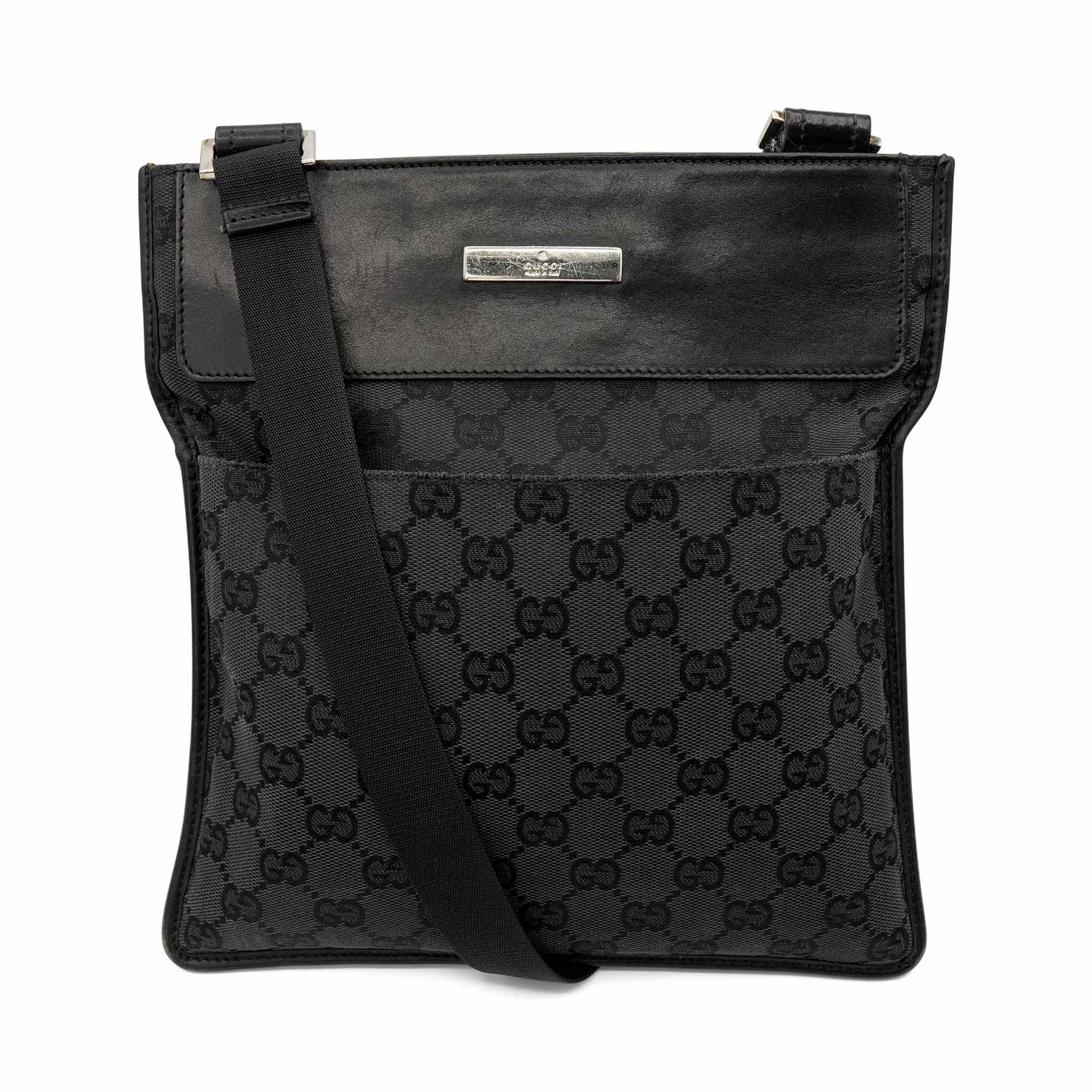 Gucci crossbody bag in black monogram canvas with black leather trim, front and back slip pockets, adjustable crossbody strap and silver plaque logo on the front. Interior features a velcro closure with black lining and zip pocket.