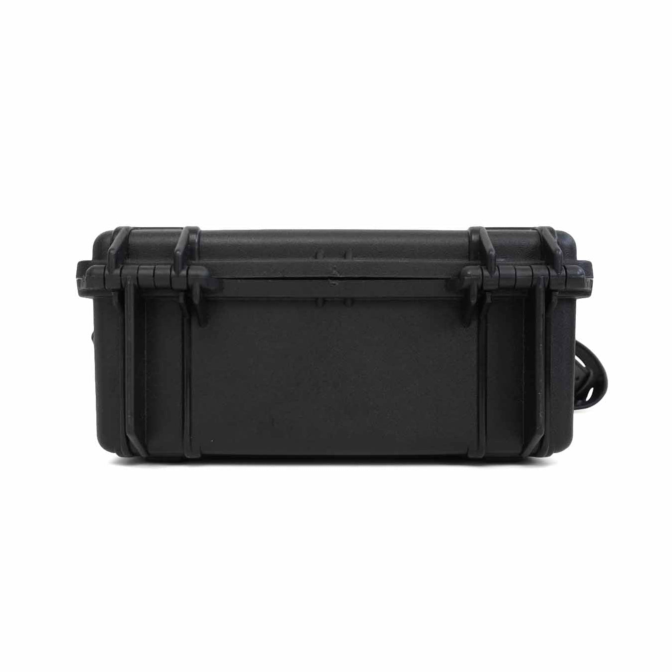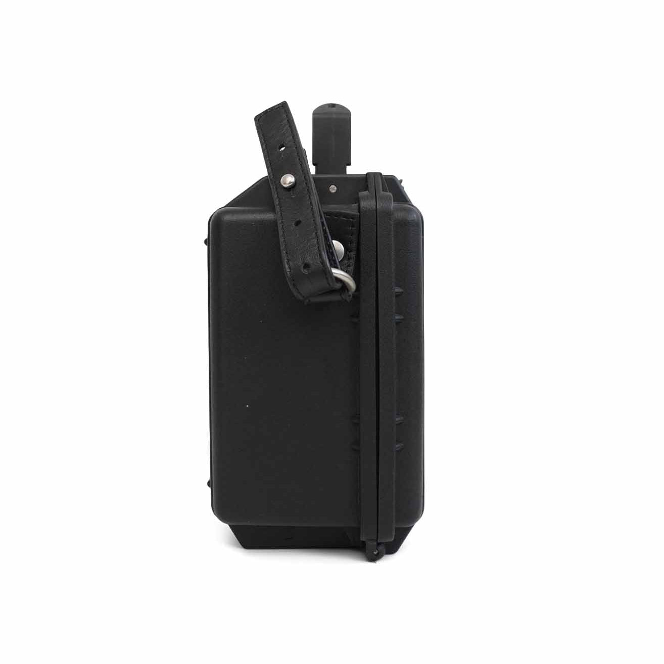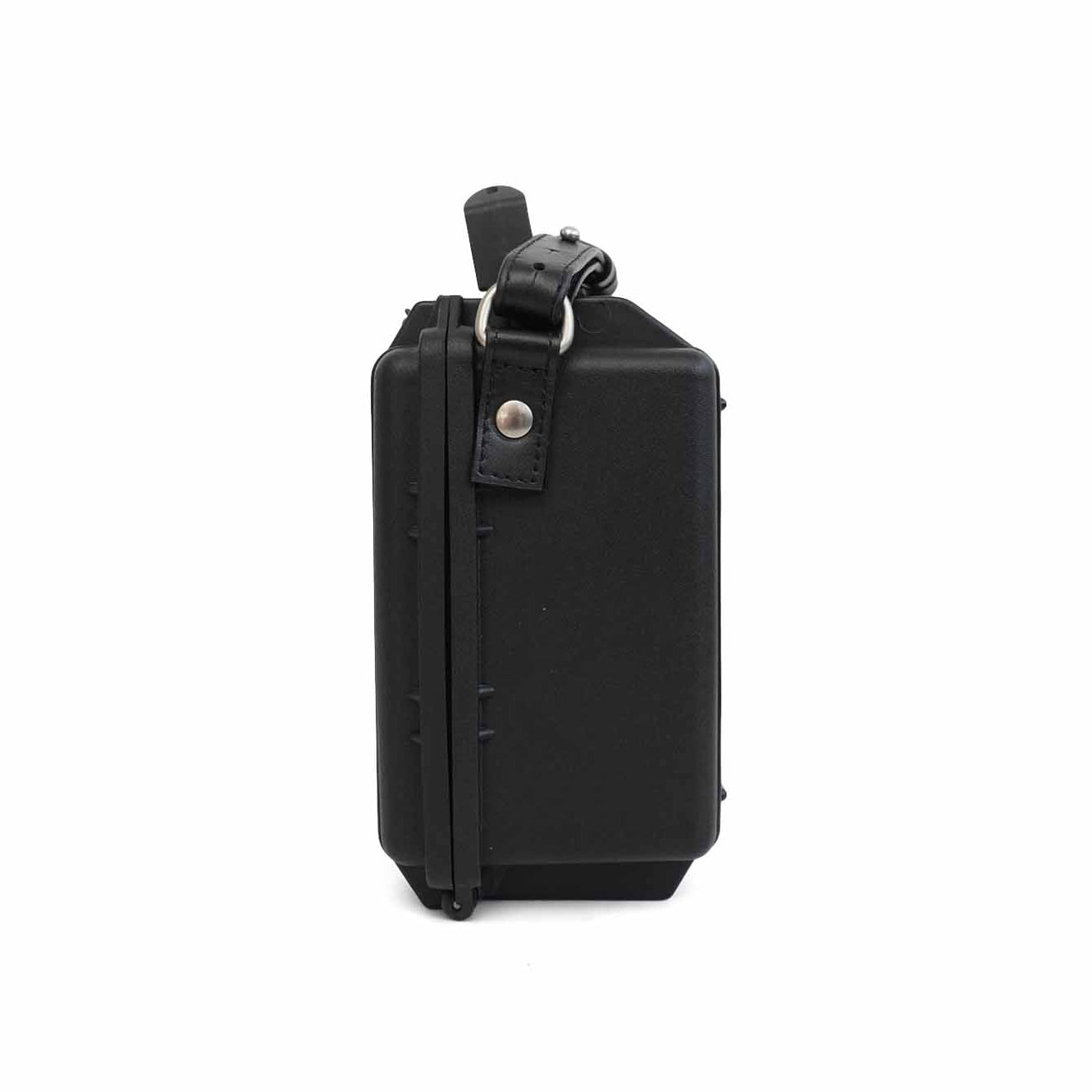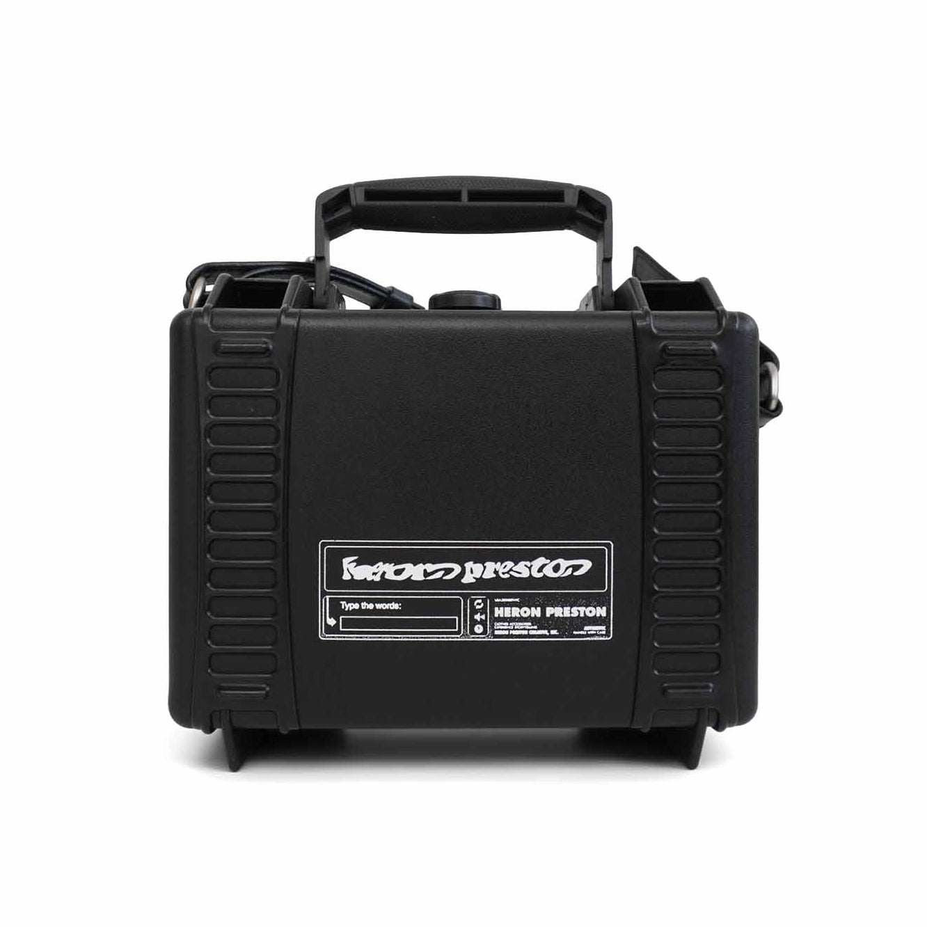 Heron Preston 'Tool Box' bag in black acetate with top handle and optional leather crossbody strap. Features orange logo plaque on the front and snap lock closure. Interior features a separate removable zip compartment.