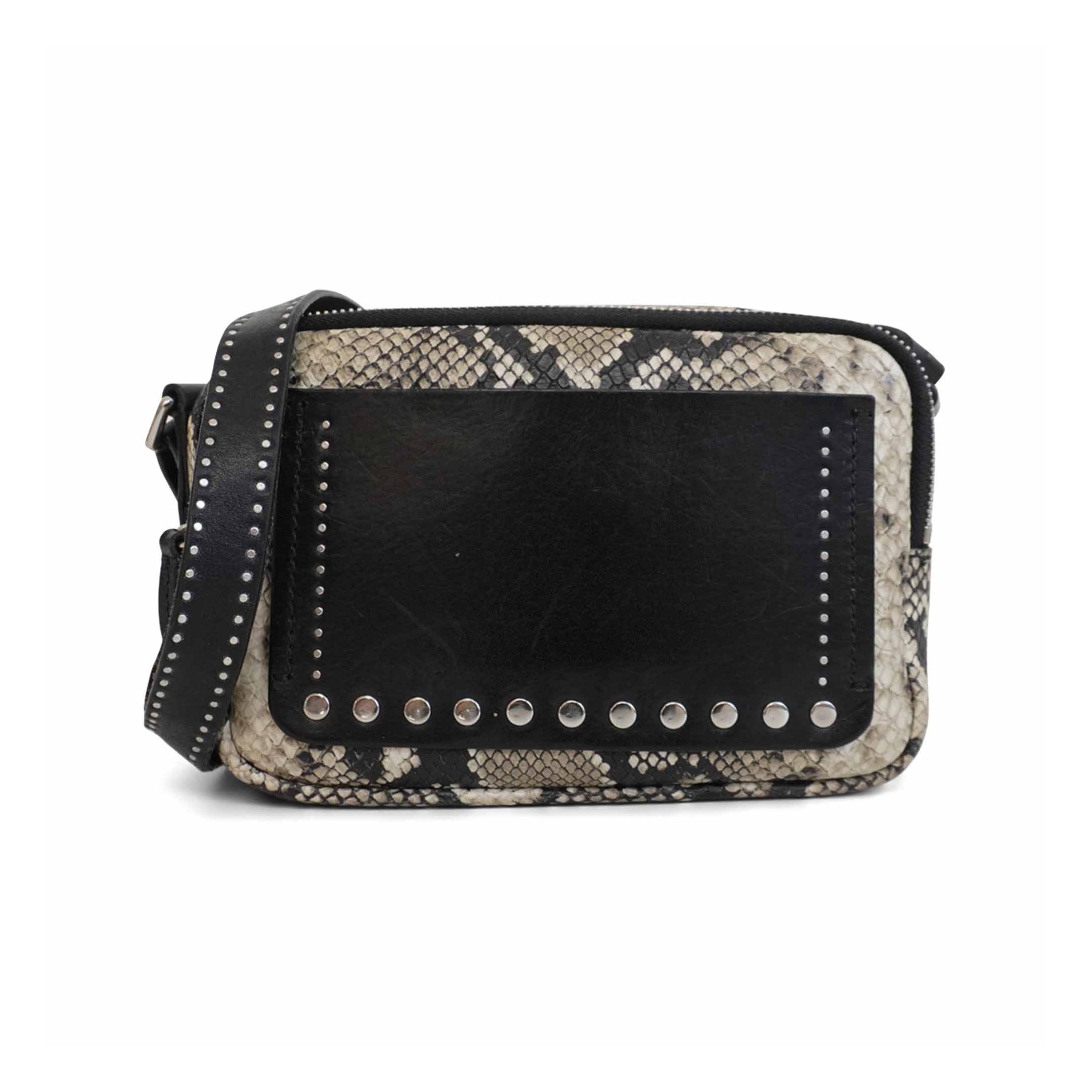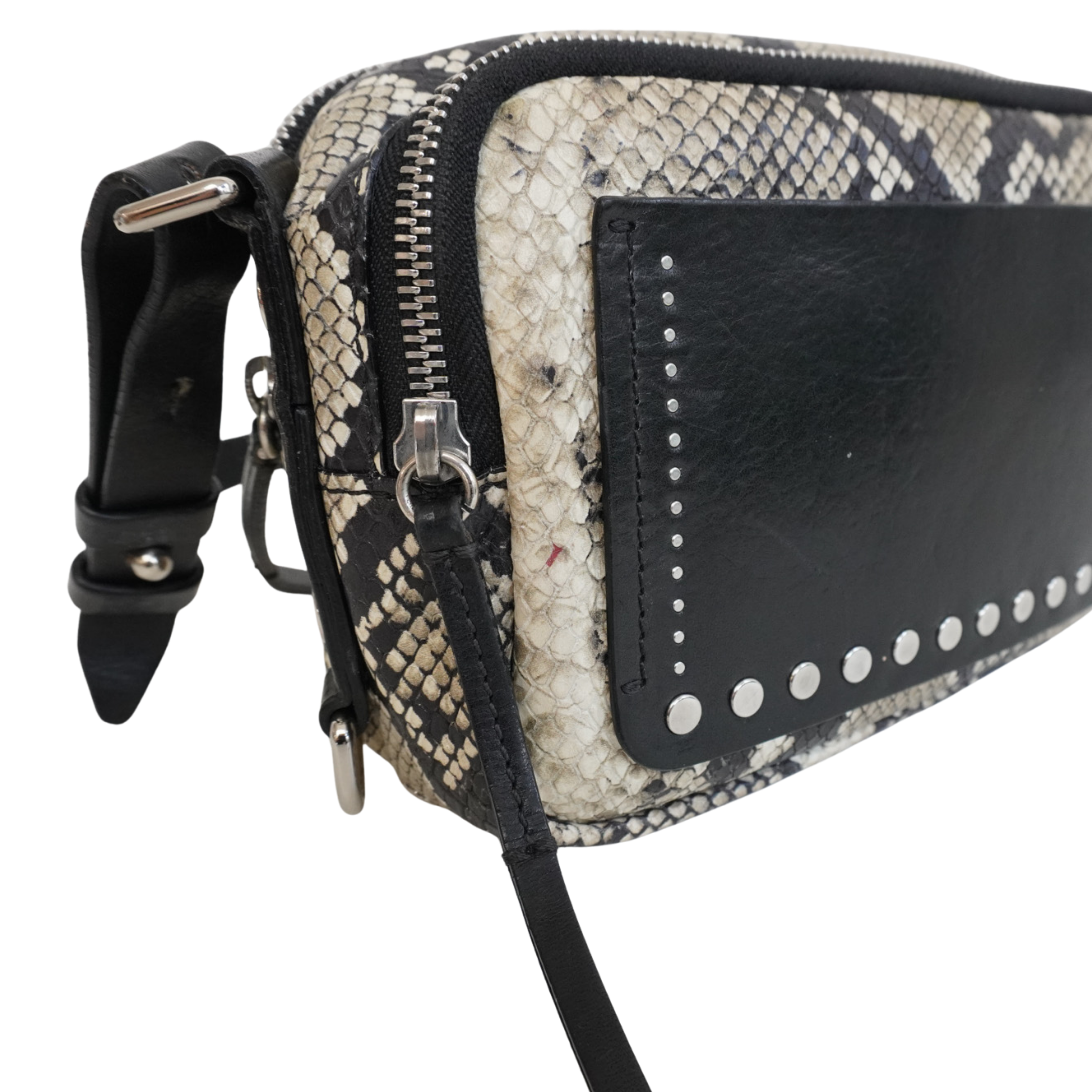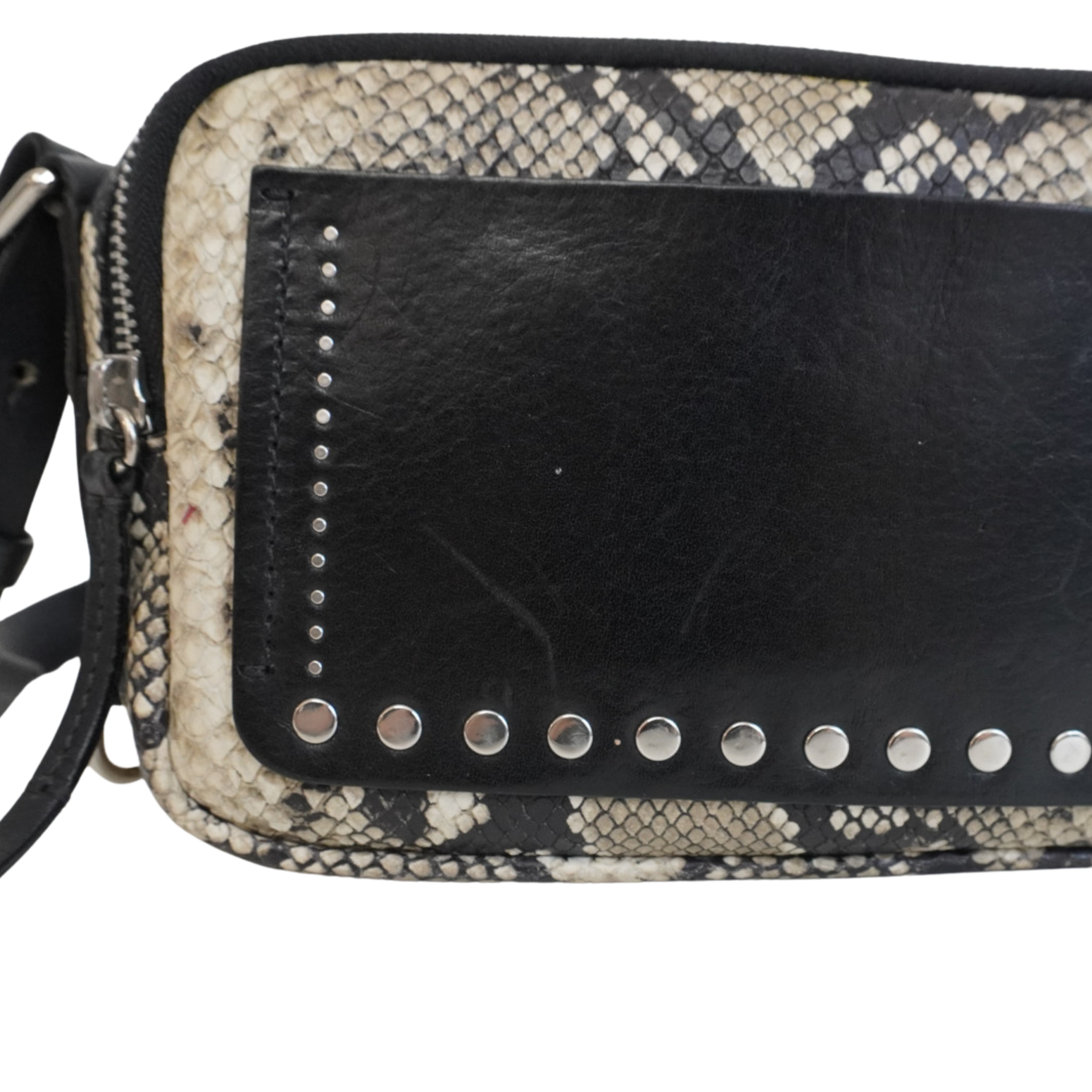 Isabel Marant 'Tinsley' crossbody bag in cream and black snakeskin printed leather with black leather trim and flat silver studs throughout. The bag has an adjustable leather crossbody strap, a front slip pocket, two main zip compartments with silver zip hardware, and a black canvas inner lining.