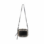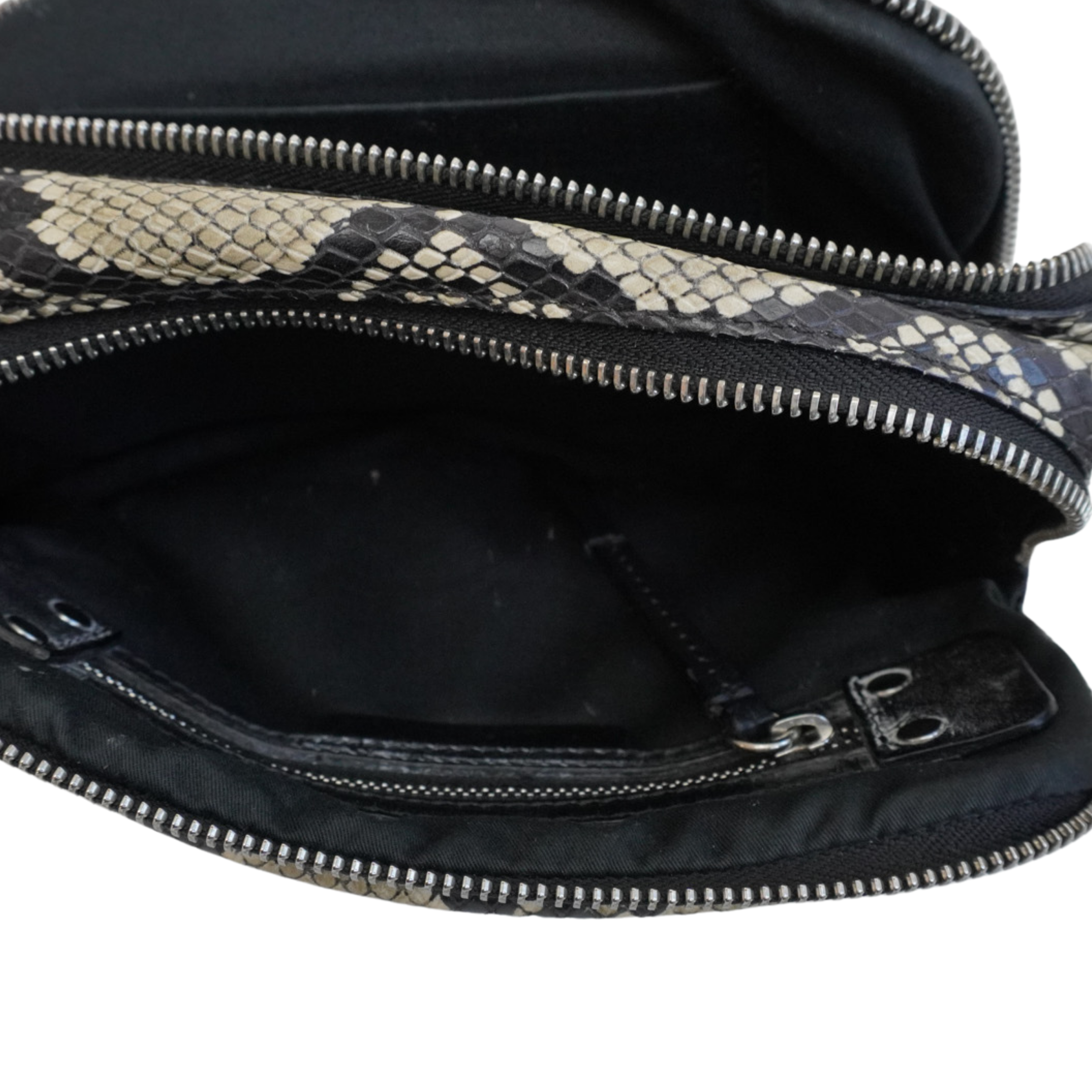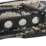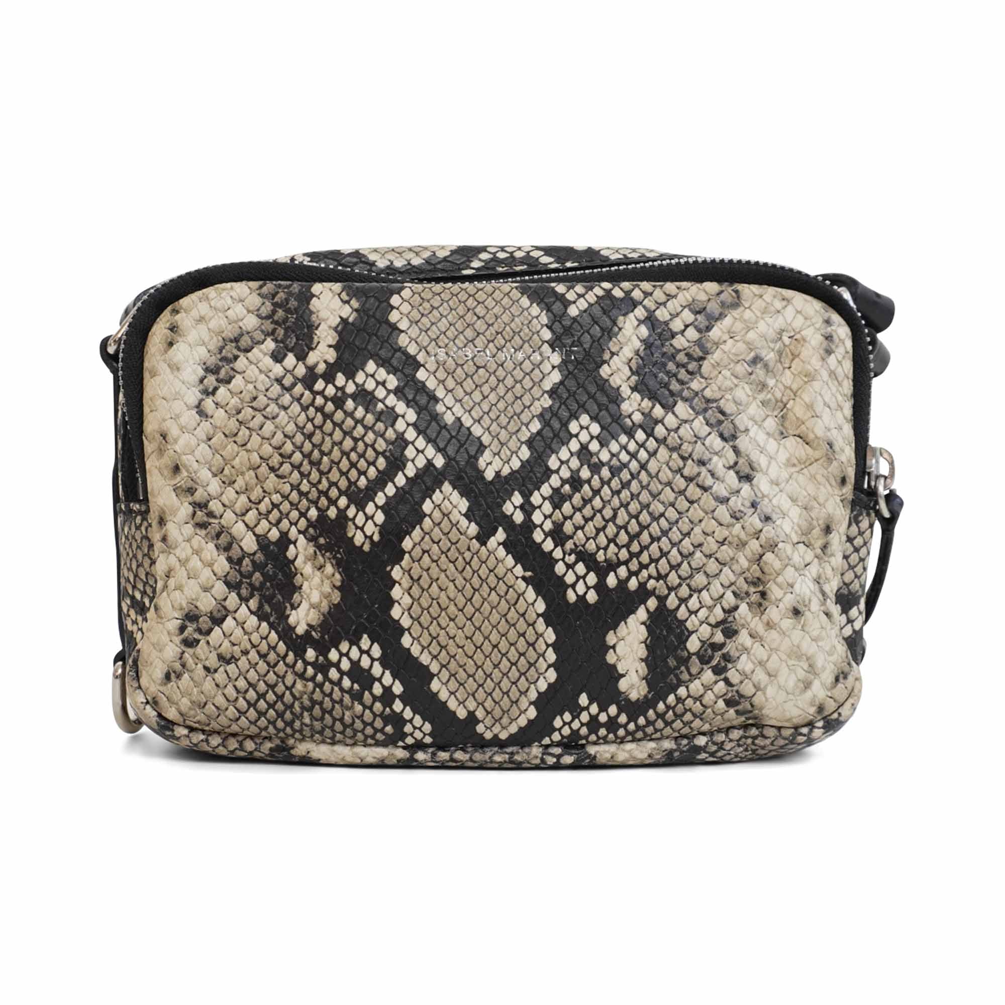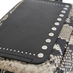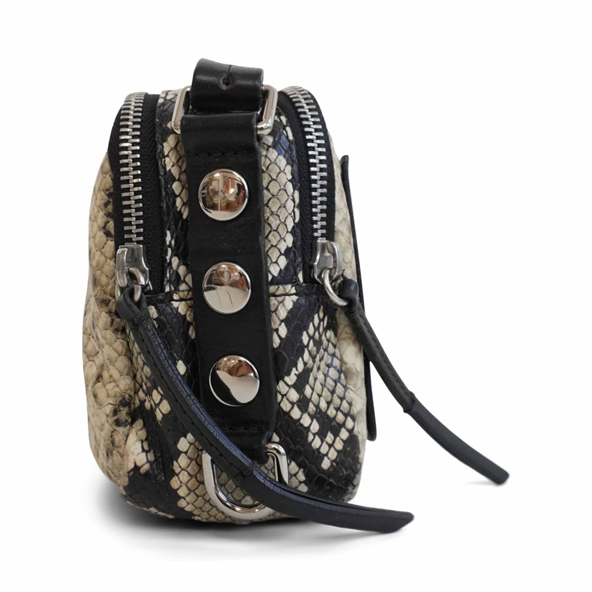 Isabel Marant 'Tinsley' crossbody bag in cream and black snakeskin printed leather with black leather trim and flat silver studs throughout. The bag has an adjustable leather crossbody strap, a front slip pocket, two main zip compartments with silver zip hardware, and a black canvas inner lining.