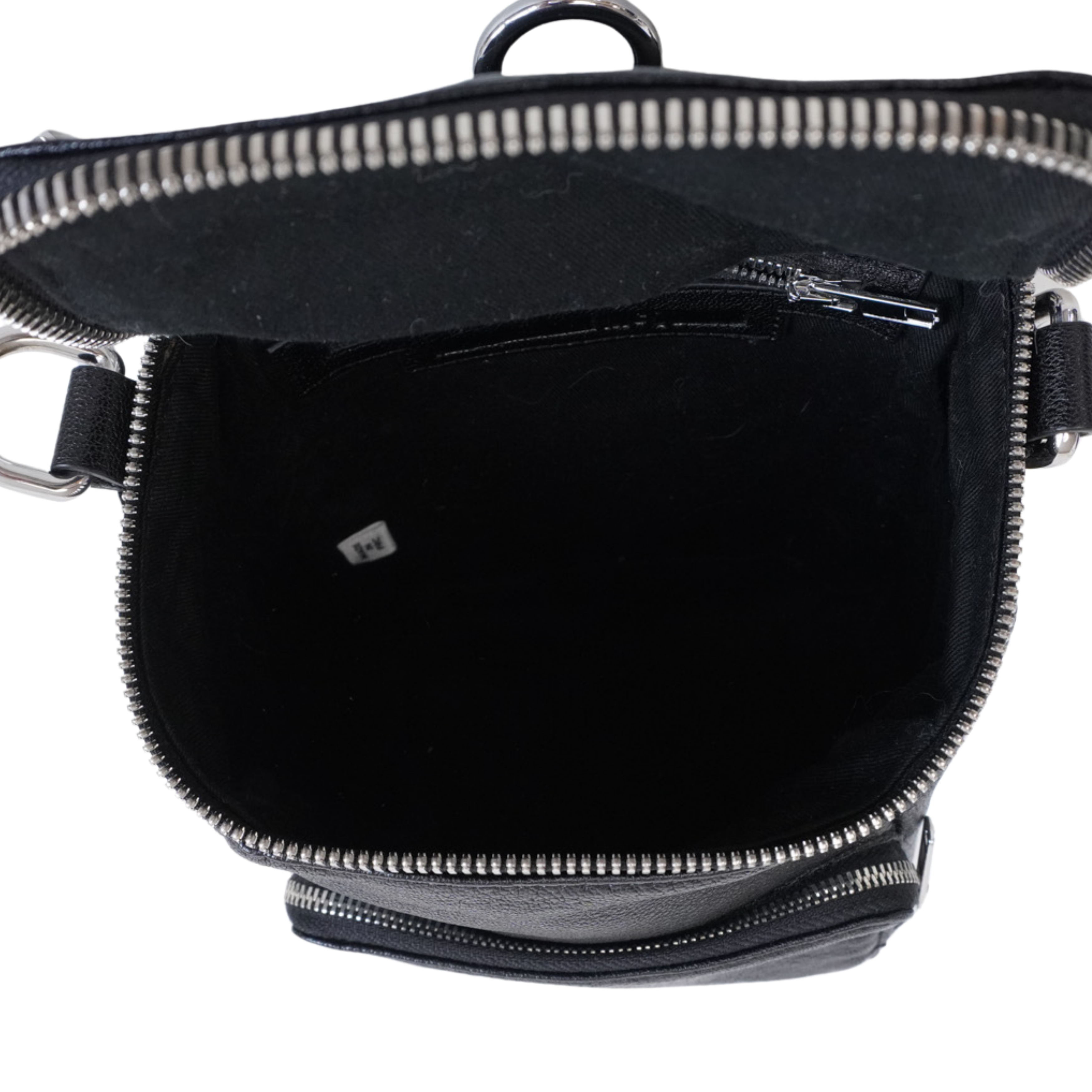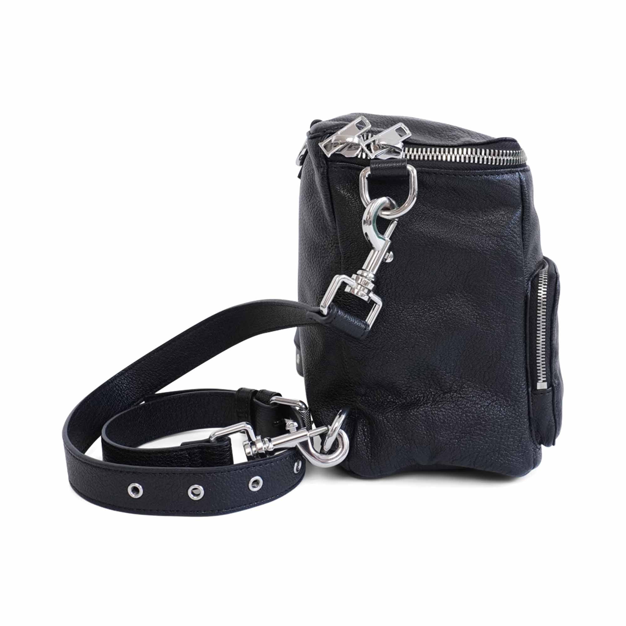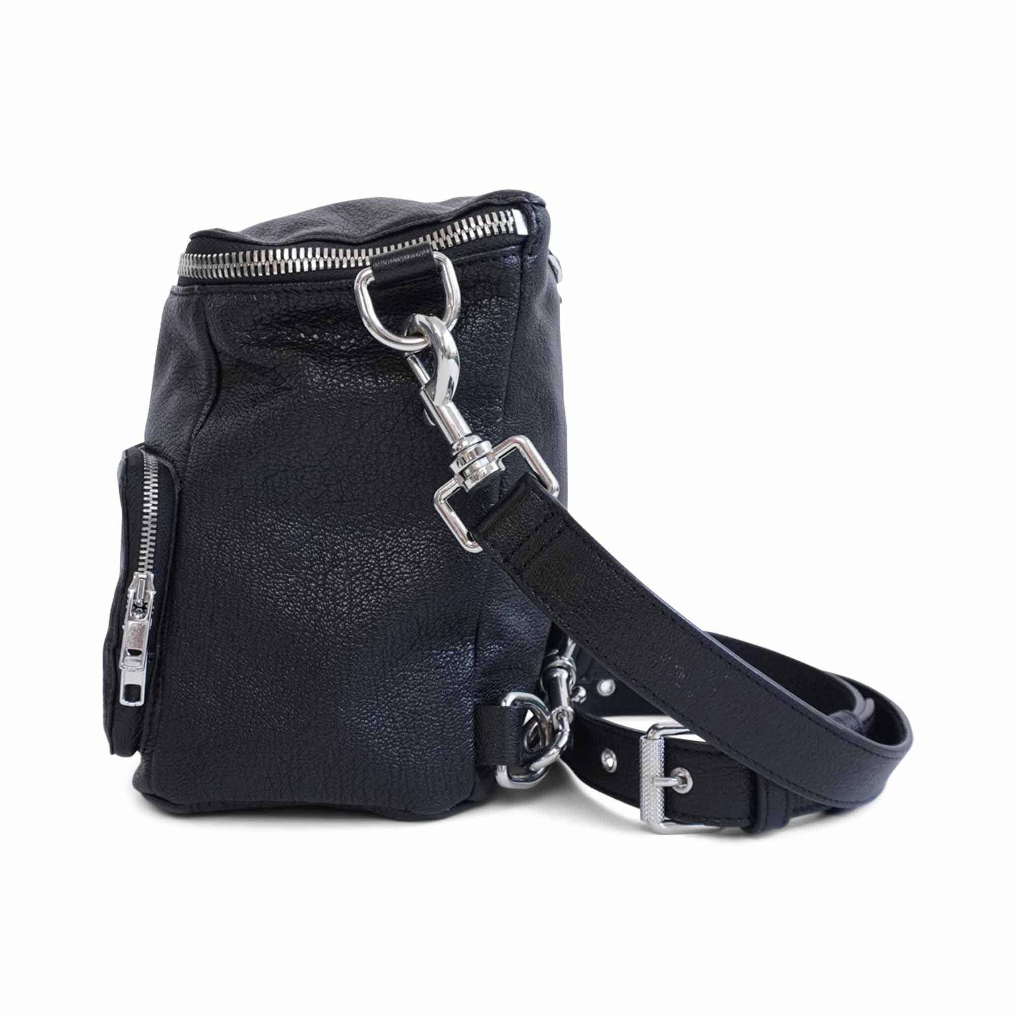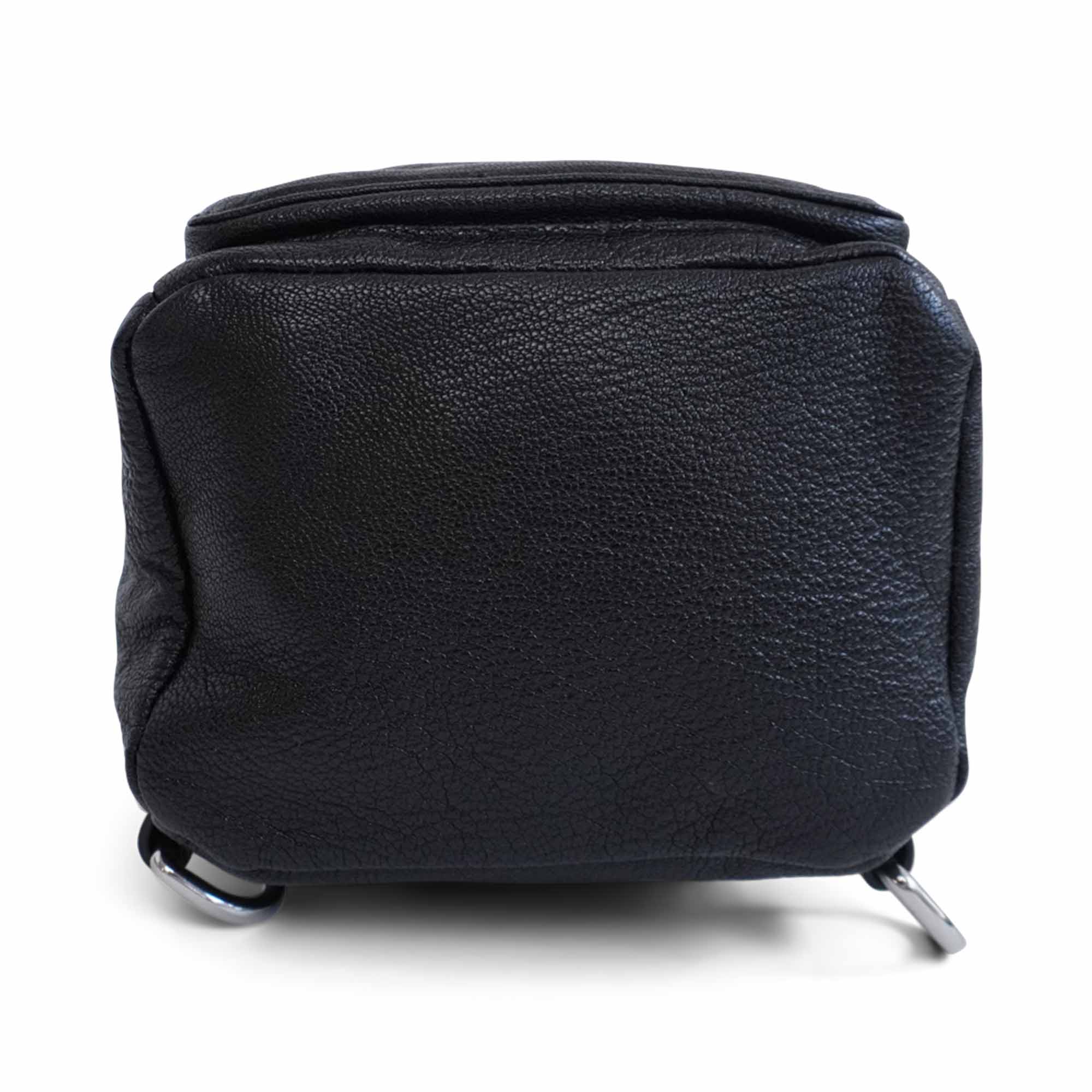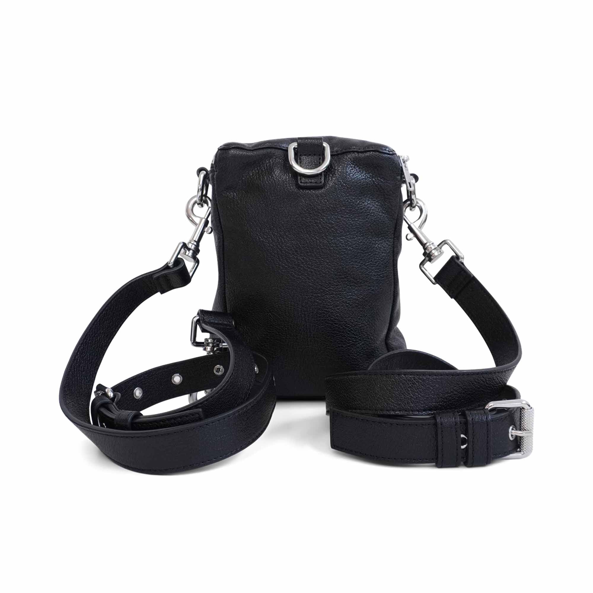 McQ by Alexander McQueen 'Loveless' multi-way backpack in black leather with silver hardware and an embossed logo detail. Features two zip pockets with black fabric lining and multiple D-rings allowing the straps to be configured for shoulder, crossbody, or back wear.