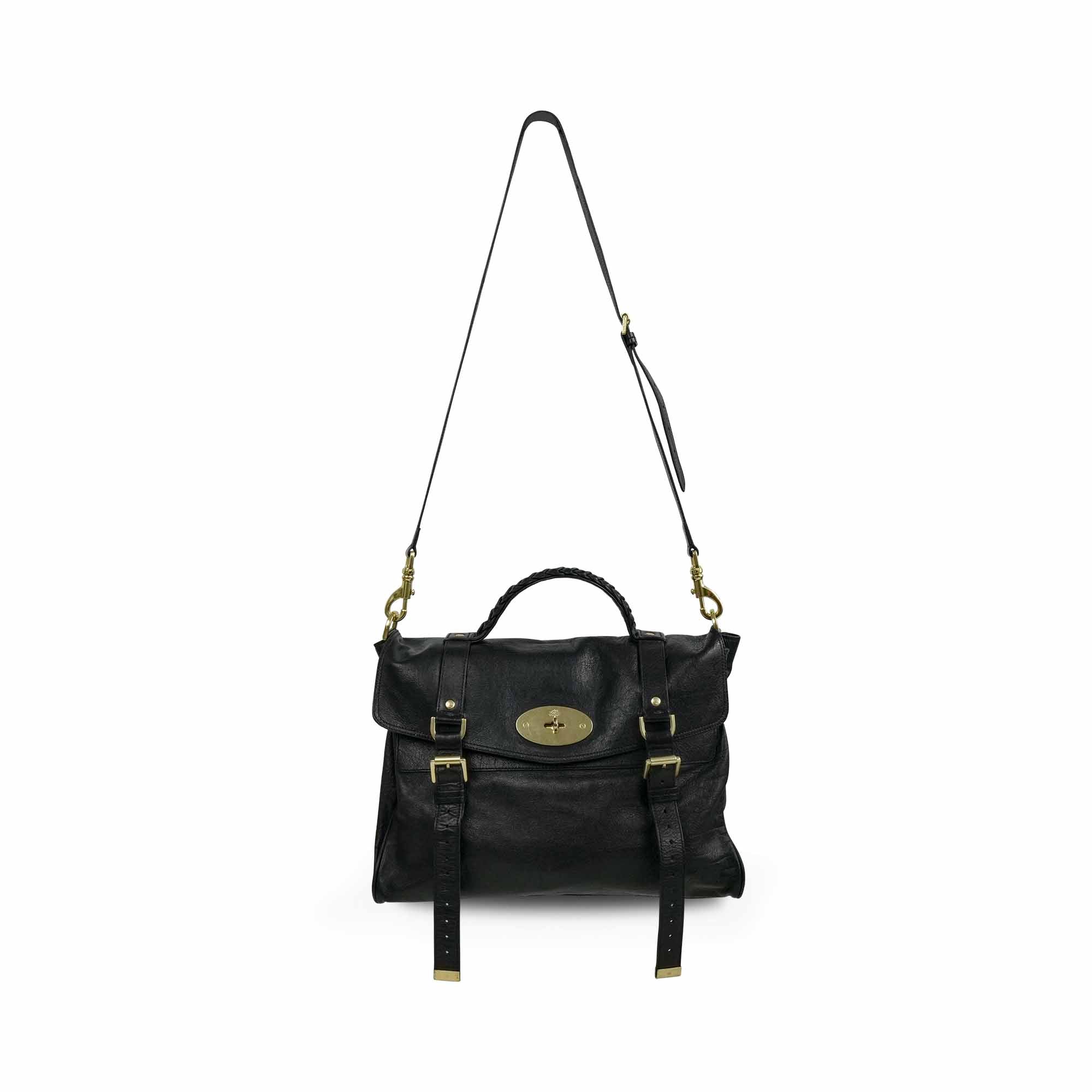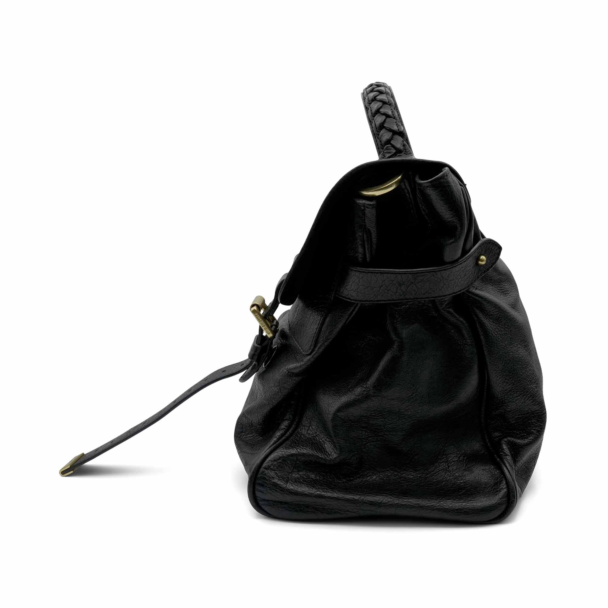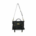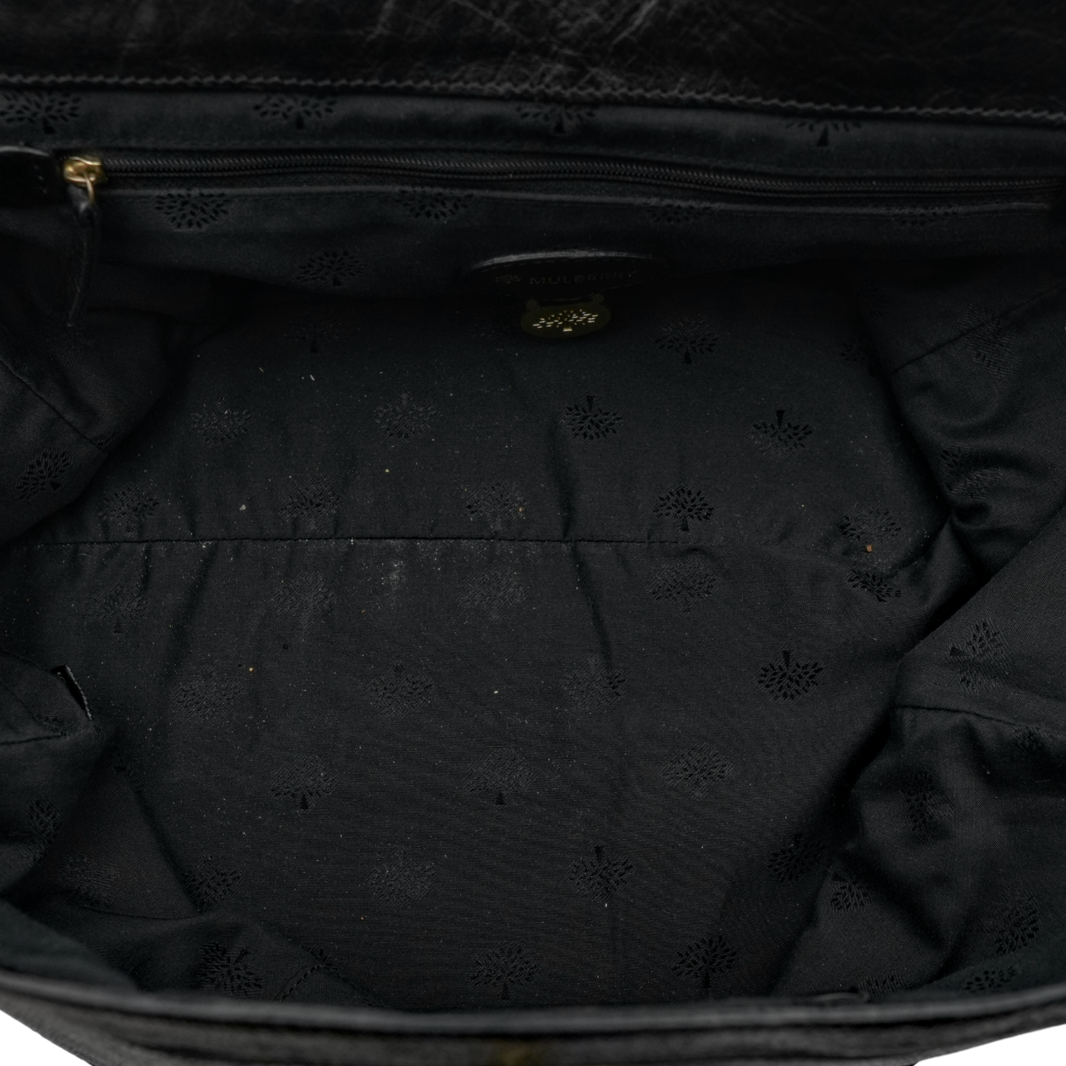 Mulberry 'Bayswater' handbag in black pebbled leather with a braided top handle, an adjustable crossbody strap, a top flap opening, front buckle straps, and a signature turn-lock closure in gold hardware. The bag has a black nylon interior lining with both slip and zip pockets.