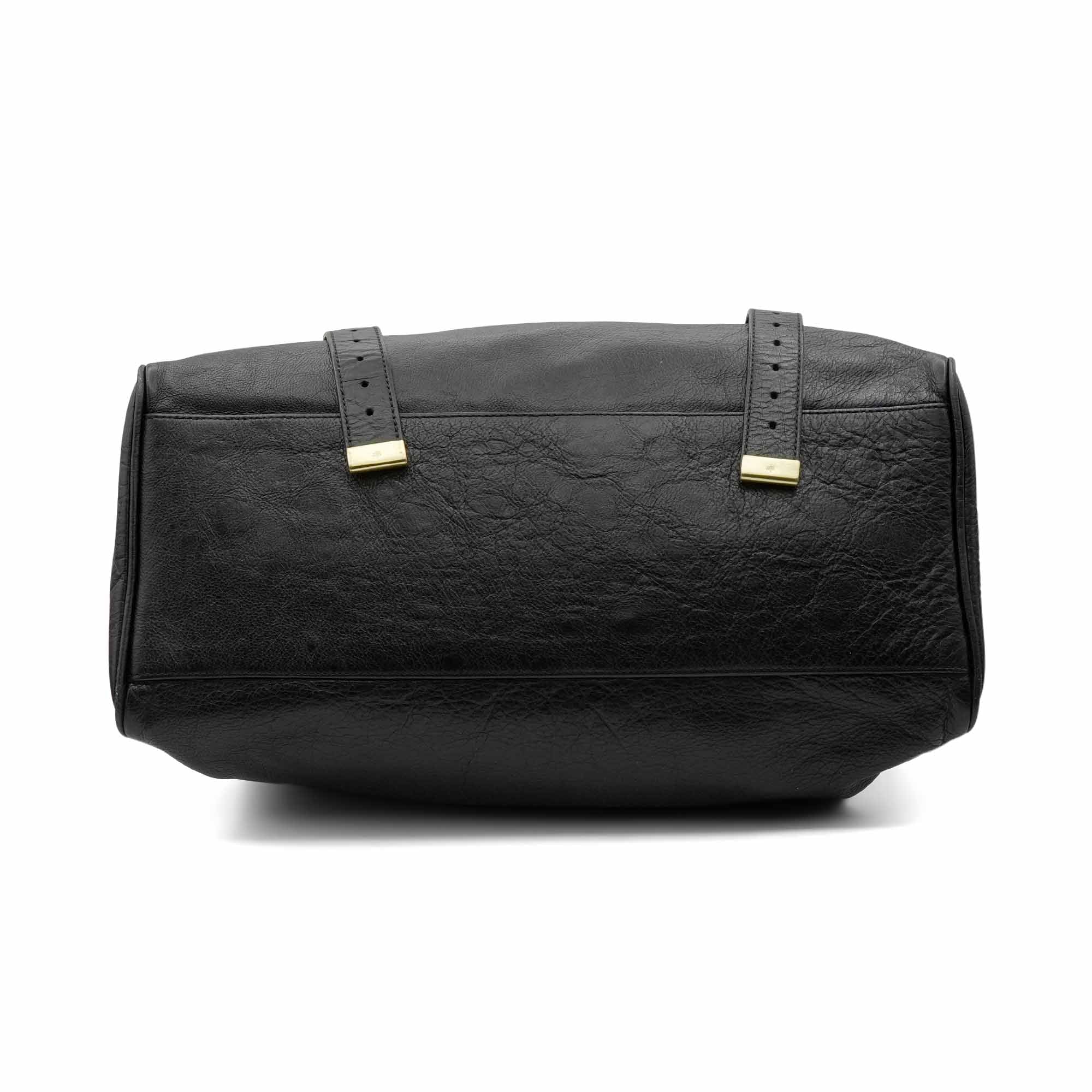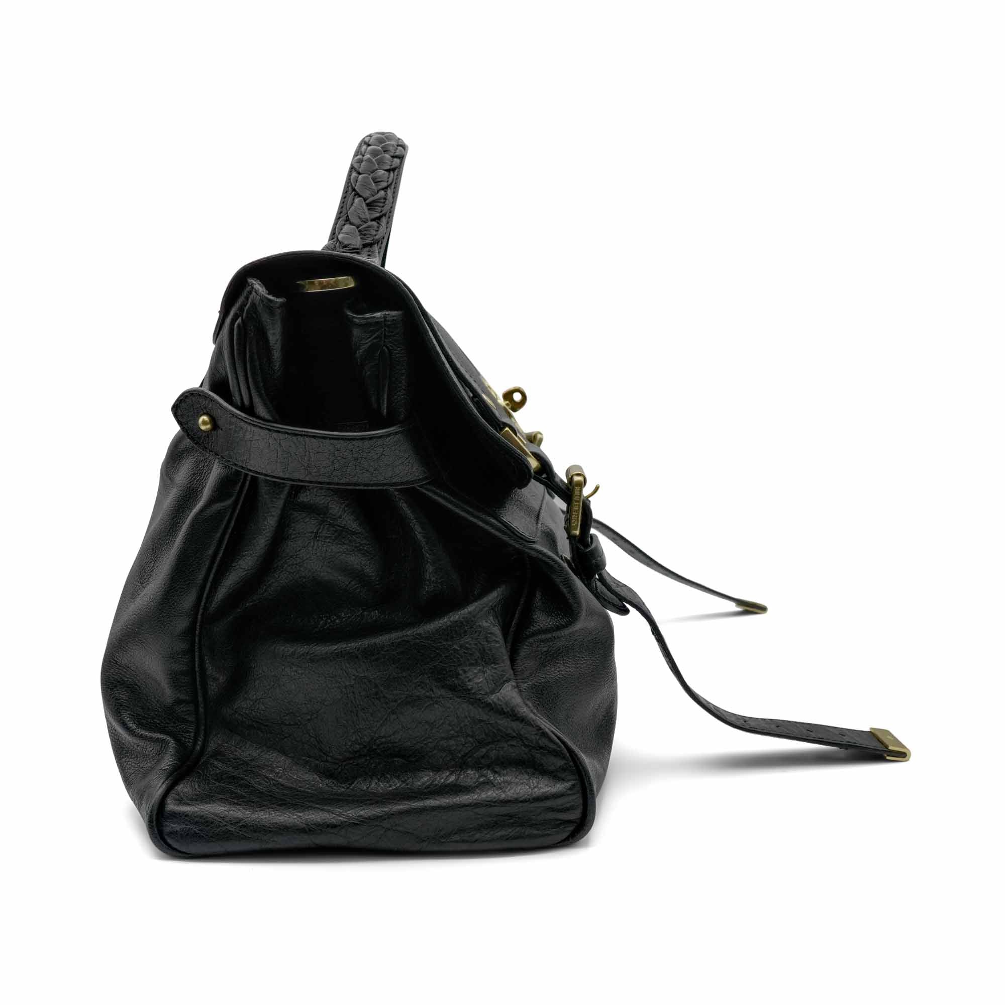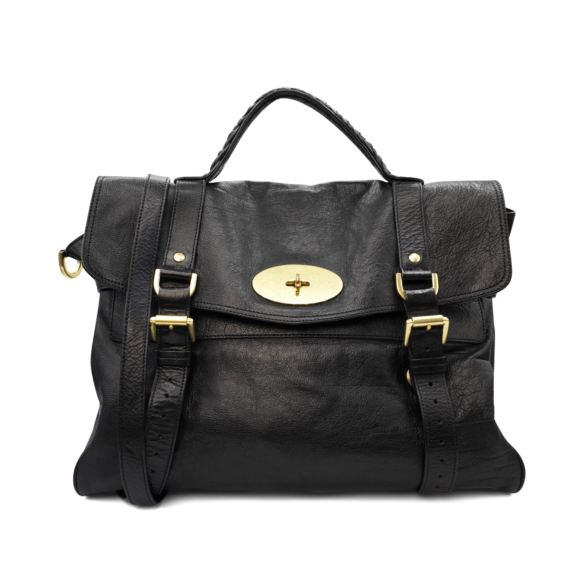 Mulberry 'Bayswater' handbag in black pebbled leather with a braided top handle, an adjustable crossbody strap, a top flap opening, front buckle straps, and a signature turn-lock closure in gold hardware. The bag has a black nylon interior lining with both slip and zip pockets.