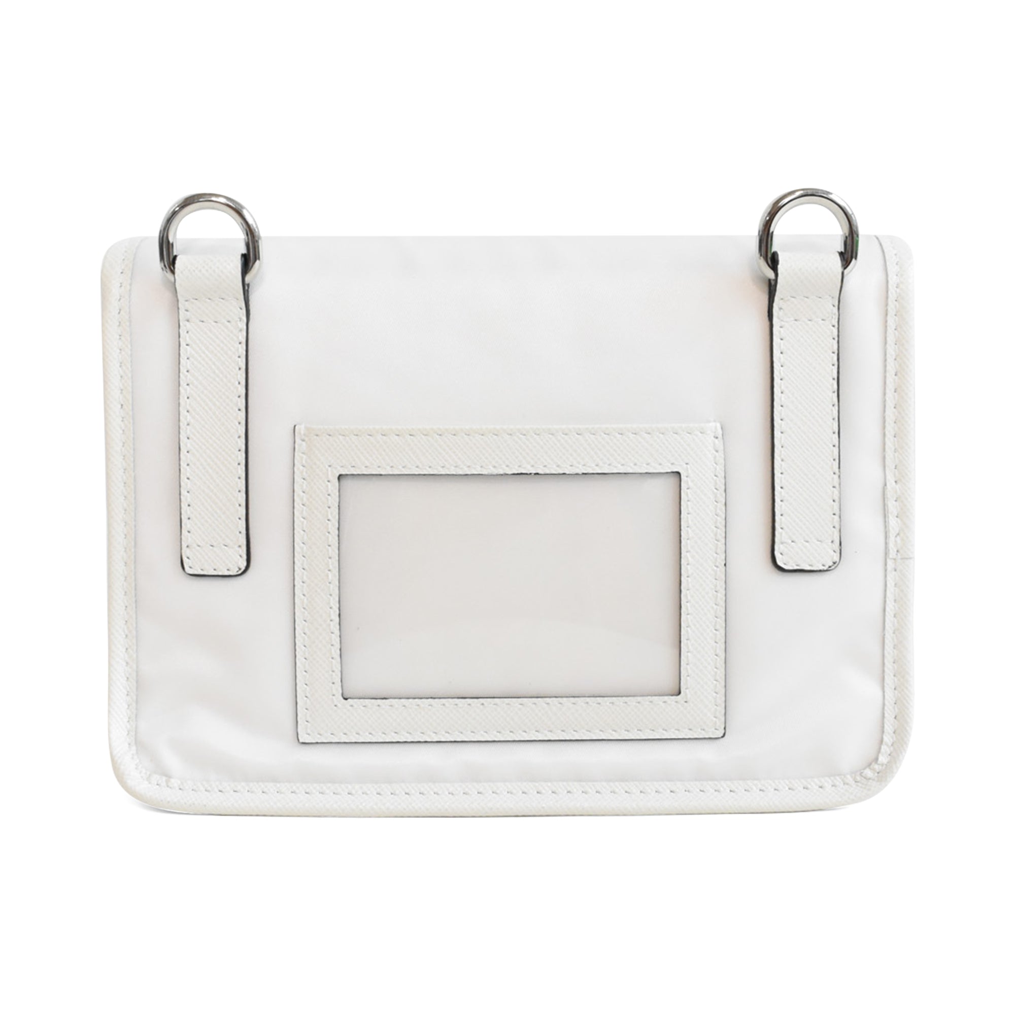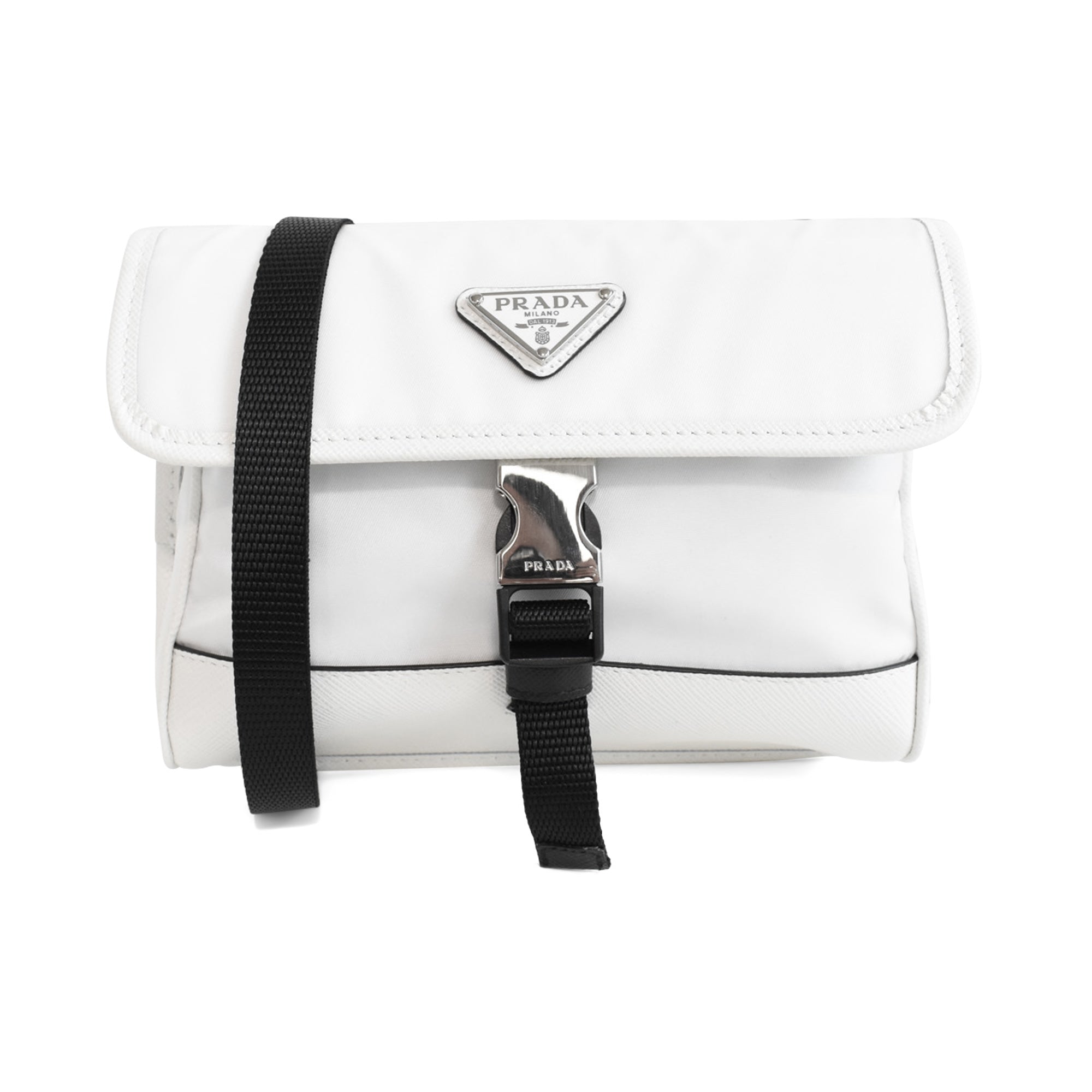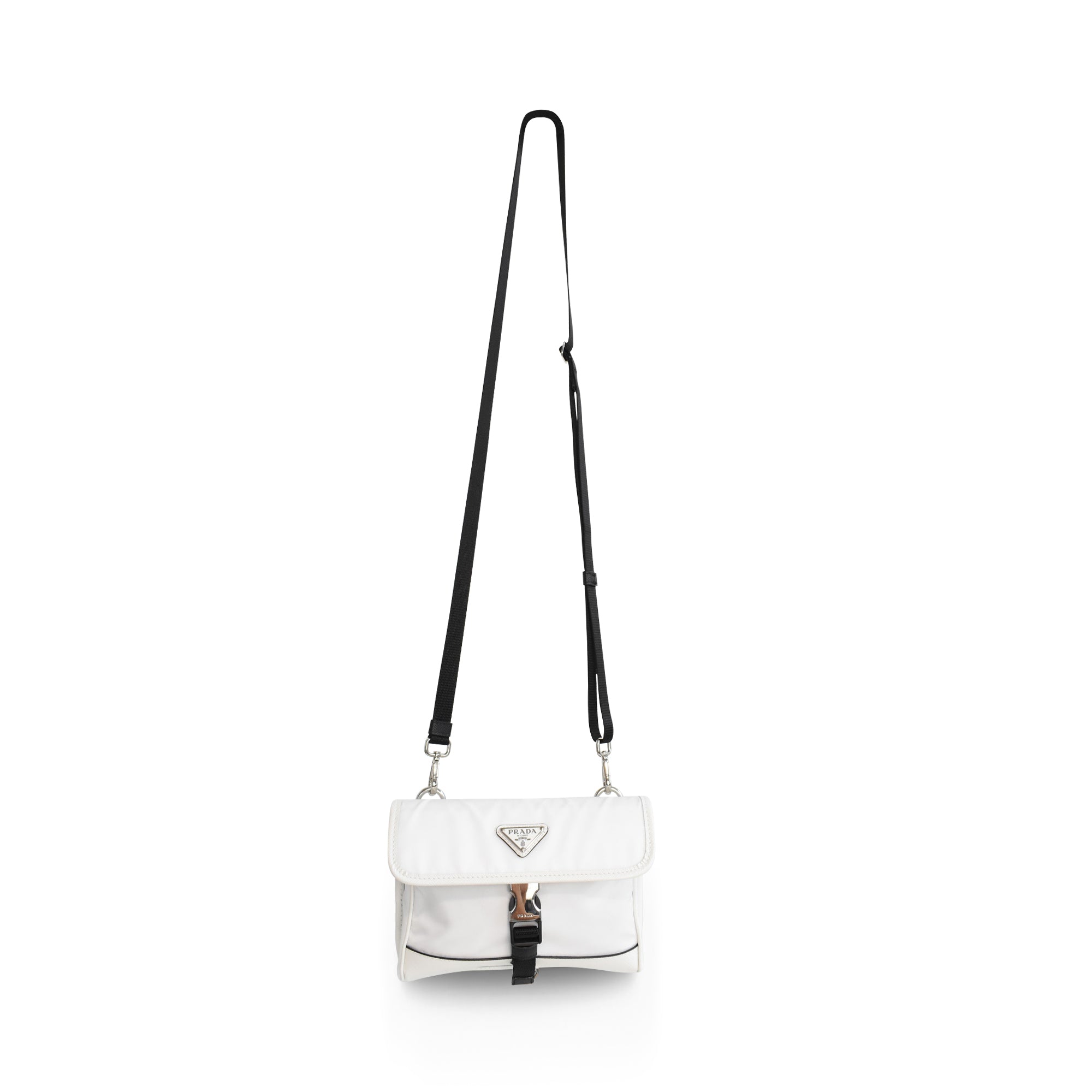Prada small crossbody bag in white Re-Nylon with a saffiano leather trim, a signature triangle logo emblem on the front, a top flap opening with a silver buckle closure, and a removable and adjustable black canvas crossbody strap. The bag is lined with black nylon and has a card slip pocket on both the back of the back and the interior.