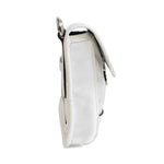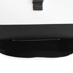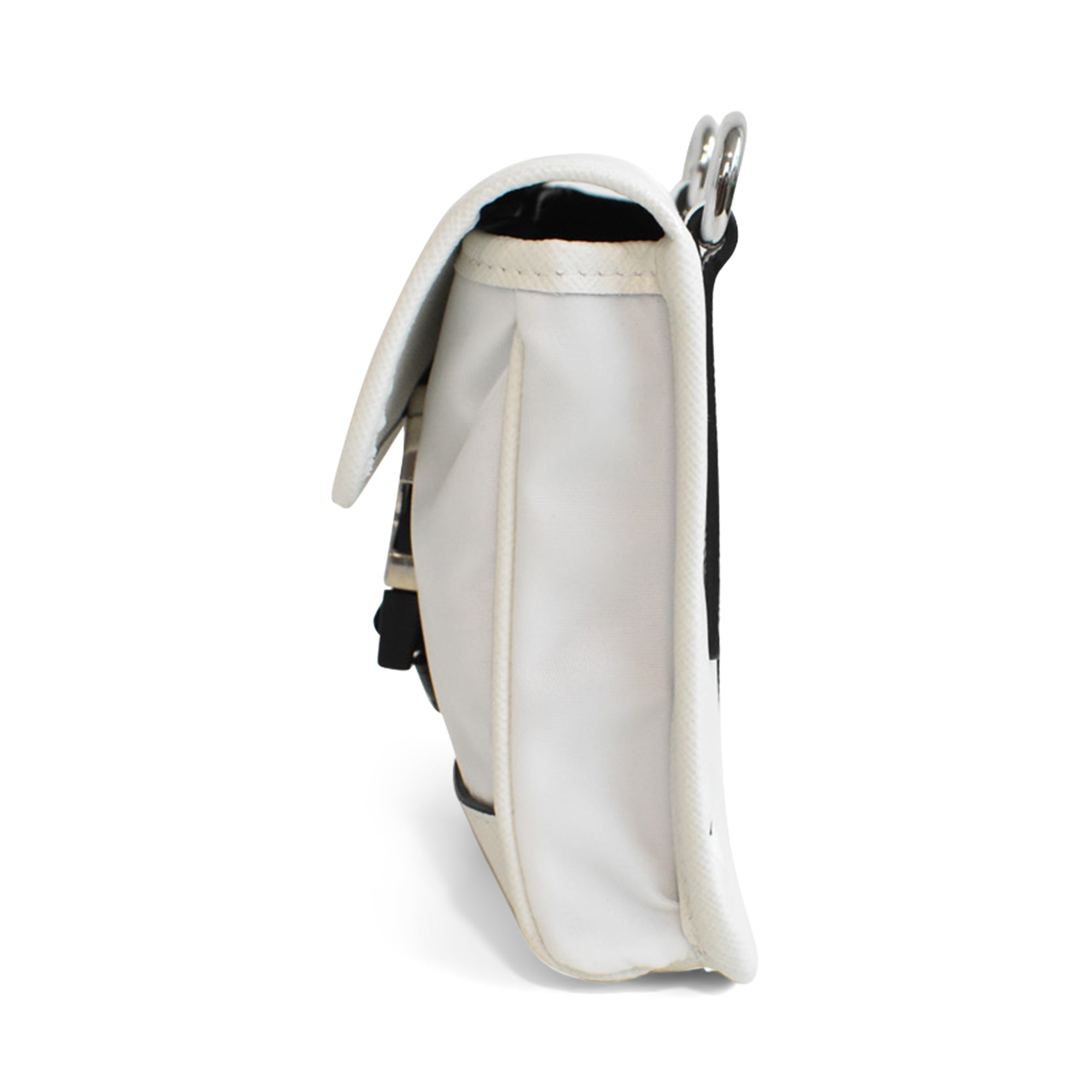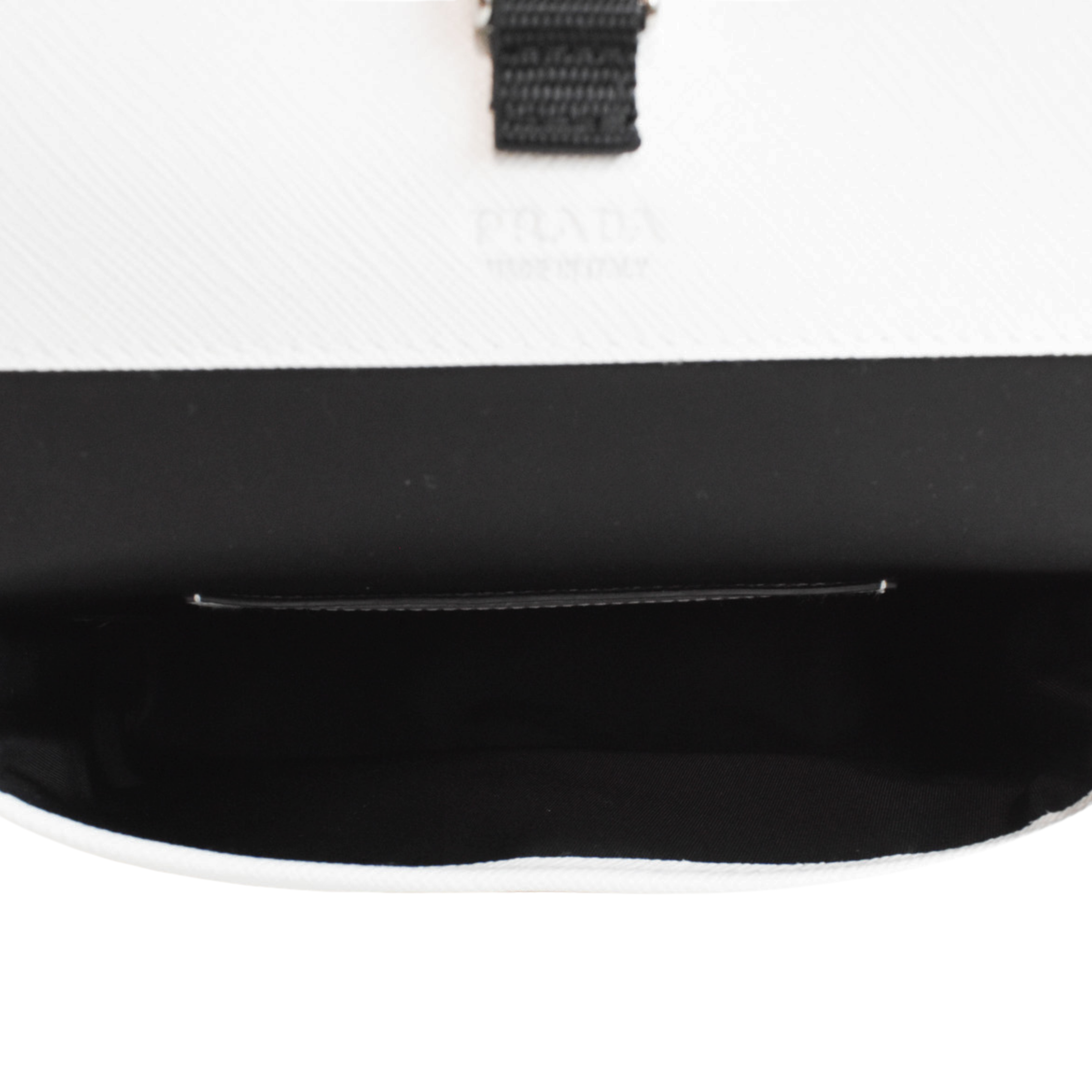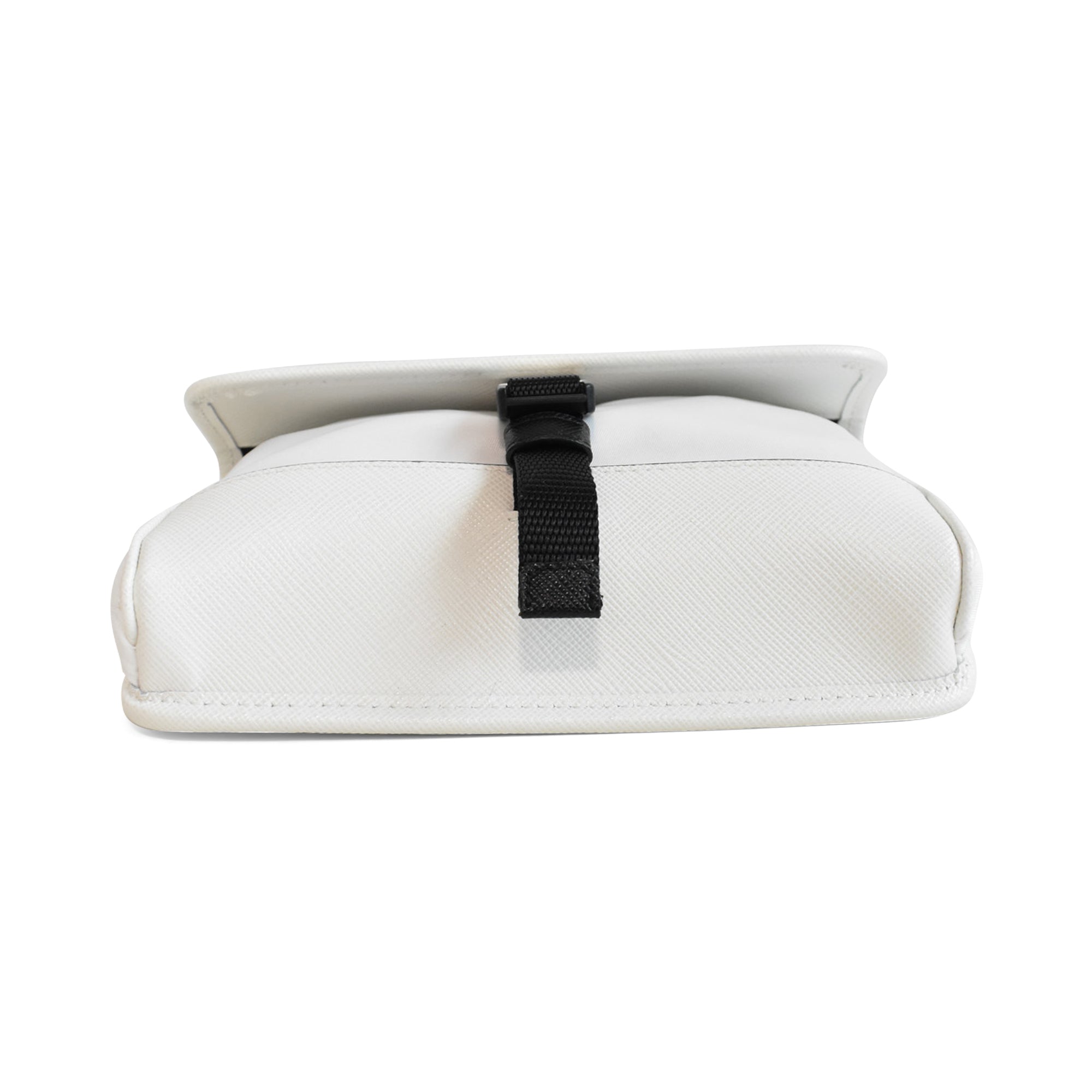 Prada small crossbody bag in white Re-Nylon with a saffiano leather trim, a signature triangle logo emblem on the front, a top flap opening with a silver buckle closure, and a removable and adjustable black canvas crossbody strap. The bag is lined with black nylon and has a card slip pocket on both the back of the back and the interior.